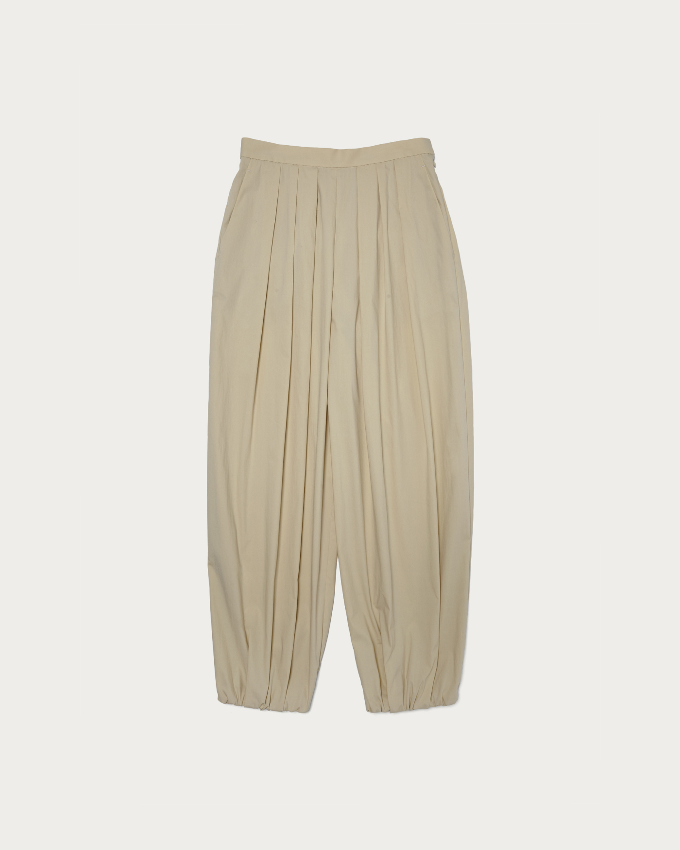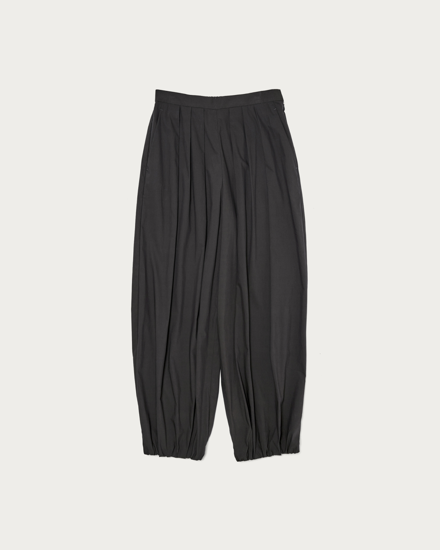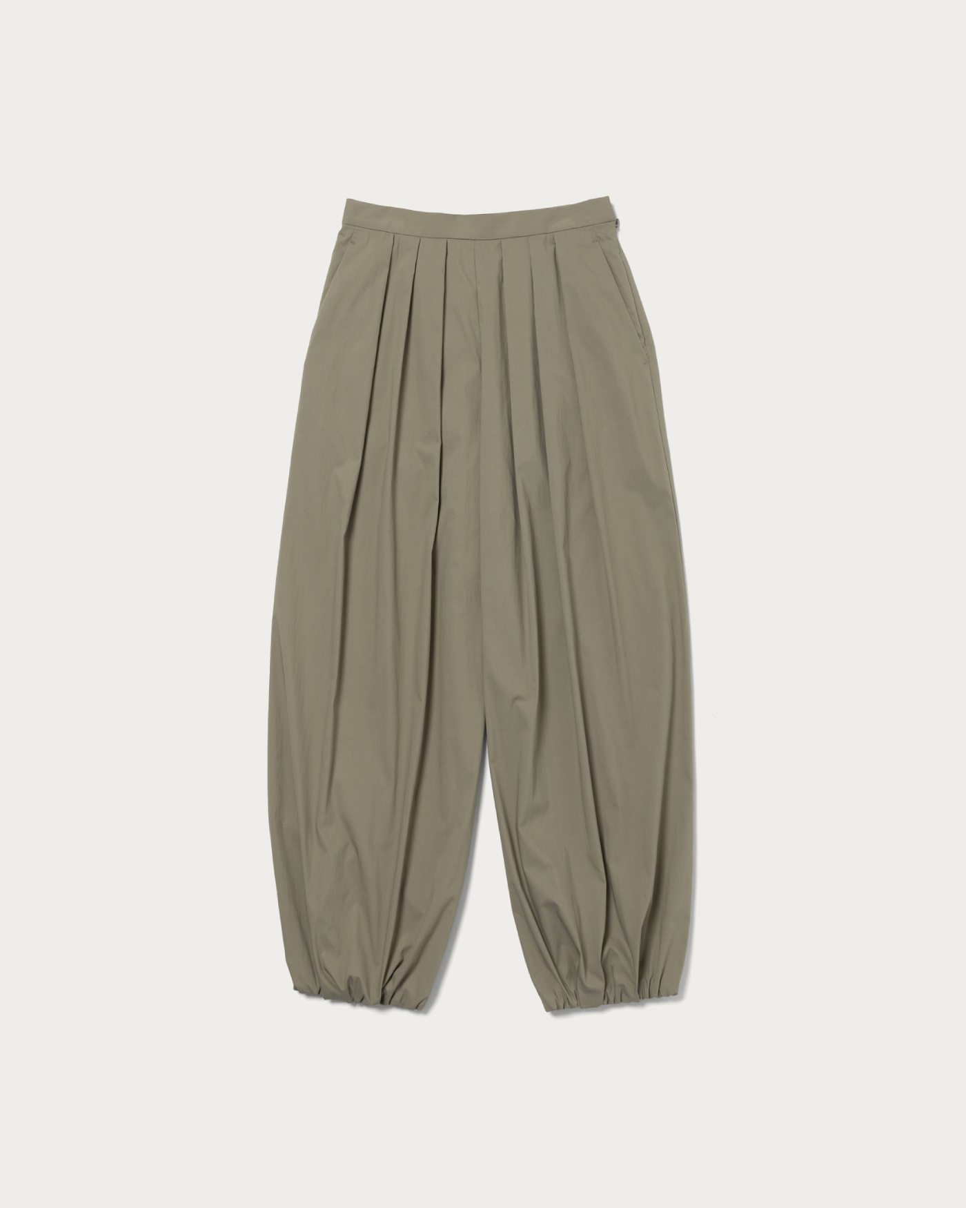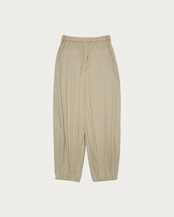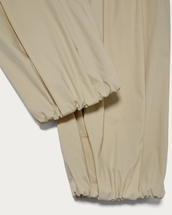 裾に向かってすぼまった、たっぷりとしたボリュームのバルーン型パンツ。ハリがあり、軽くて柔らかい薄地のコットンナイロンを使用することで、軽さがありながら存在感のあるシルエットに仕上げました。バックゴム仕様で着心地も抜群。裏地がないため、さらりと軽快にお楽しみいただけます。
