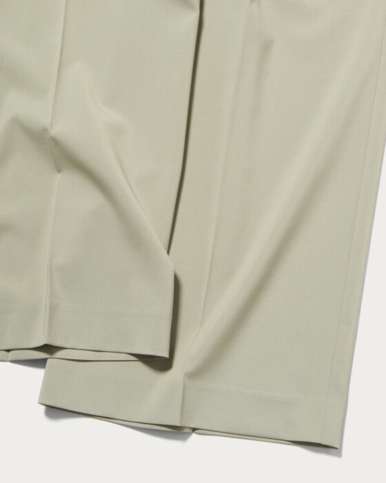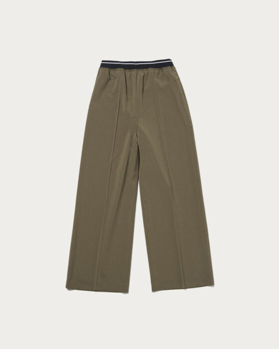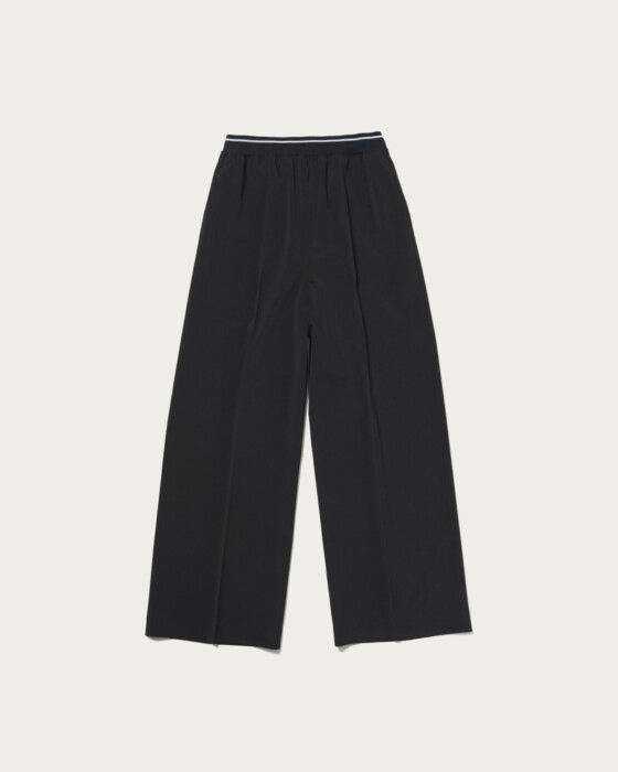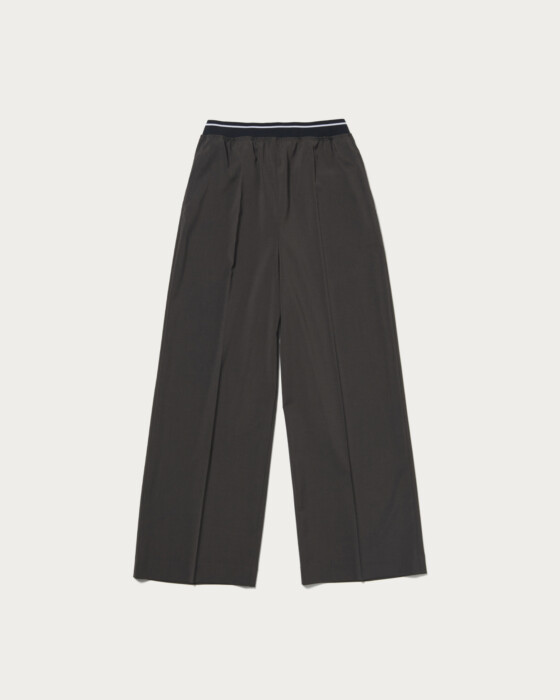 ウエストゴムのラインデザインが目をひくワイドパンツ。シャリ感のあるドライタッチな質感が特徴のポリウレタンブレンド素材で、軽さと履き心地の良さでロングシーズン着用可能な涼やかな風合いが魅力です。ご自宅で手洗いができるため、デイリーに活躍します。