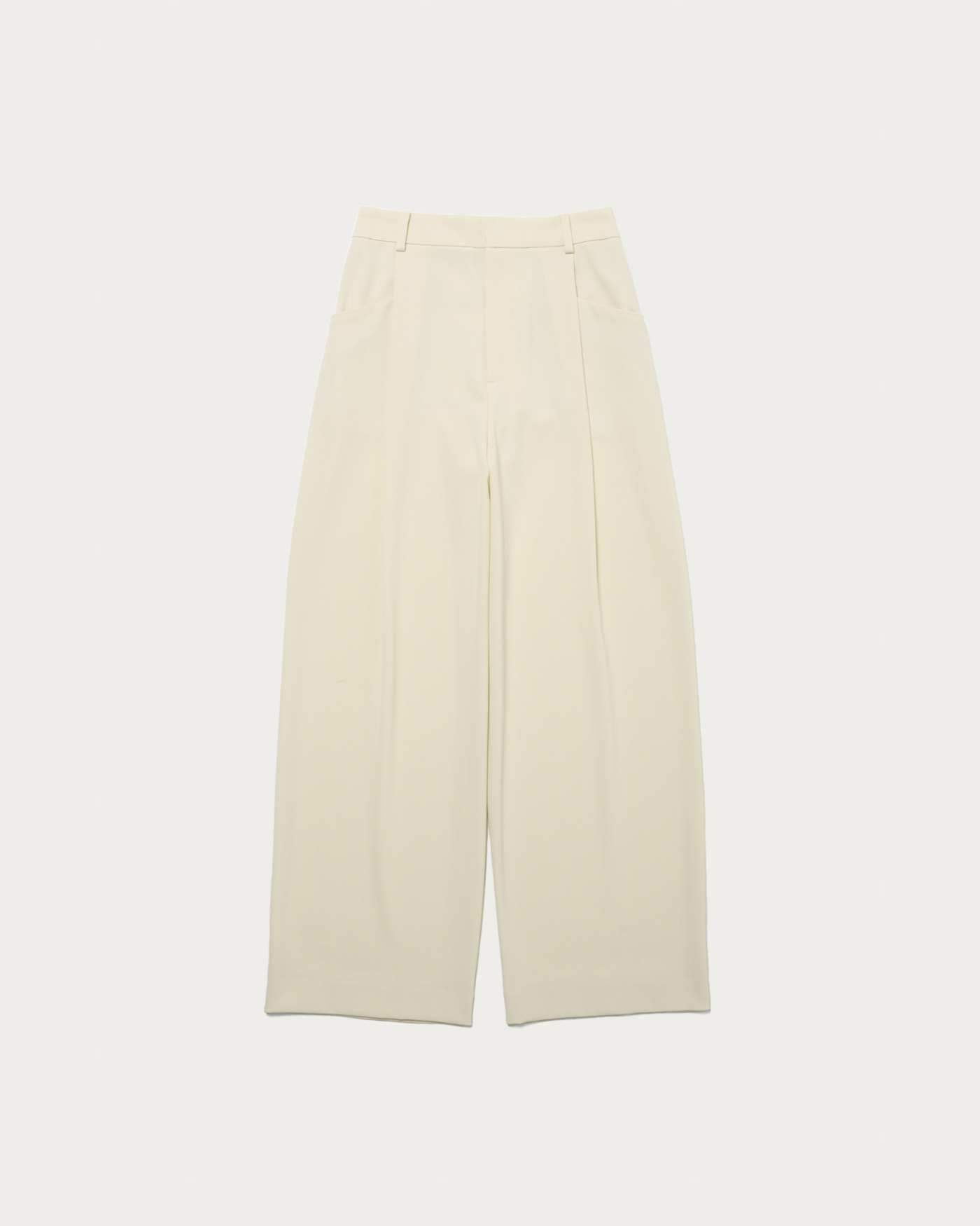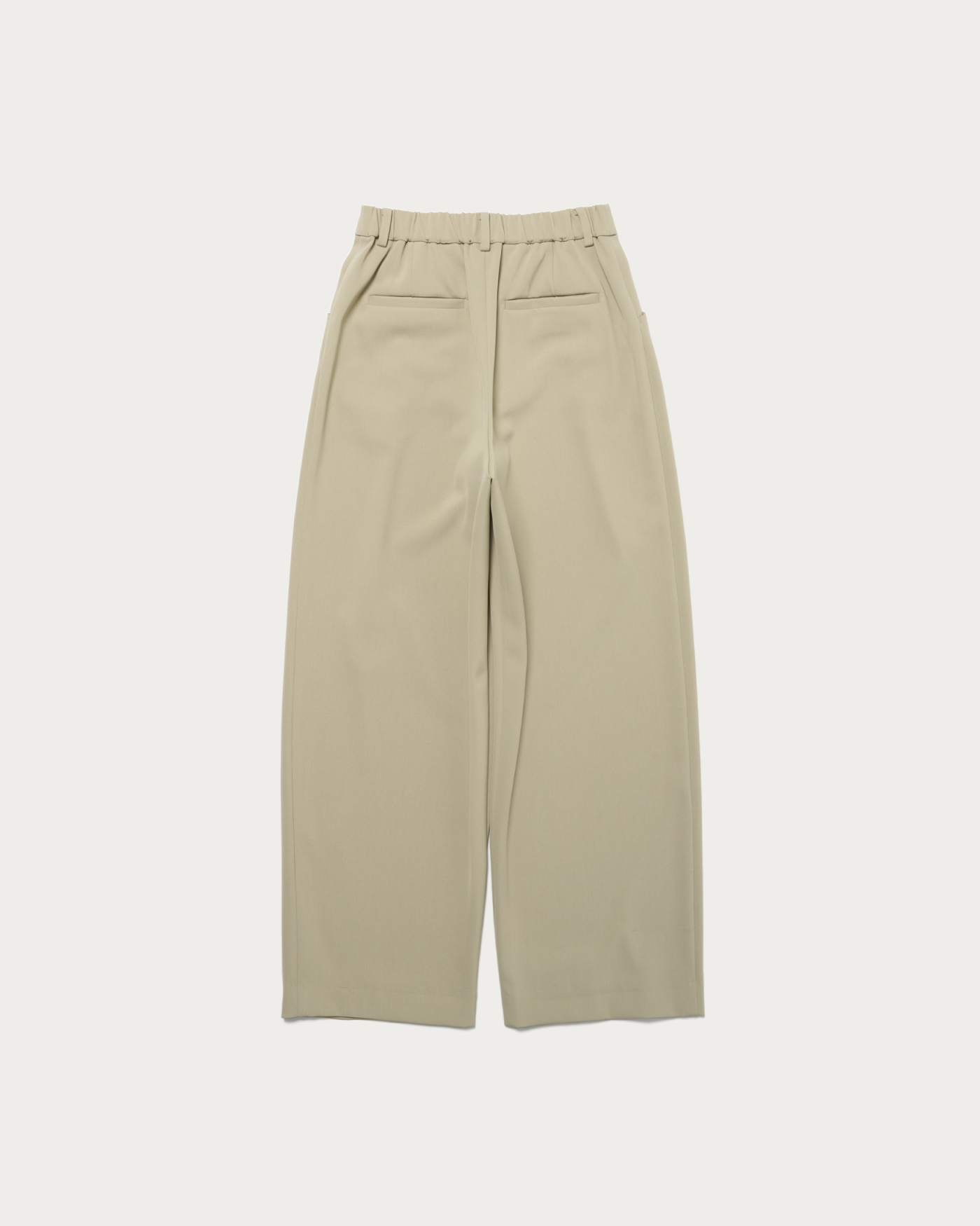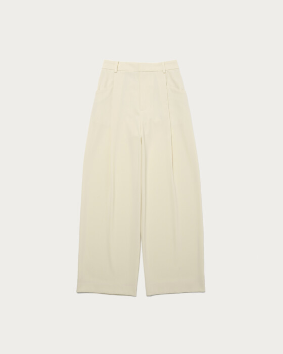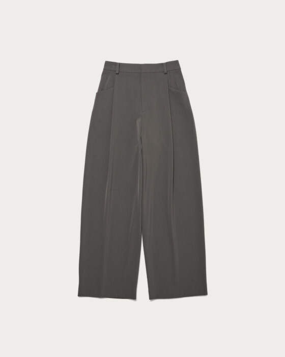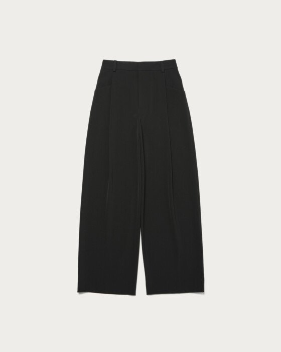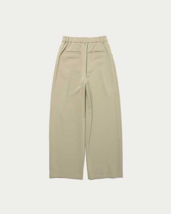 適度な緩やかさですっきりとしたシルエットのワイドパンツ。フロントタックのポケットのディテールでアクセントをプラス。シャリ味とドライ感、そしてすっきりと見える落ち感が特徴。後ろがゴム仕様になっているため、履き心地も抜群です。