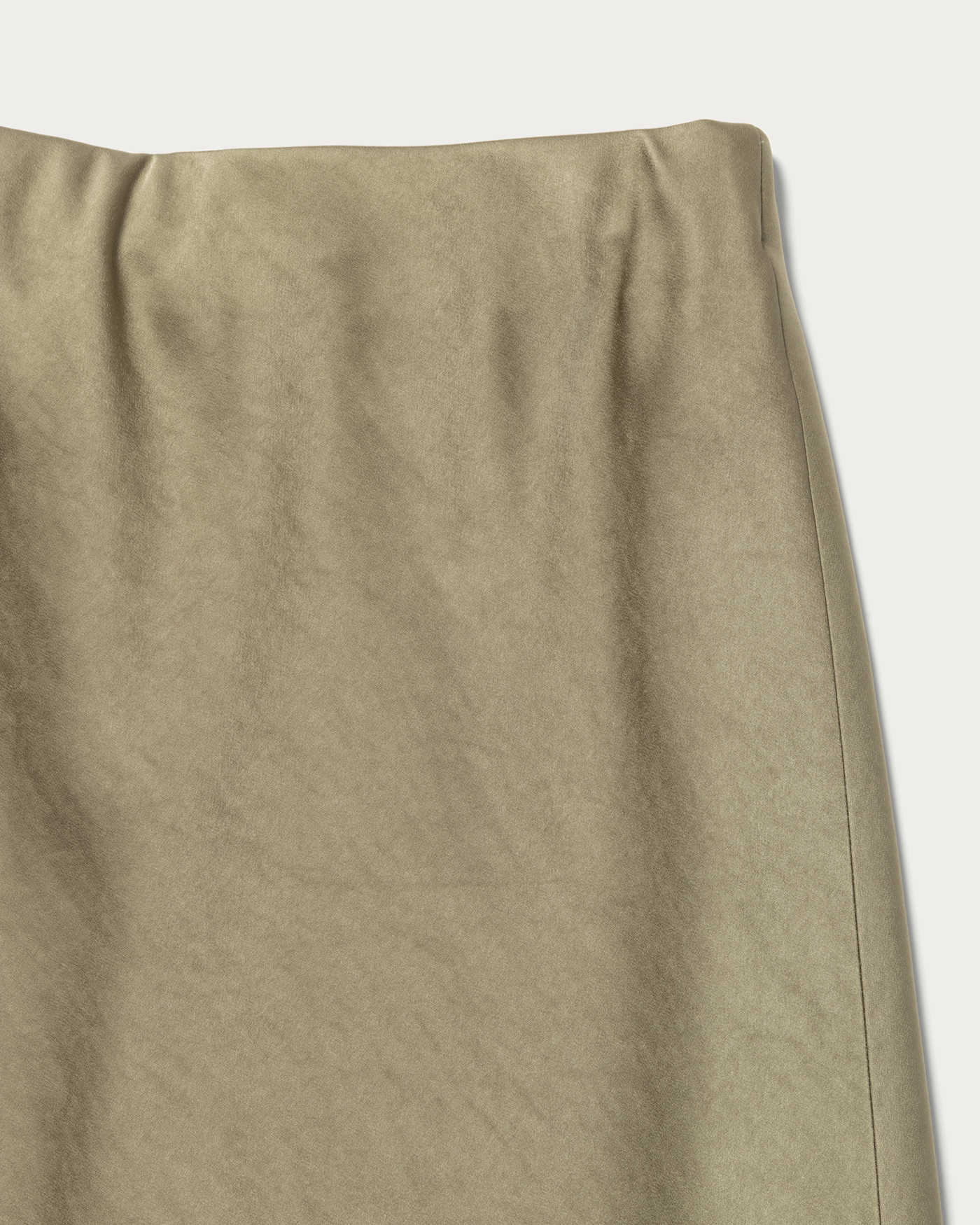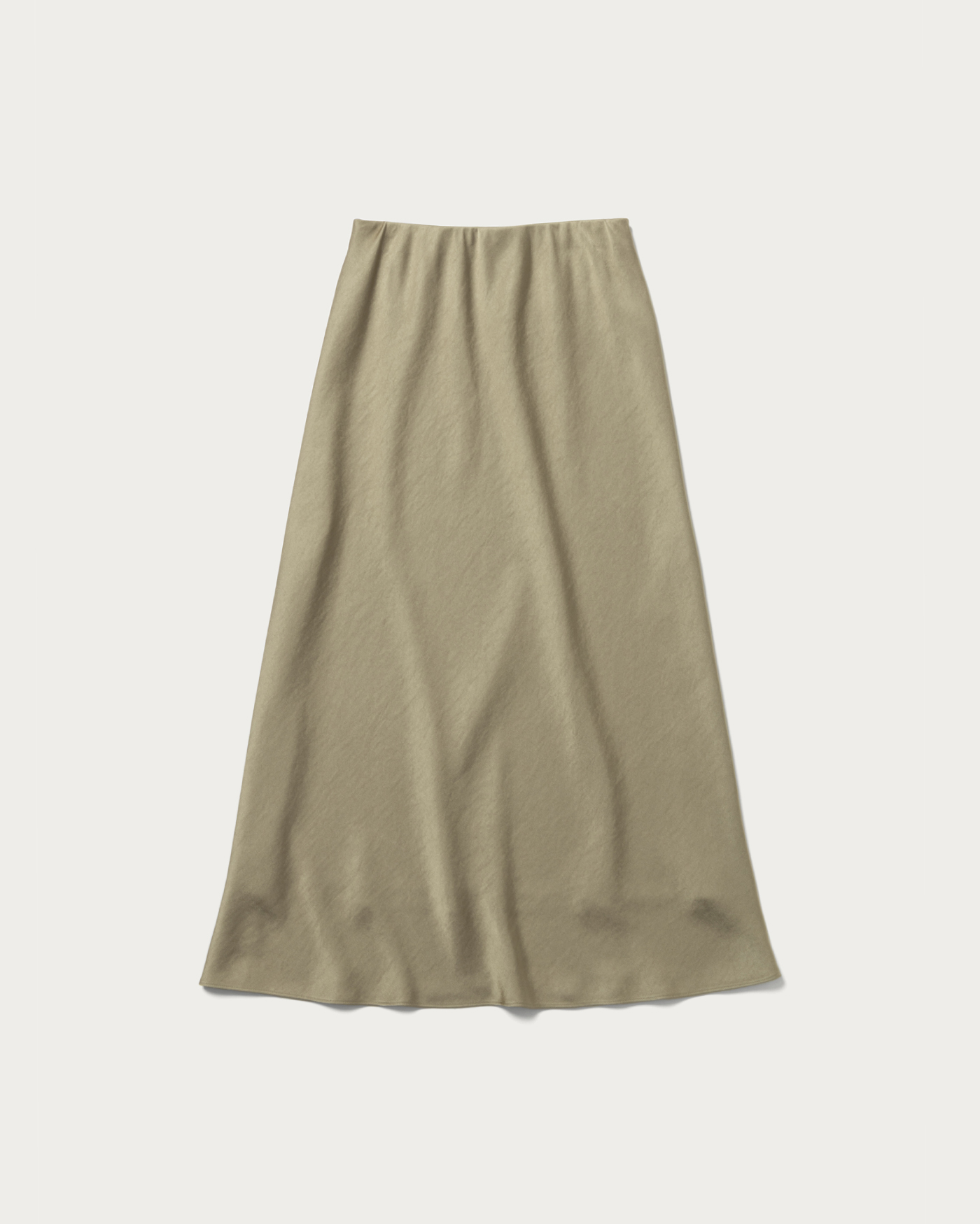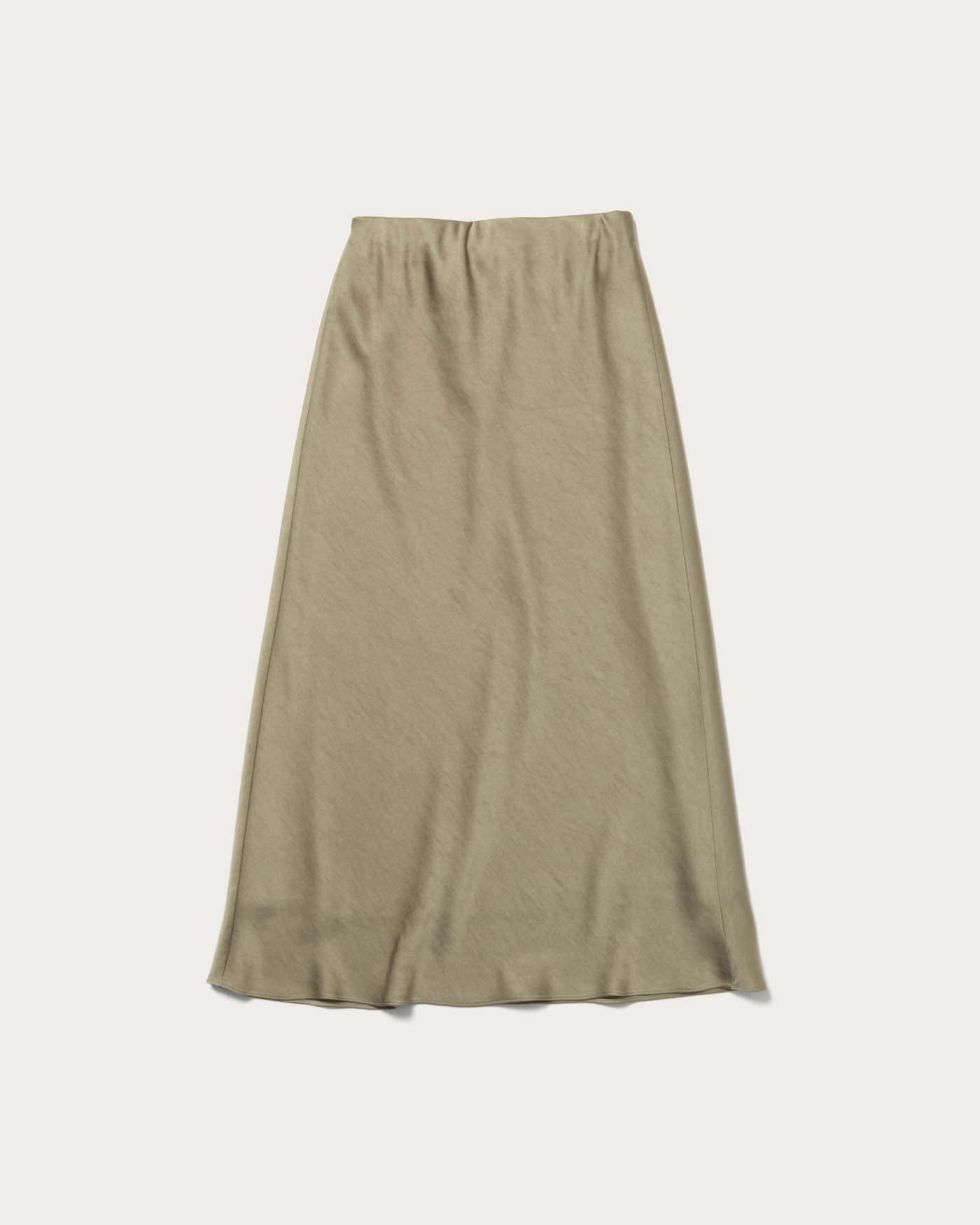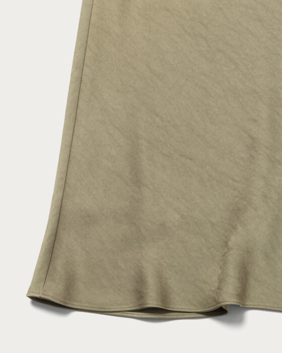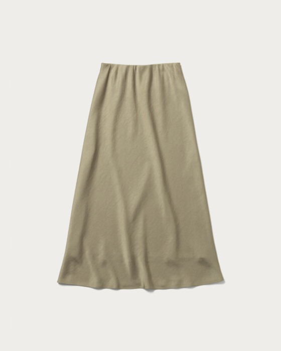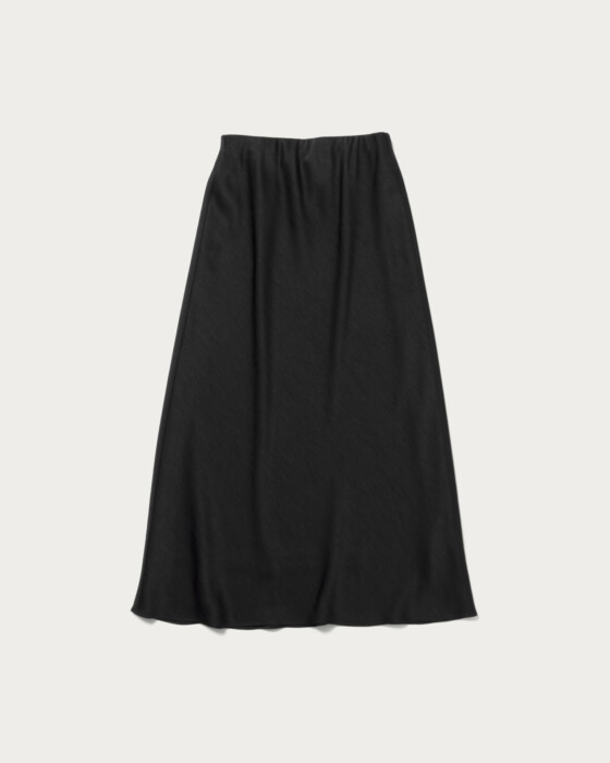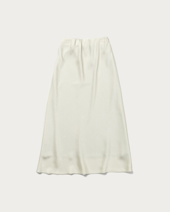肉厚のサテン生地を使用しバイヤス使いのフレアシルエットスカート。体に沿いつつ裾に広がるマーメイドシルエットが特徴。ウエストがすっきり見えるよう、見返し側にゴムを挟み込んでお作りしました。