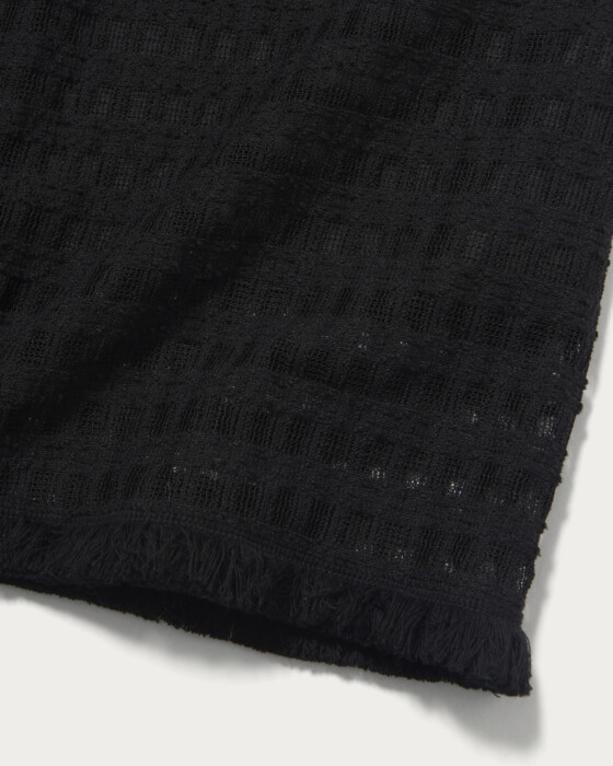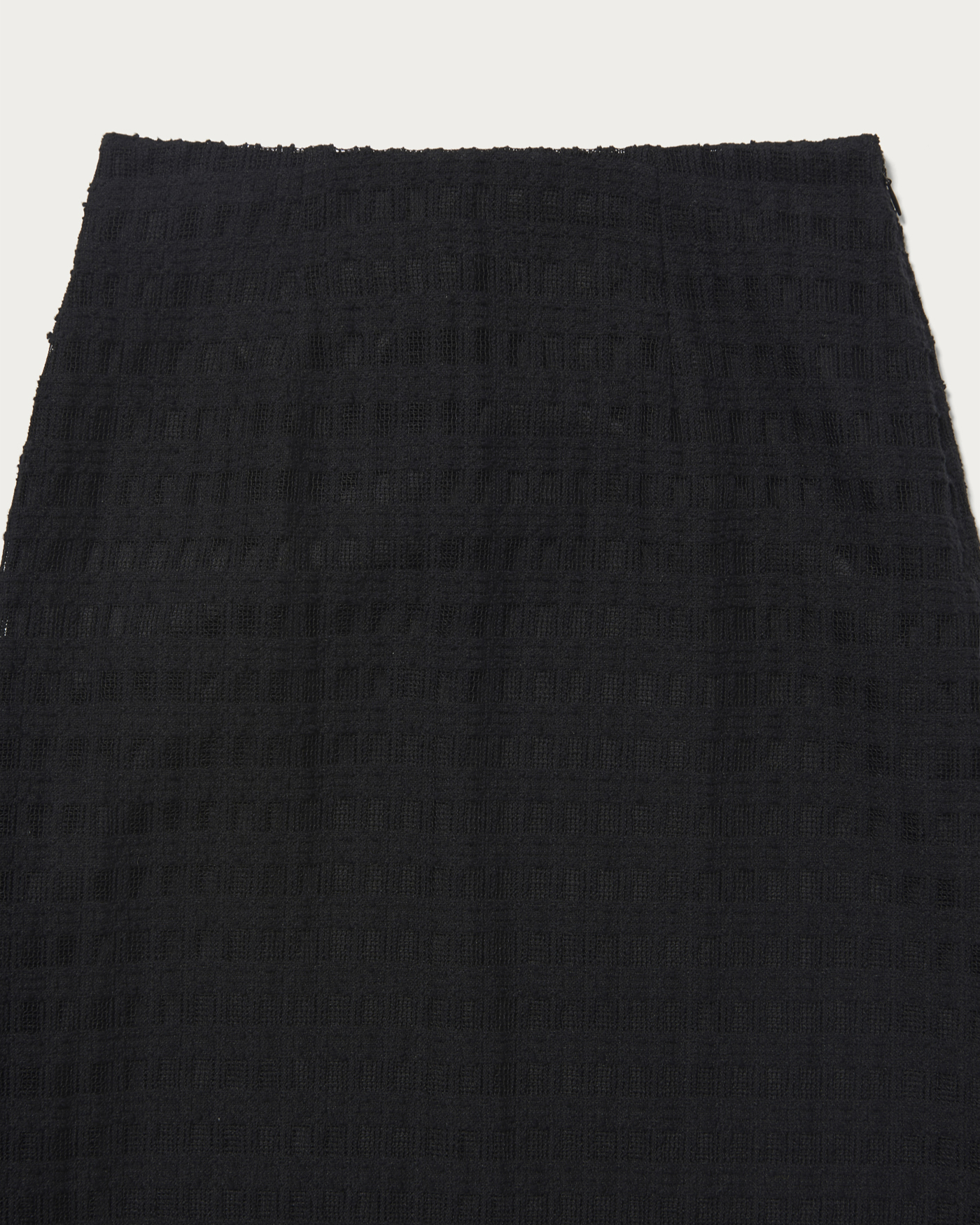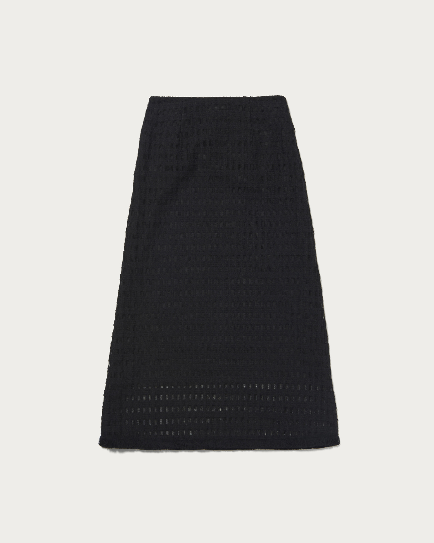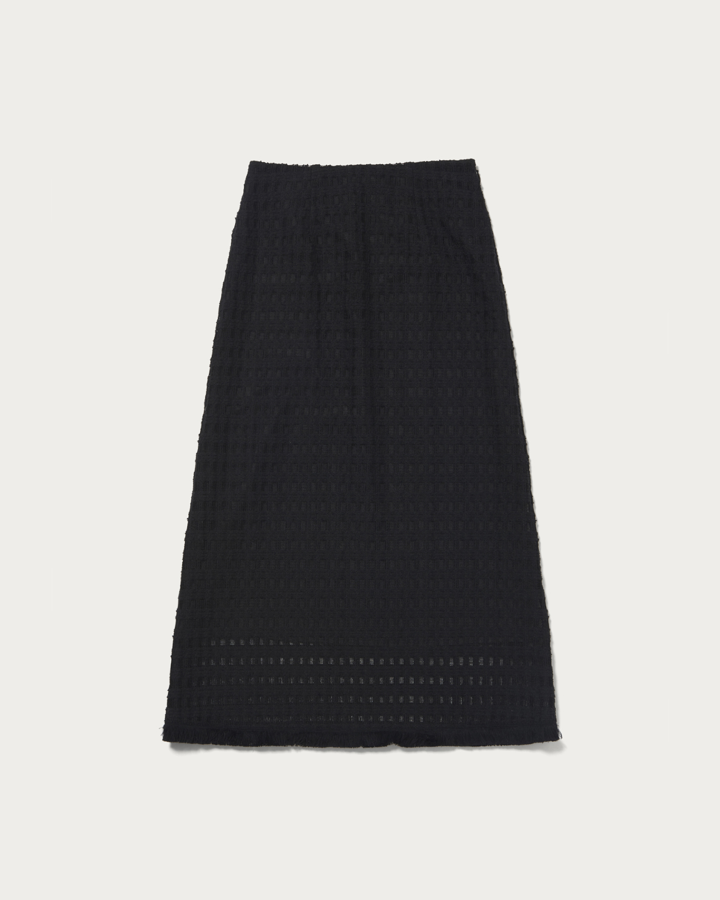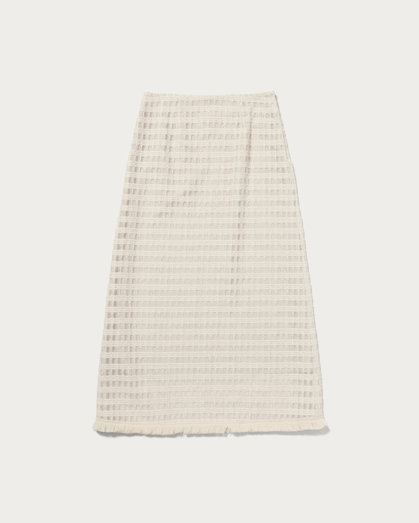 コットンポリエステルのクラフト感のあるレースを使用したAラインスカート。素材そのものの表情と、裾にあしらったフリンジがポイントです。格子柄で甘くなりすぎず、スタイリングにアクセントをプラスしてくれます。
