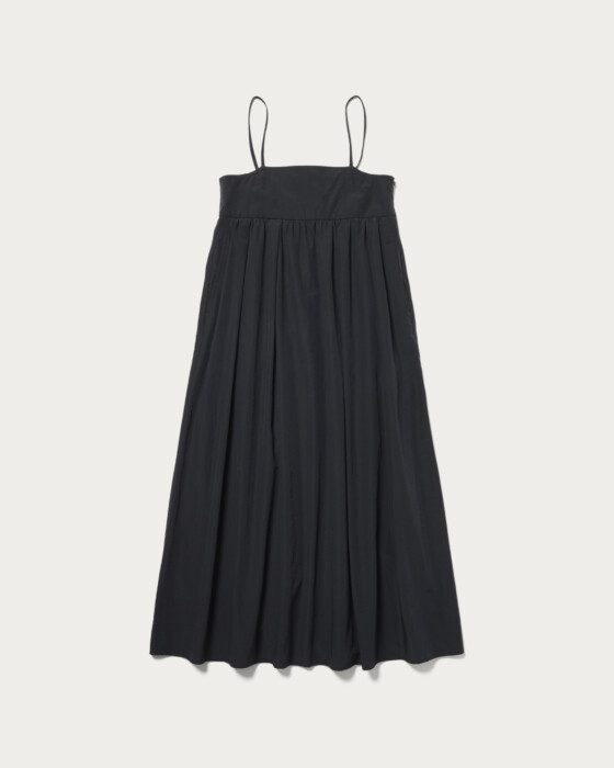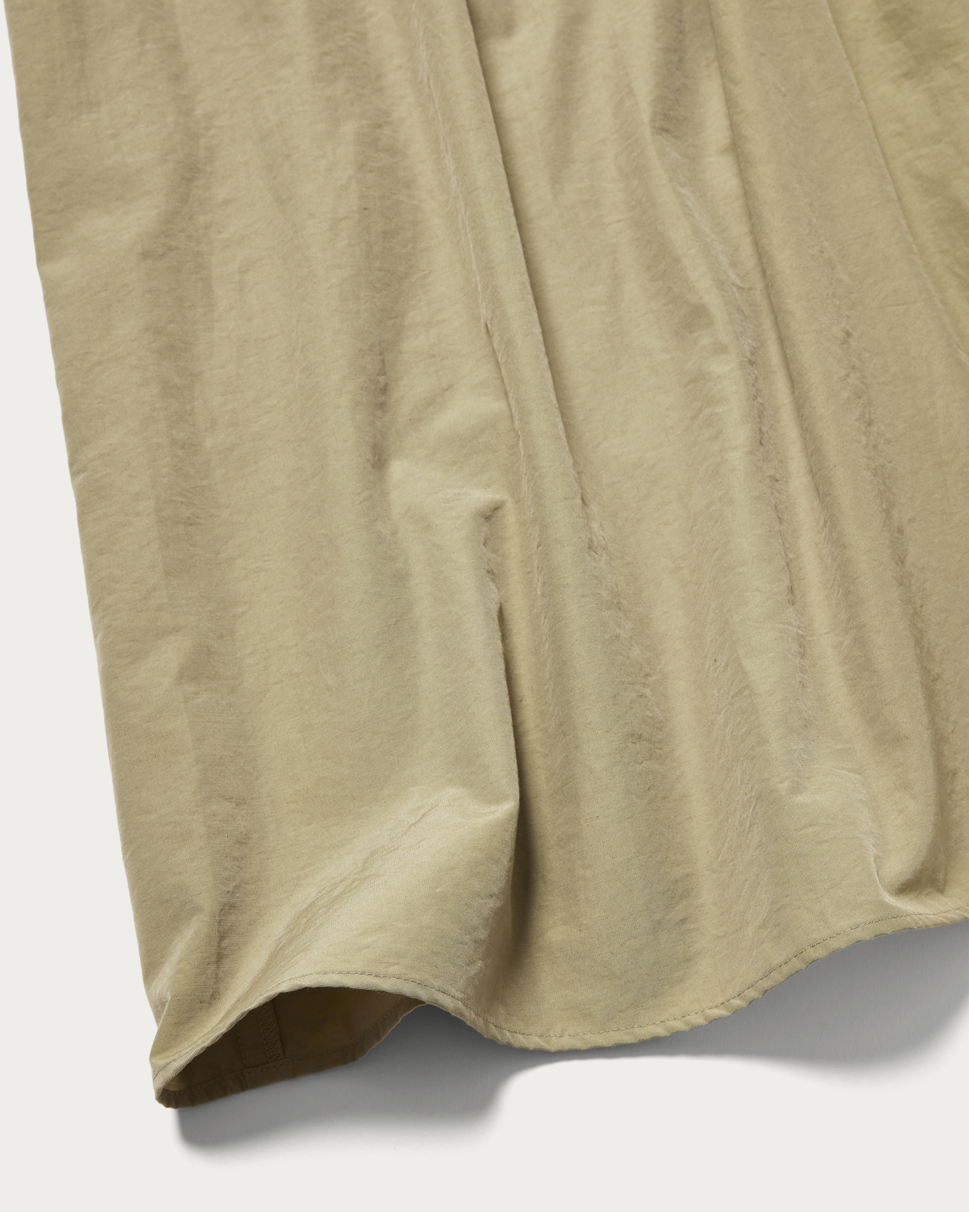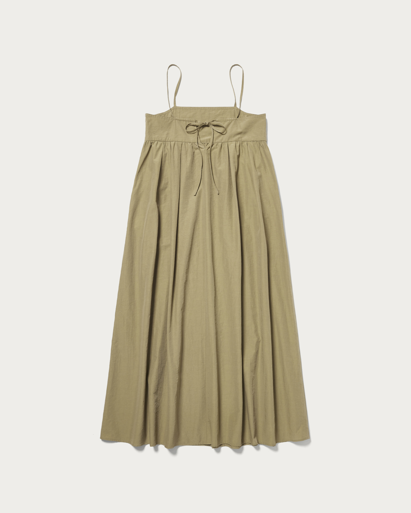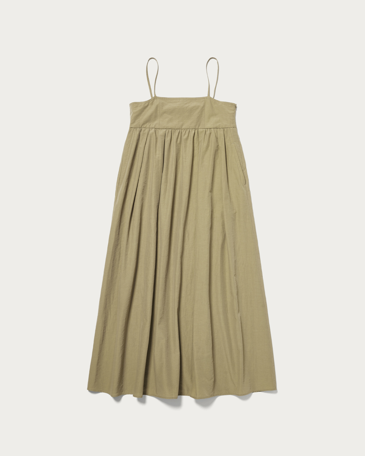ドライタッチなナイロンにコットンを合わせたシンプルなワンピースをお作りました。タンブラー加工を入れた適度なハリとシボ感が特徴で、程よい肉感のため、長いシーズン重宝する一着です。