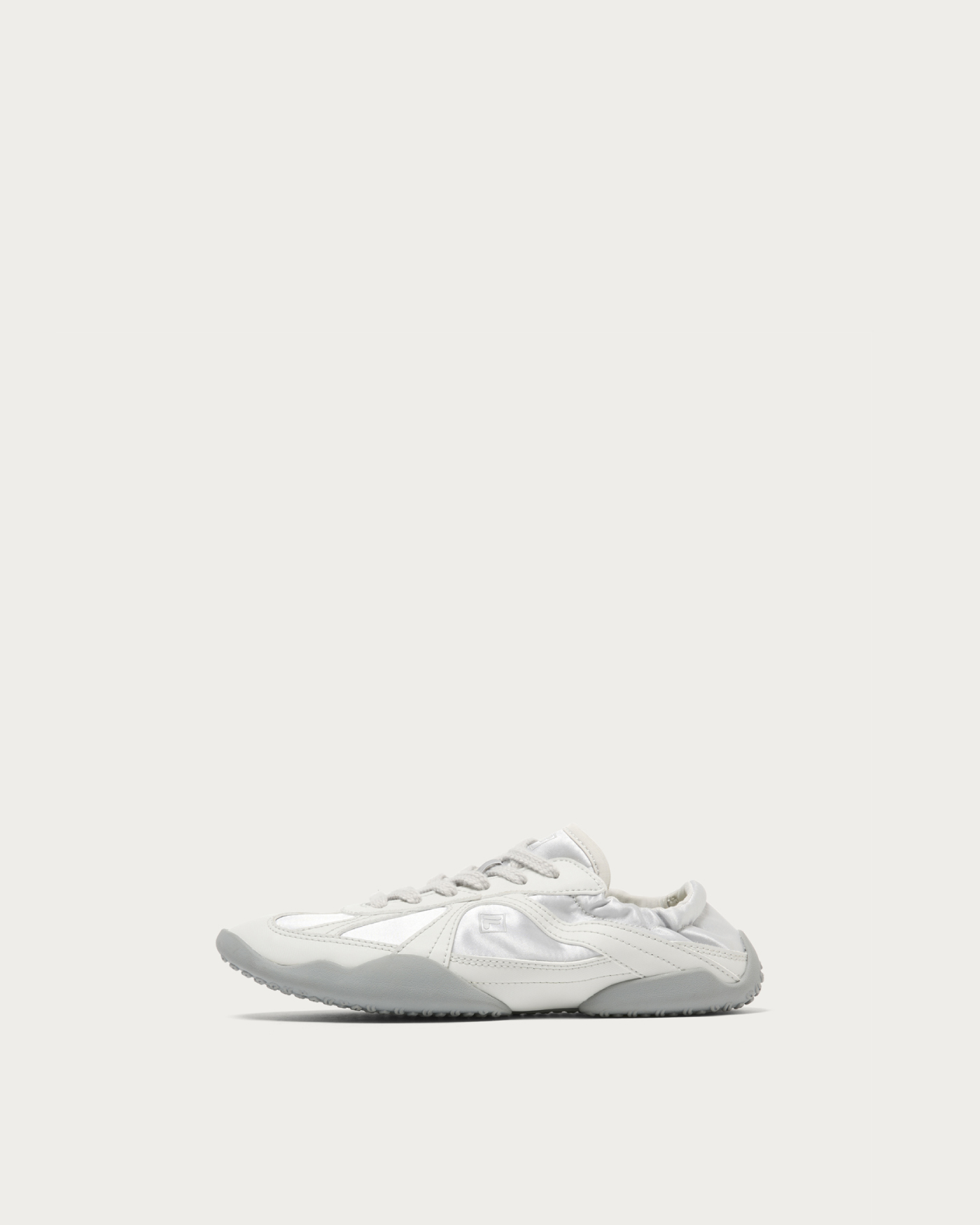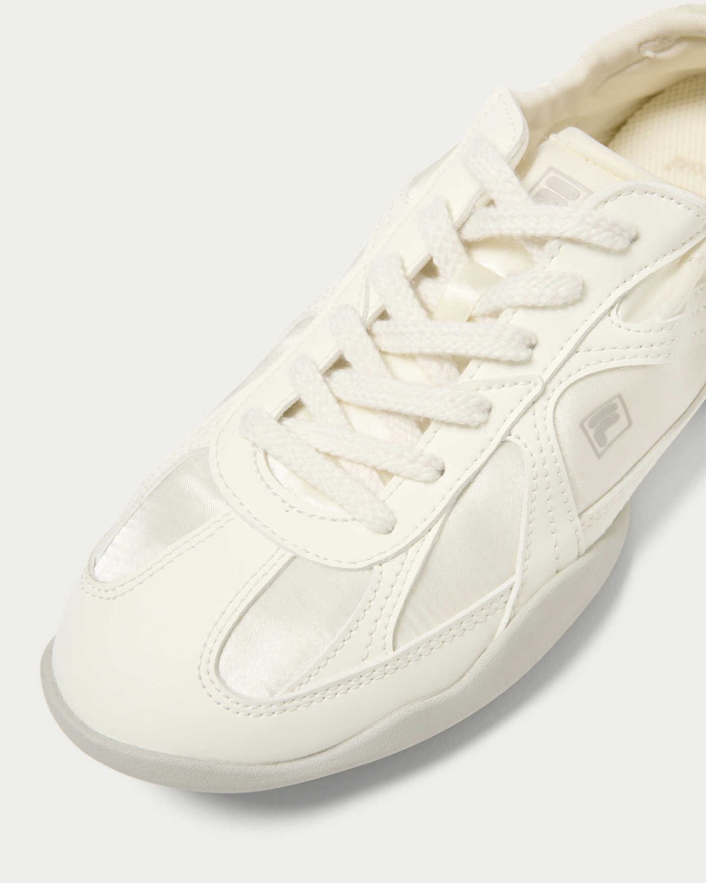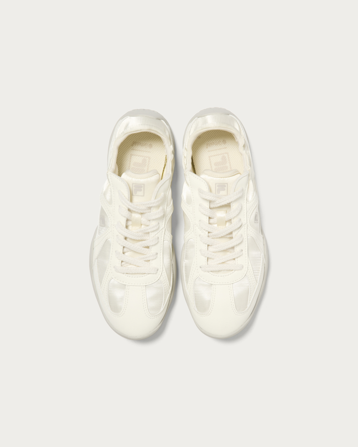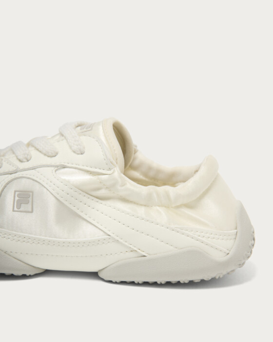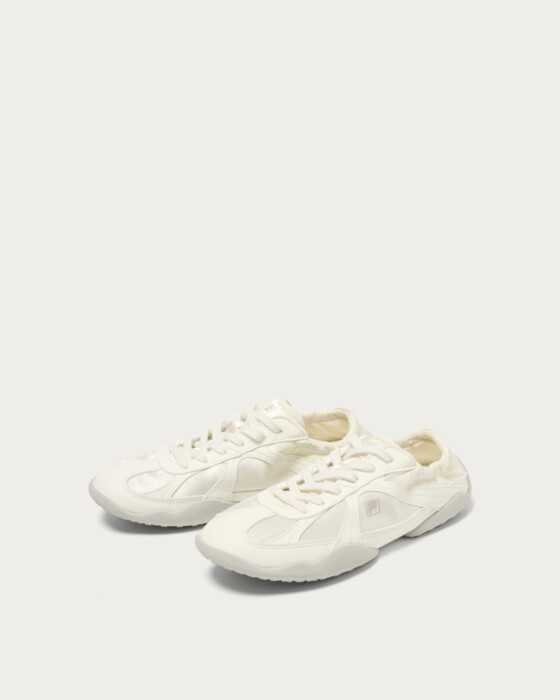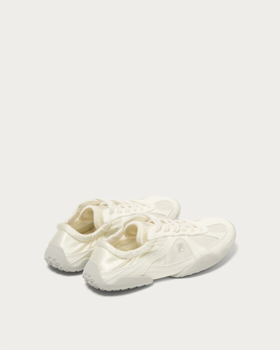 〈FILA〉の「ECHAPPE」のスポーティなラインパターンと独自のアウトソールデザインはそのままに、アッパーにはサテン素材を採用。バレエシューズのような軽さと可憐さをプラスしてアップデート。光の角度で表情が変わる柔らかな艶が、足元にフェミニンなニュアンスをプラスします。
