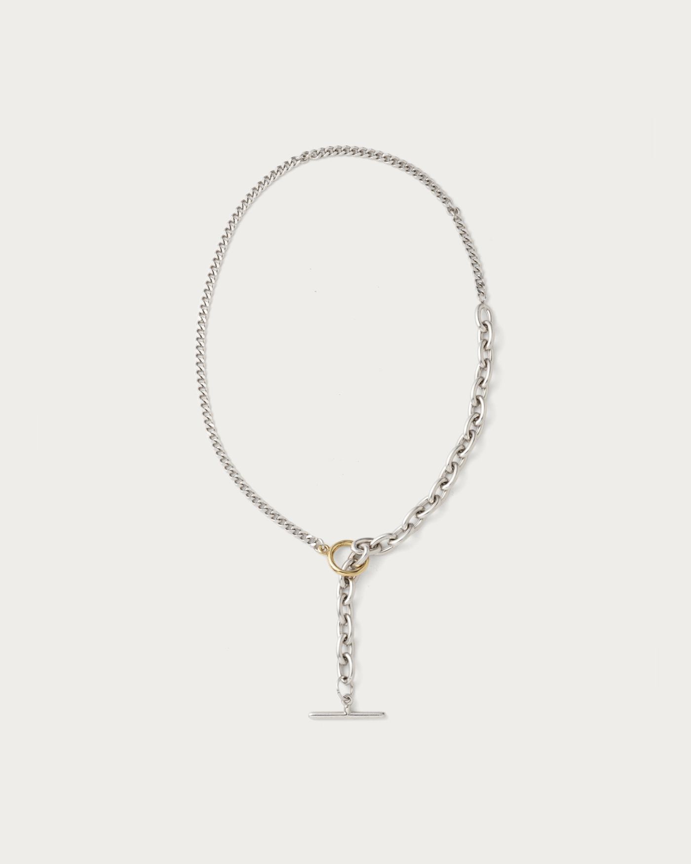 程よくボリュームのあるオーバル&キヘイチェーンを組み合わせた新作ネックレス。シルバー×ゴールドのミックスカラーもポイントです。トグルタイプの留め具は、あえて見せて使えるデザインに。フロントにトグルを配したり、チェーンを前に垂らしてラリエットタイプにもご使用いただけ、3WAYでお楽しみいただけます。