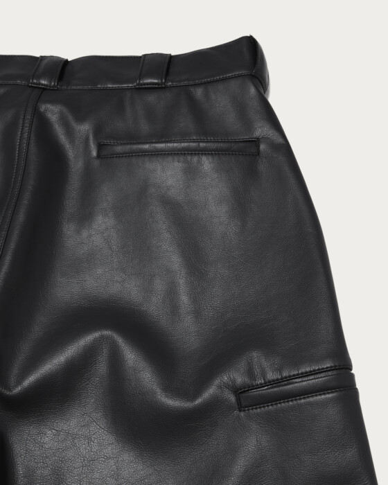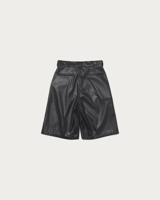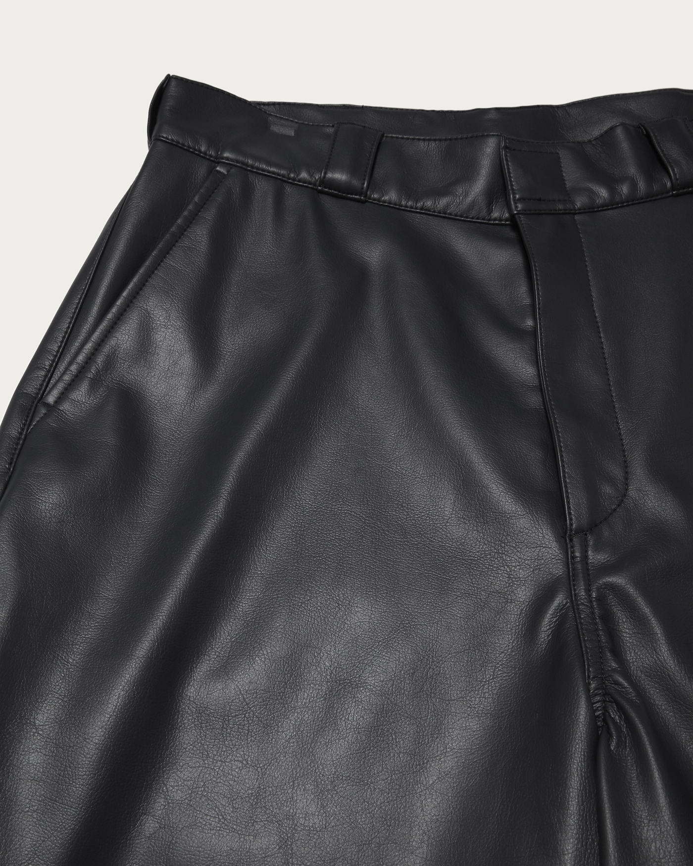 ワークパンツのディテールを踏襲したバギーショーツ。ウエスト周りはコンパクトで股上は深く、裾幅はゆったりしたワイドシルエット。ひざ下丈の長めに設定されたレングスはコーディネートを引き立てます。合成皮革素材でなめらかで上品な質感が特長で絶妙なネイビーの色味もポイント。シンプルなスタイリングにも存在感を演出します。