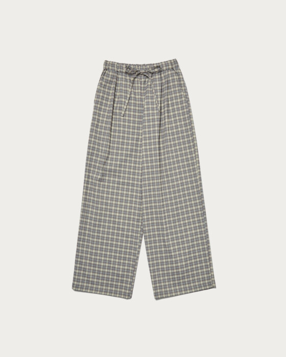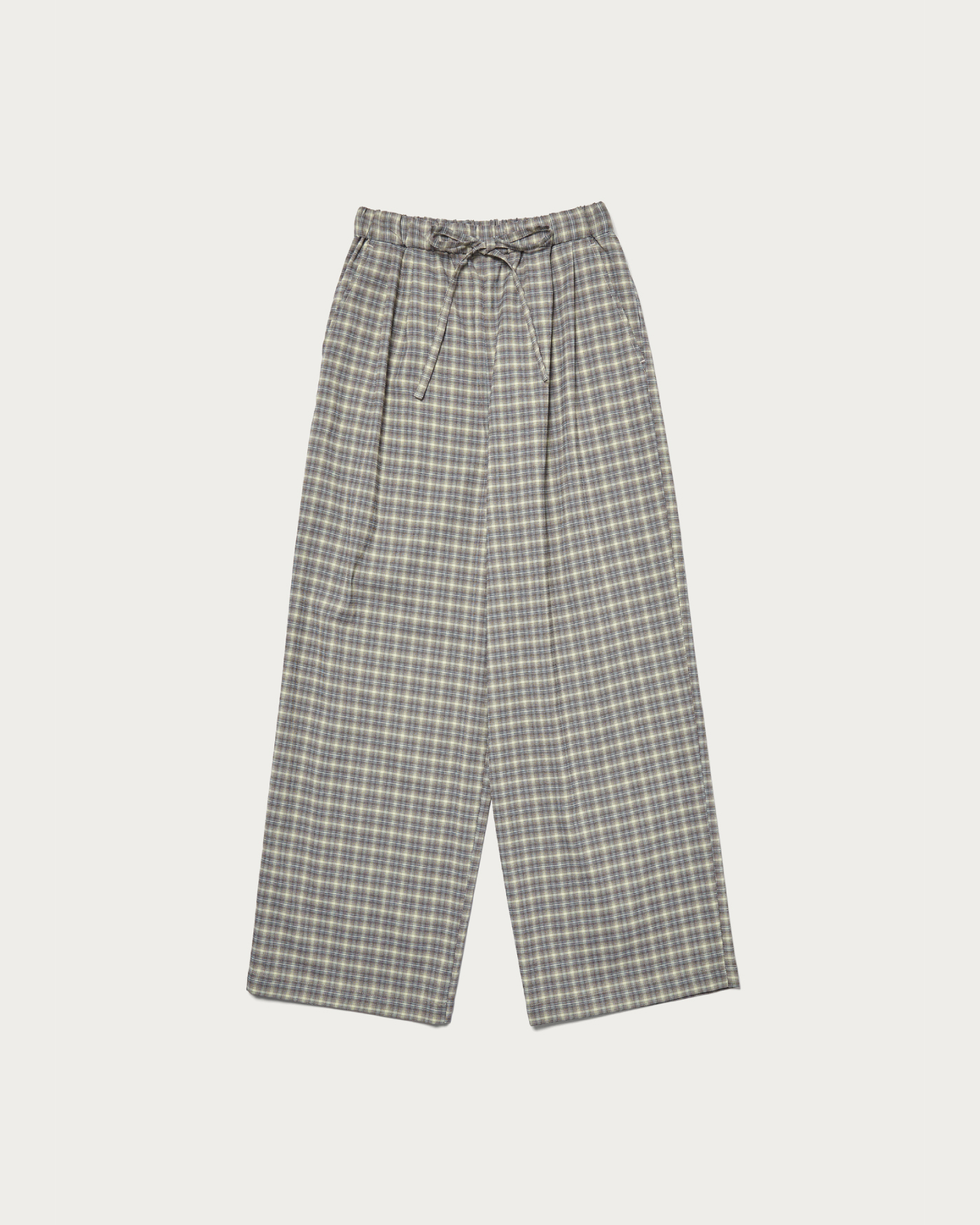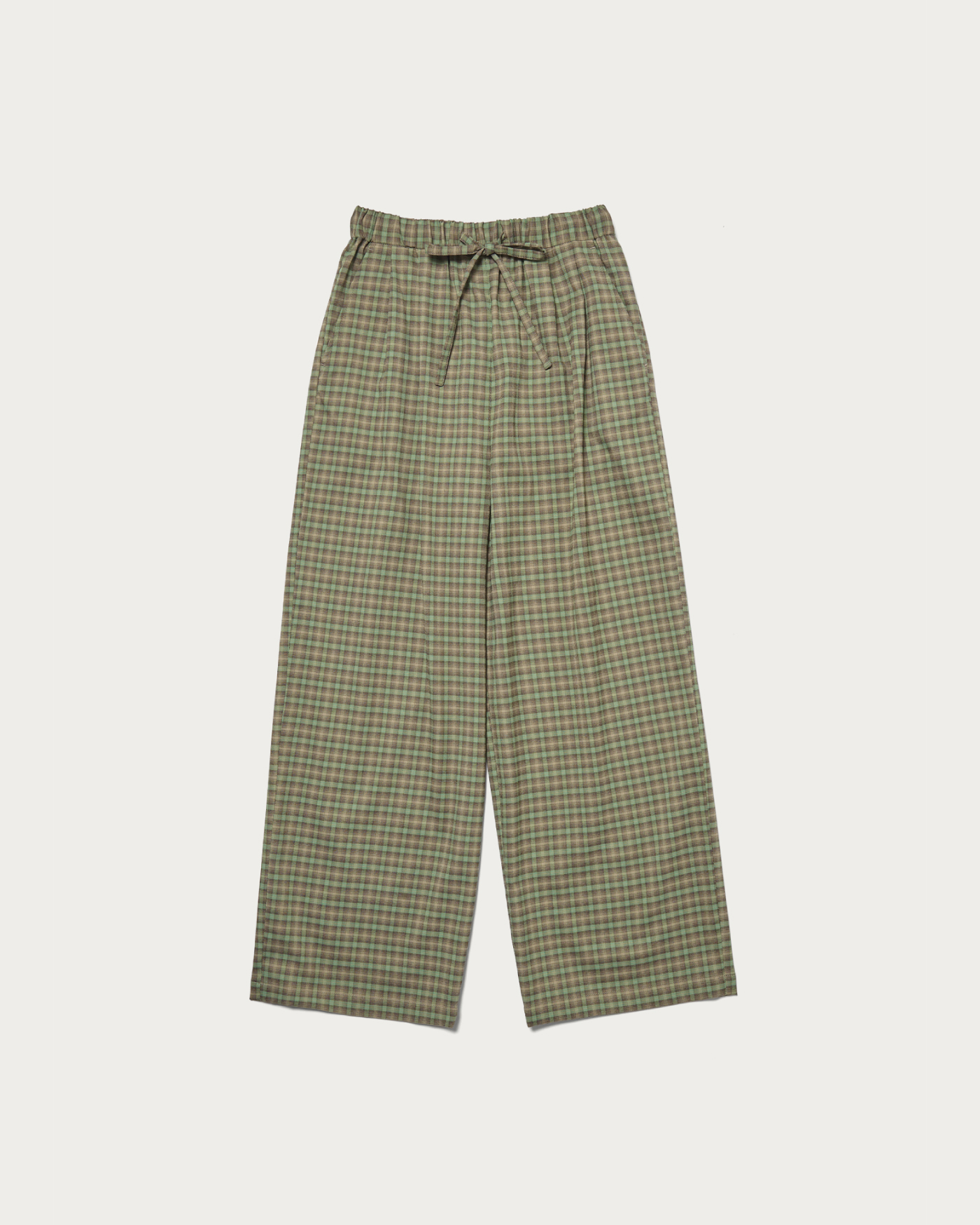 多色の糸が重なるチェックで軽やかに穿けるイージーパンツ。程よいワイド感と落ち感のあるシルエットで、リラックスした履き心地ながらもすっきり見えるバランスに仕上げました。ウエストはドローストリング仕様で調整しやすく、バックポケットのデザインが上品なアクセントに。