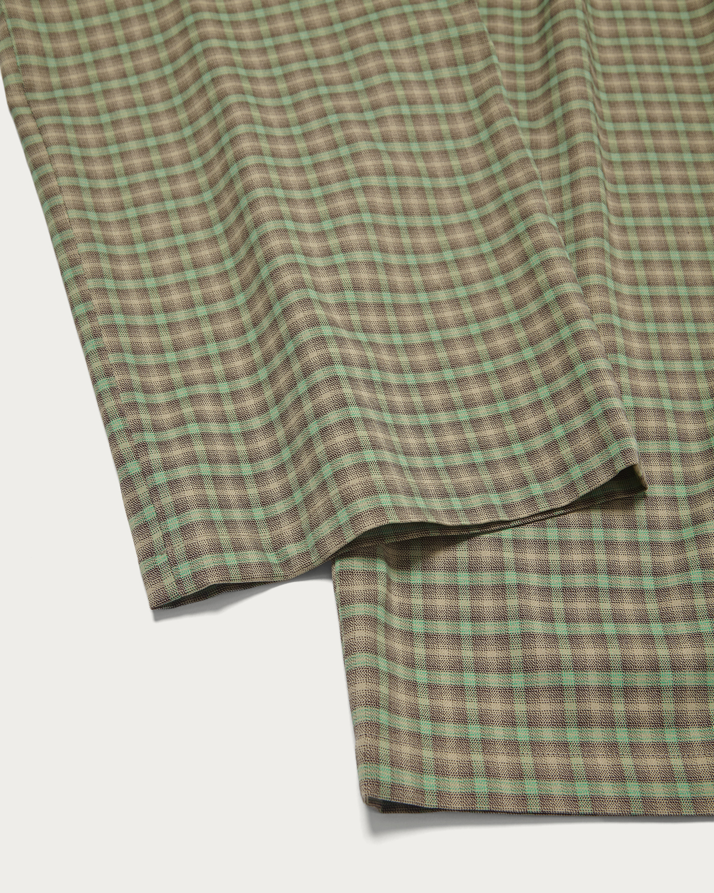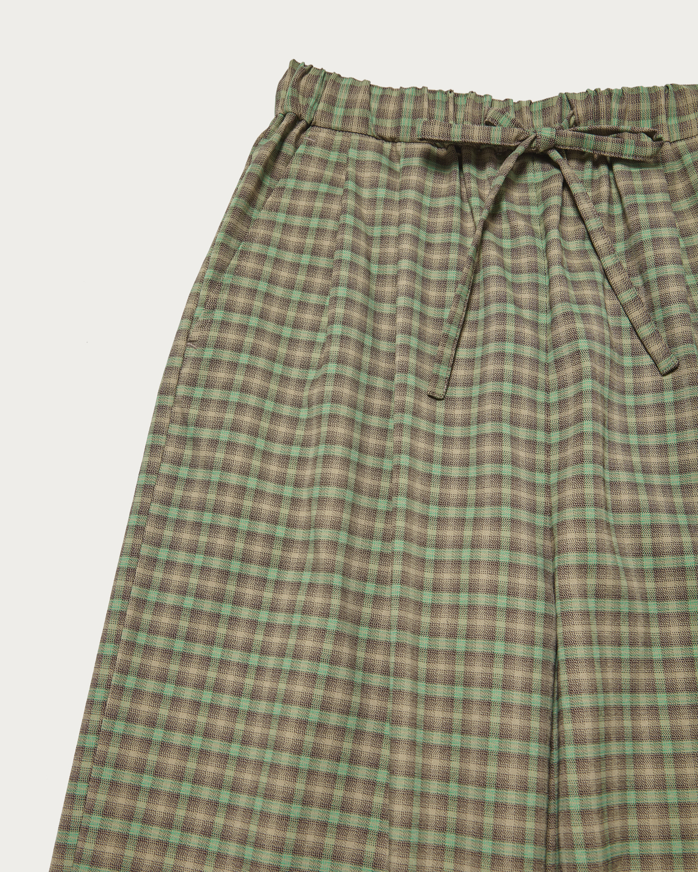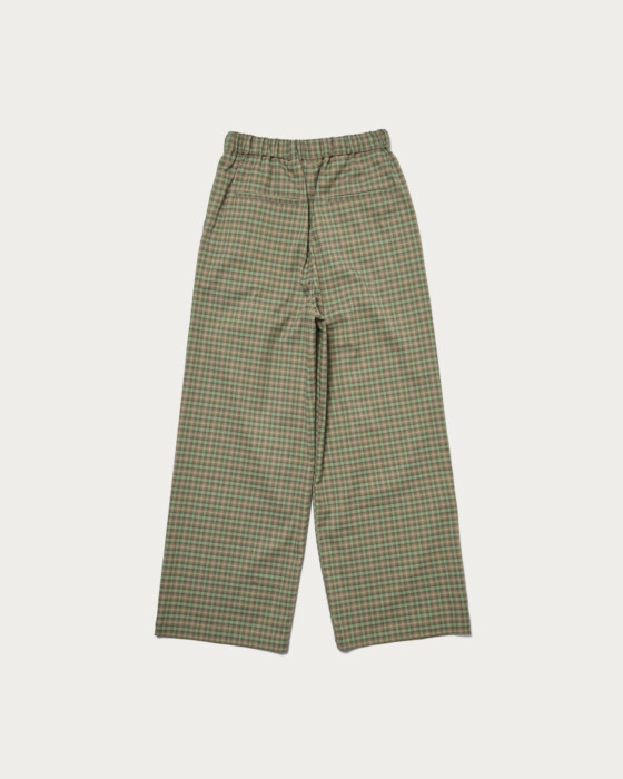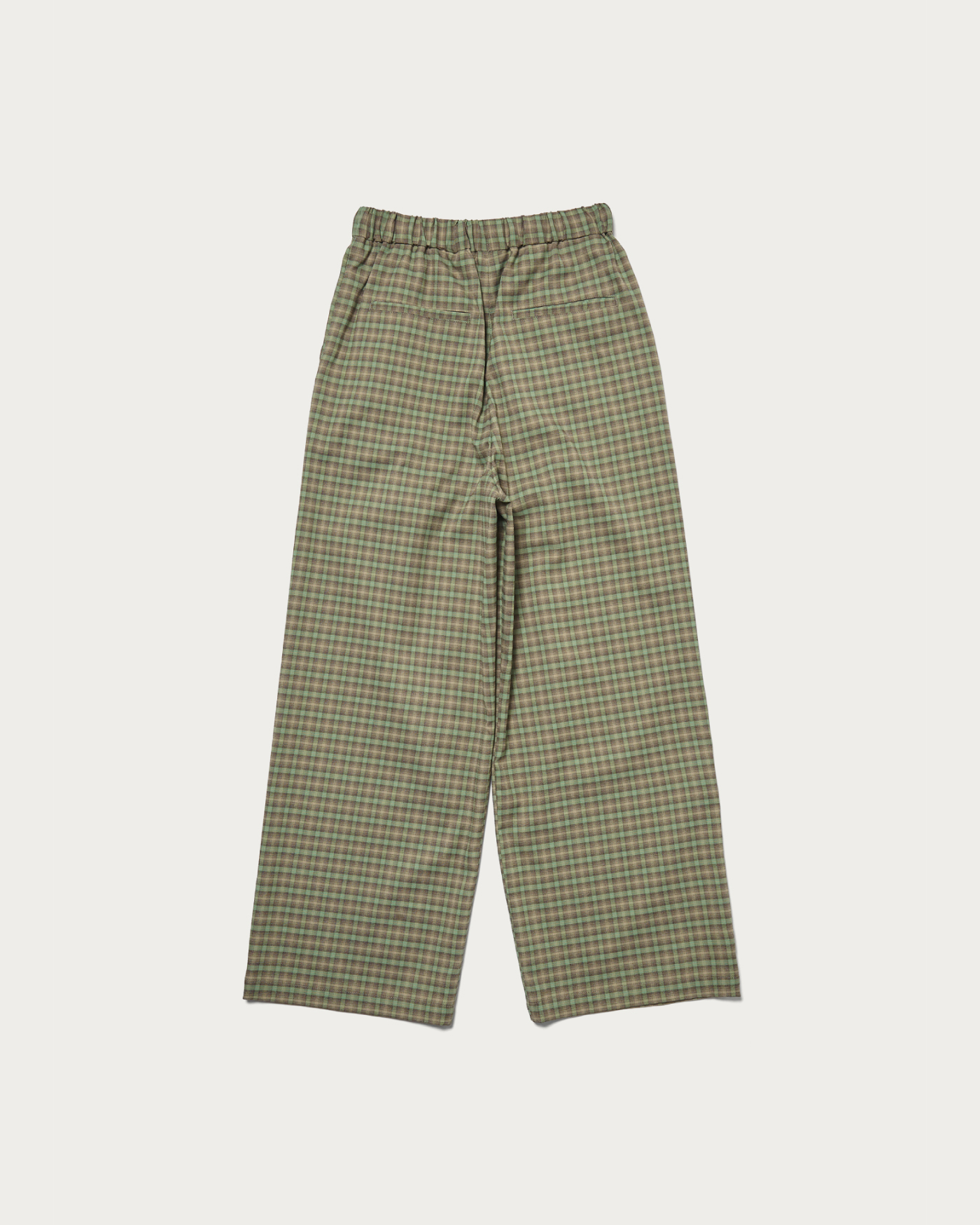多色の糸が重なるチェックで軽やかに穿けるイージーパンツ。程よいワイド感と落ち感のあるシルエットで、リラックスした履き心地ながらもすっきり見えるバランスに仕上げました。ウエストはドローストリング仕様で調整しやすく、バックポケットのデザインが上品なアクセントに。