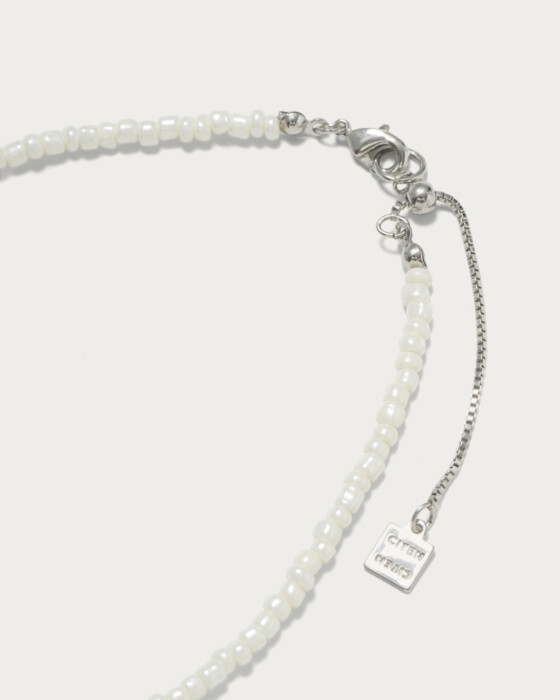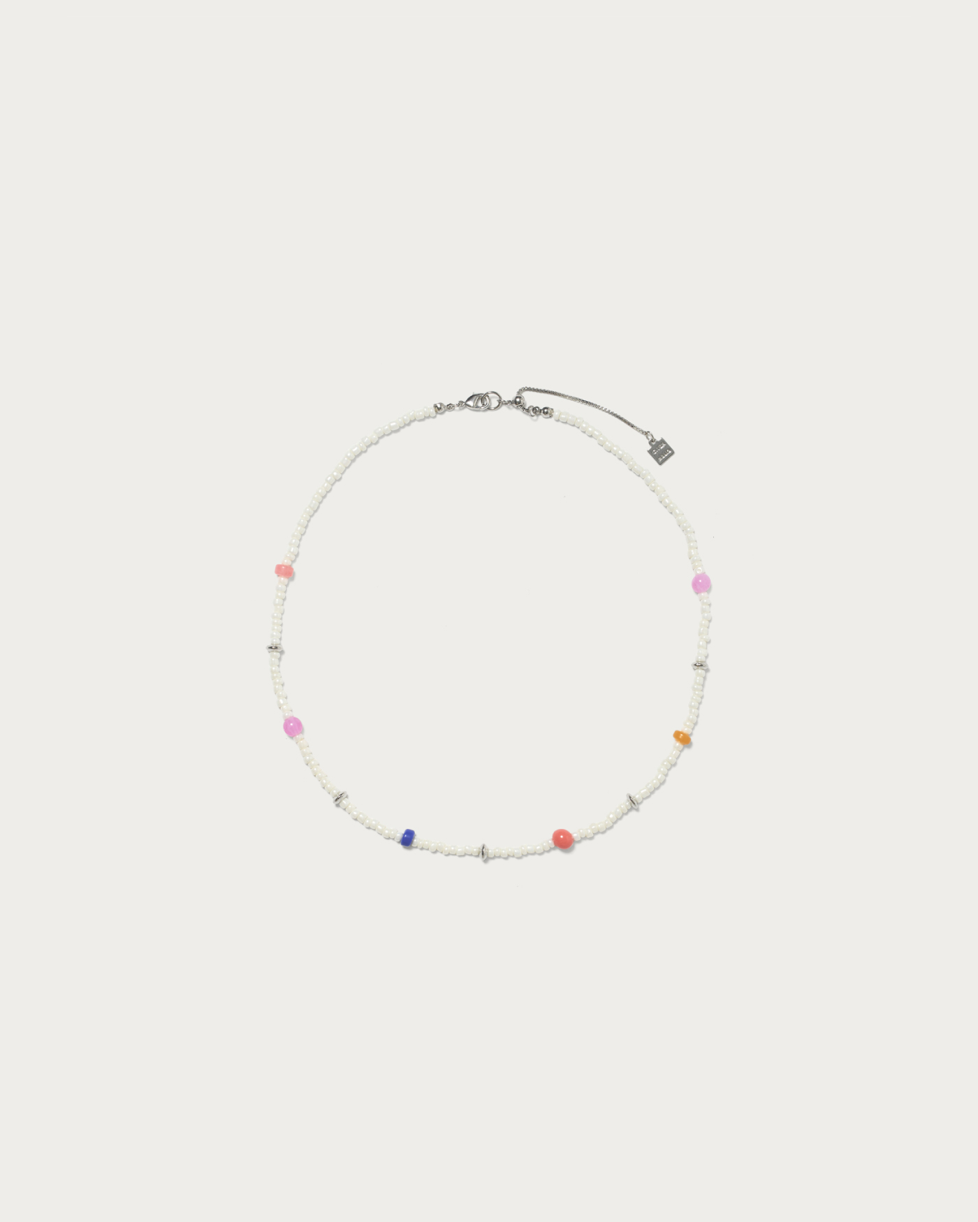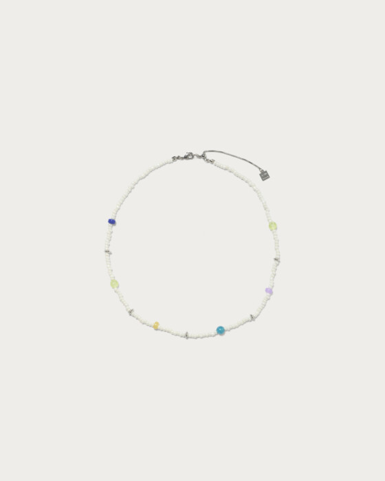 ホワイトベースのビーズの間にカラフルビーズをランダムに組み込んだネックレス。ポップなカラフル感もありつつスタイリングに取り入れやすいホワイトベースなのでシンプルなスタイリングのアクセント使いにぴったりです。エンド部分は長調整可能なアジャスター付きです。
