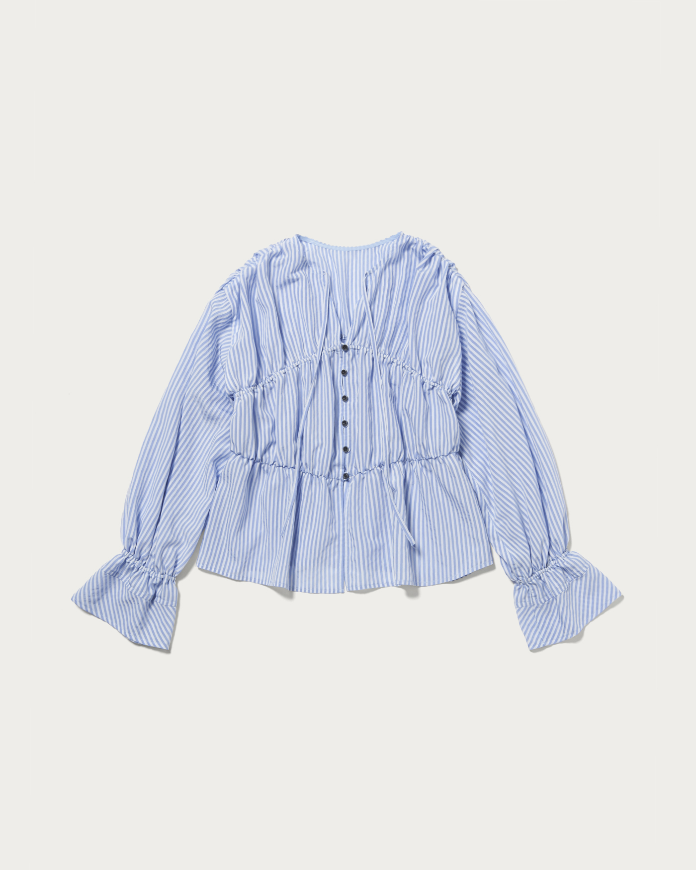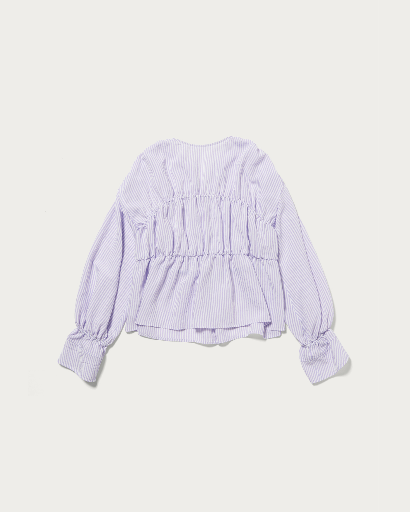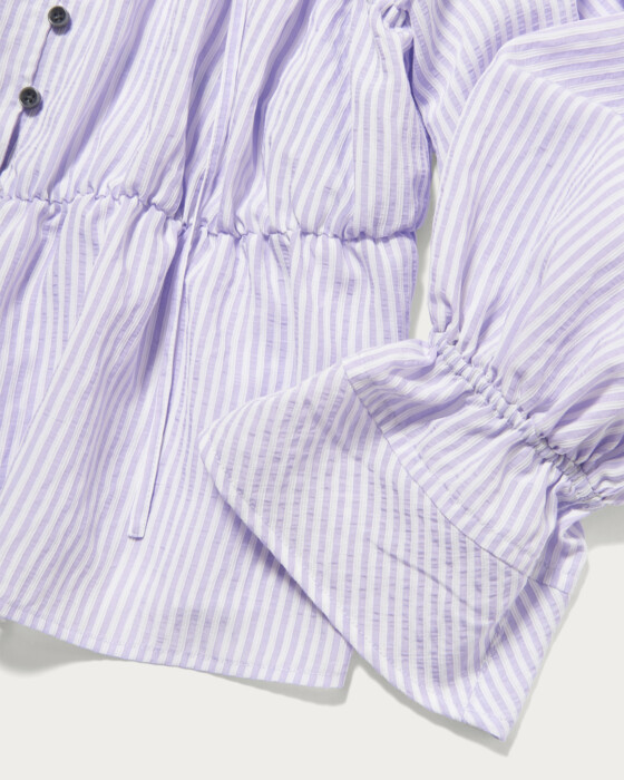 身頃にたっぷり施したギャザーがポイントのストライプシャツ。デコルテが覗くネックラインと、ギャザー部分から裾や袖口にかけて広がるシルエットがフェミニンな1枚。春らしい軽やかなストライプ生地で作ることで甘くなりすぎないように仕上げています。