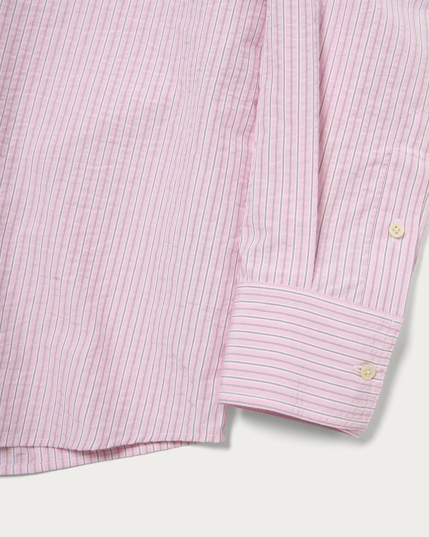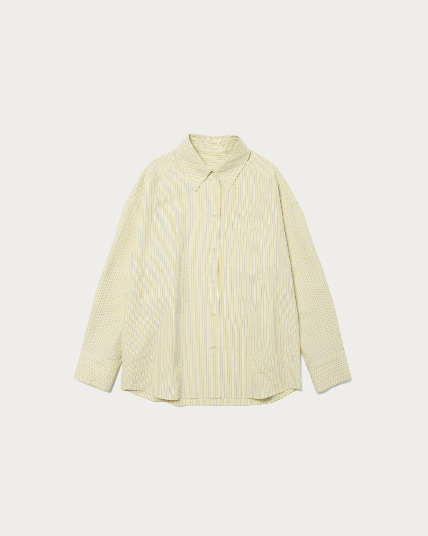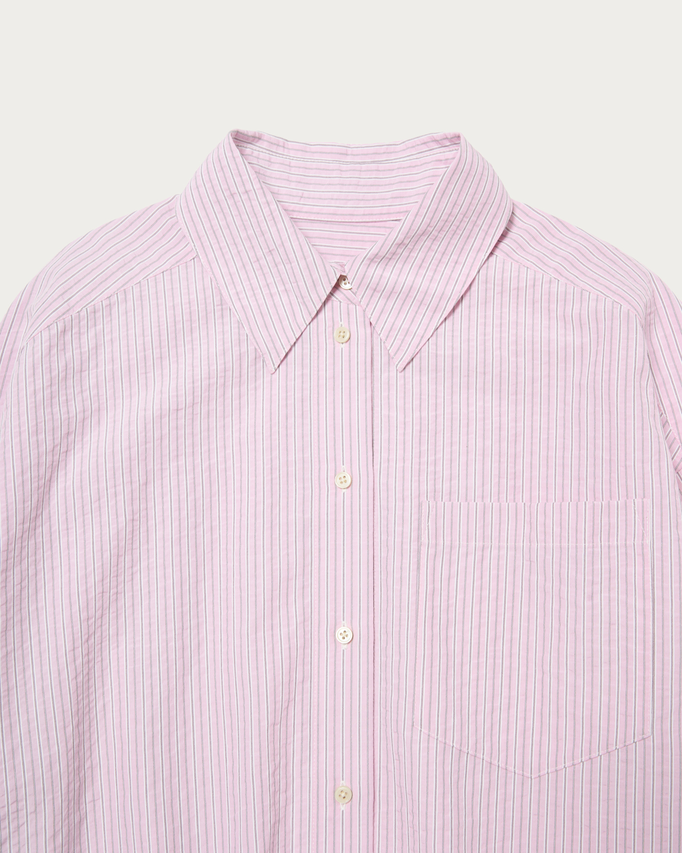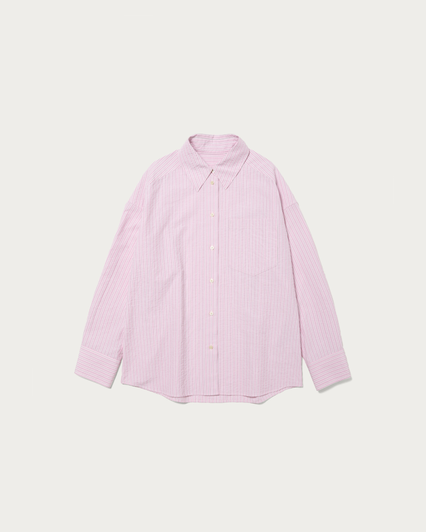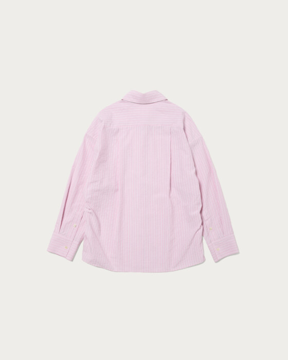 ばさっとラフに羽織って頂けるストライプシャツ。オーバーサイズで抜け感のあるデザイン。脇にタックが入っていて、抜いて着たときもたまりを作り、それだけでこなれ感が上がります。ポケットも顔回りを寂しくさせないポイントに。