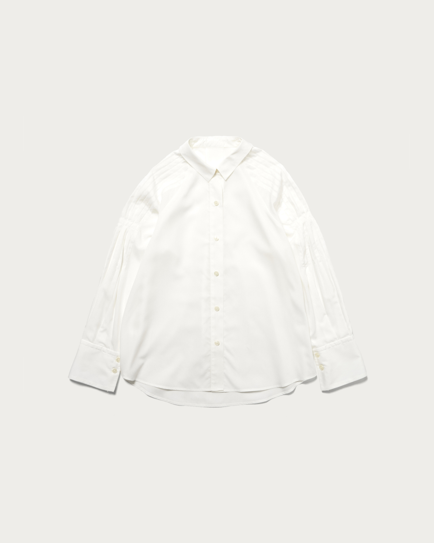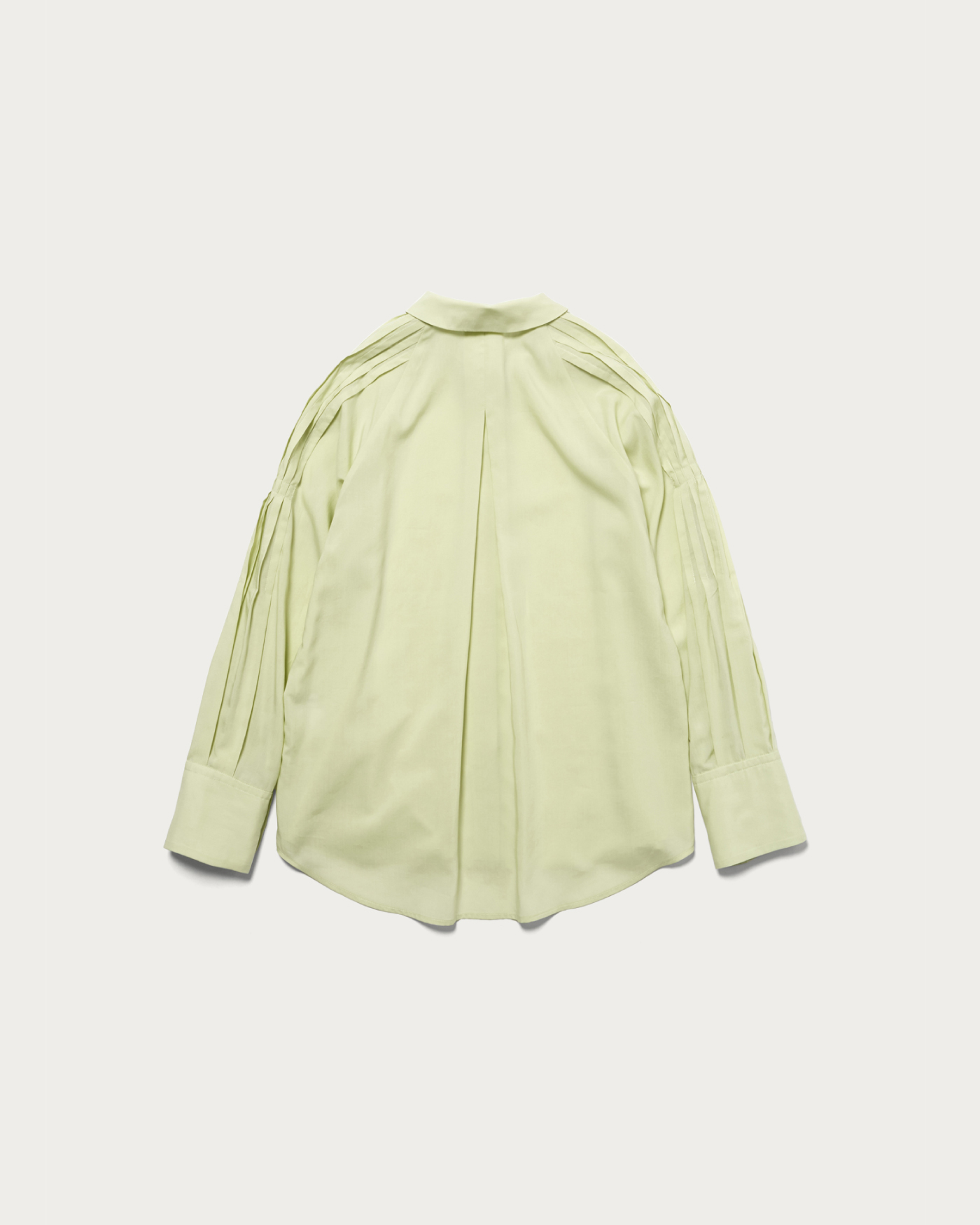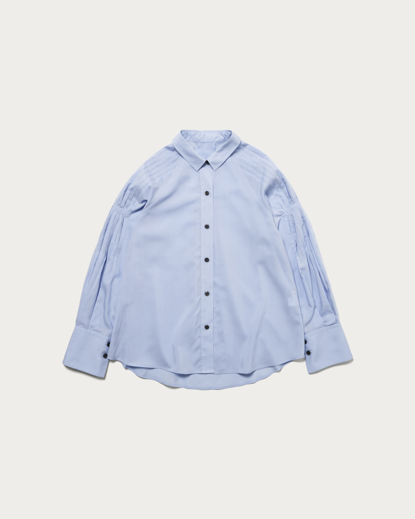 袖にたっぷりと施したタックがポイントのシャツ。衿は小さめにミニマルな印象で、素材感も張りが強すぎないのでオーバーサイズのカジュアルシャツを程よくフェミニンに着こなせます。リヨセルならではの程良いくたっと感と真面目過ぎない表面感が特徴。いわゆるシャツ地ほど堅さが無くしなやかな印象がフェミニンな雰囲気で素敵です。