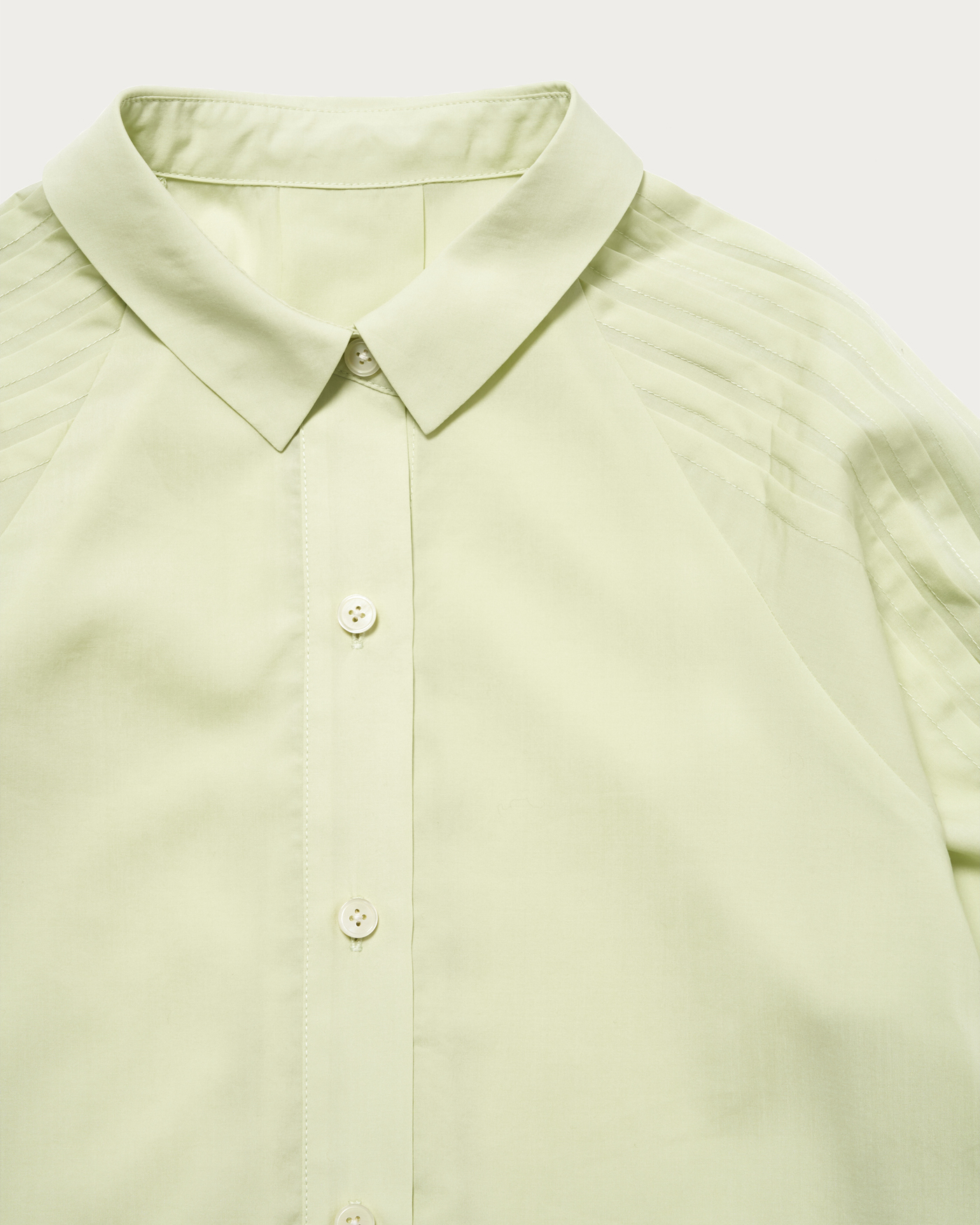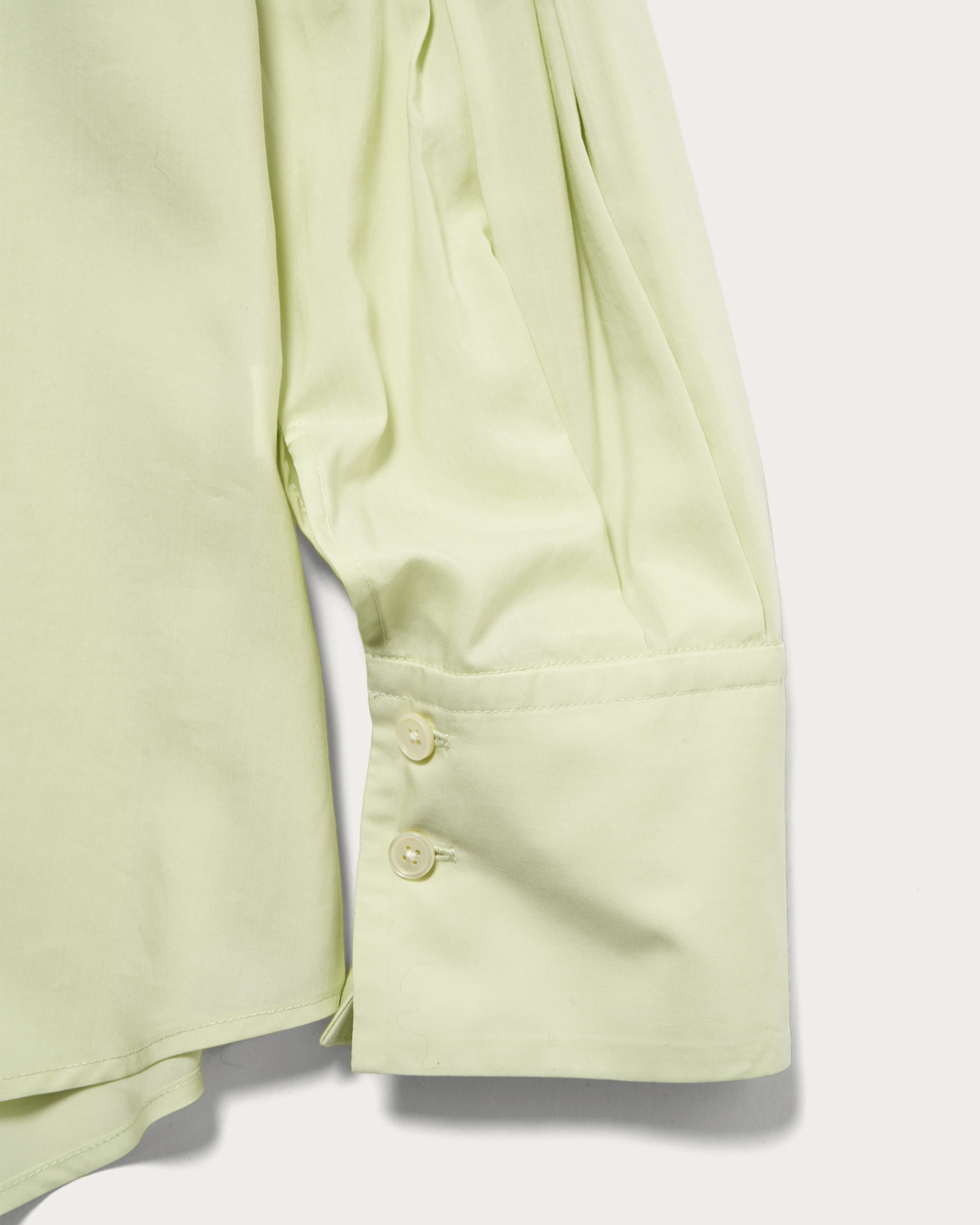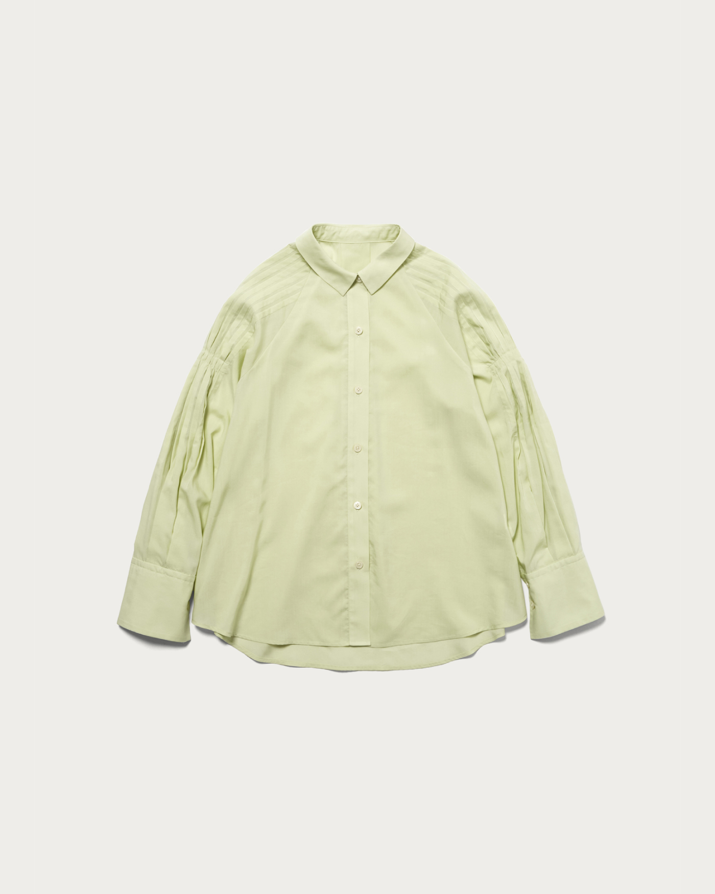袖にたっぷりと施したタックがポイントのシャツ。衿は小さめにミニマルな印象で、素材感も張りが強すぎないのでオーバーサイズのカジュアルシャツを程よくフェミニンに着こなせます。リヨセルならではの程良いくたっと感と真面目過ぎない表面感が特徴。いわゆるシャツ地ほど堅さが無くしなやかな印象がフェミニンな雰囲気で素敵です。