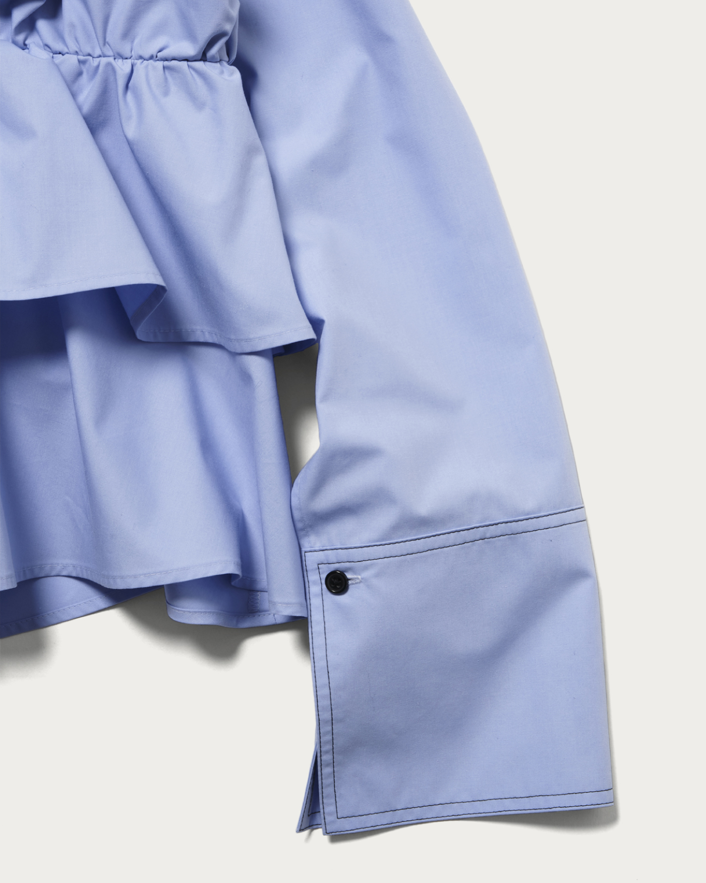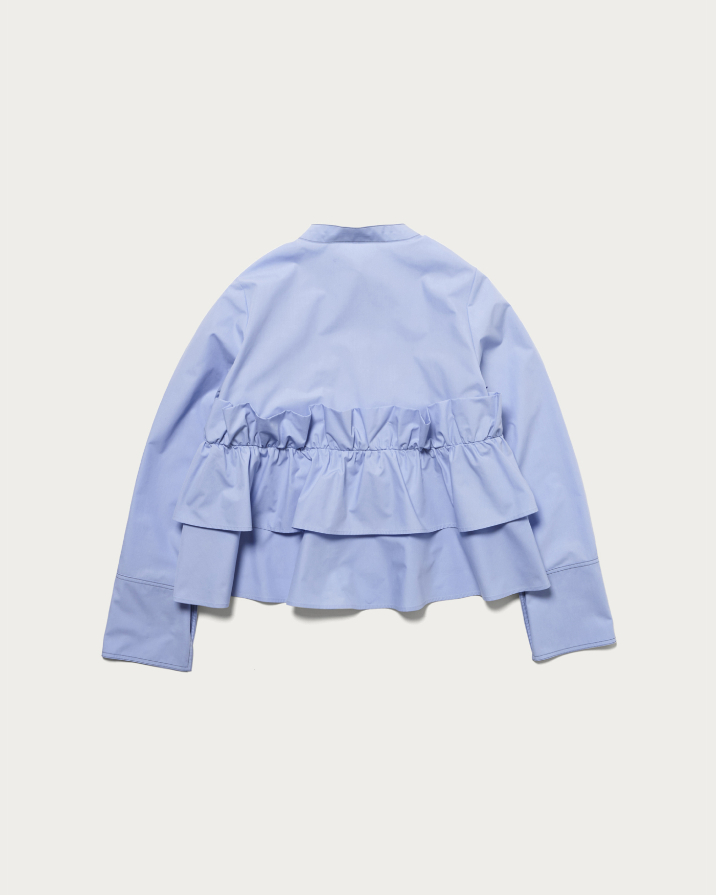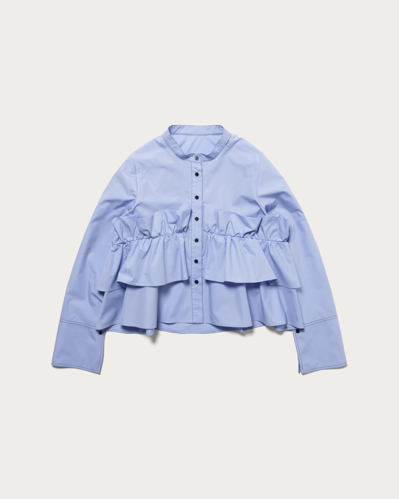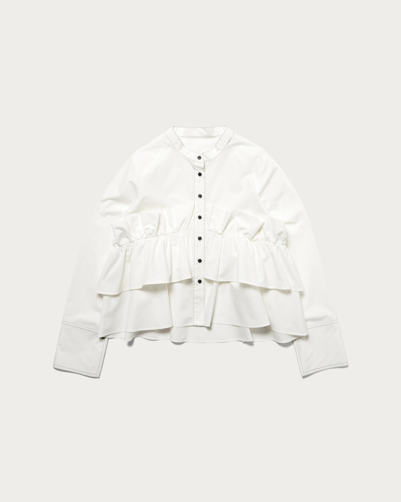 身頃のボリュームのあるフリルが華やかなブラウス。ボタンやステッチは配色を効かせたメリハリのあるデザイン。肩回りはコンパクトに、裾に掛けてボリュームを持たせたフォルムでバランスよく着られるように仕上げています。式典などの華やかなシーンにもおすすめの一枚。