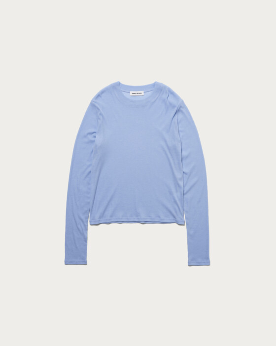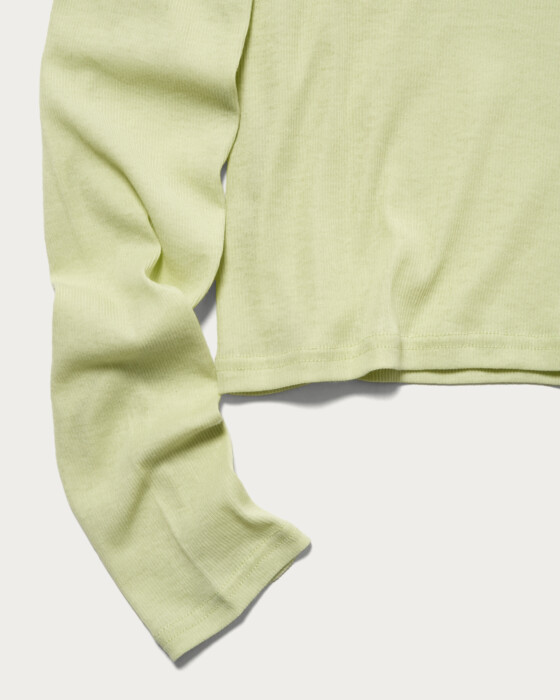 コンパクトなサイズ感とほどよい薄さが女っぽく着られるロンT。カジュアルに衿を太めにしているので、コンサバにならない雰囲気のデザインで、袖も身頃も程よく細見えさせてくれます。ジャケットやサロペットに重ねやすい薄さと、柔らかいタッチがポイント。