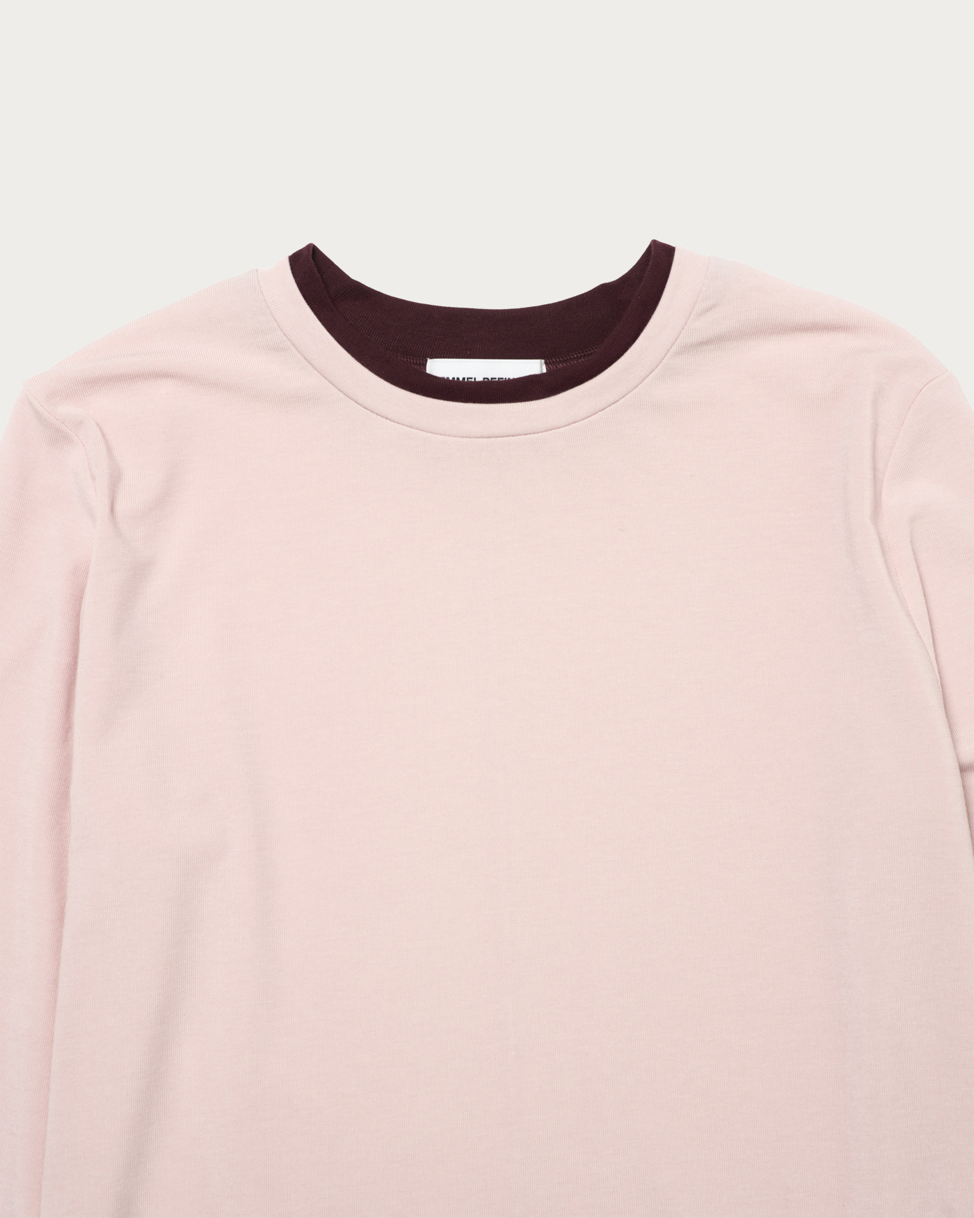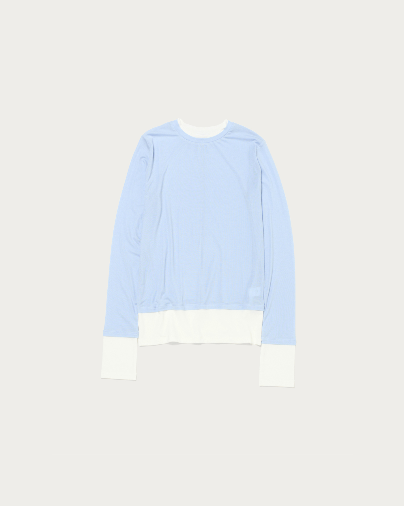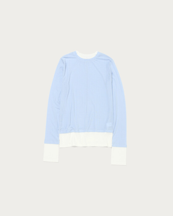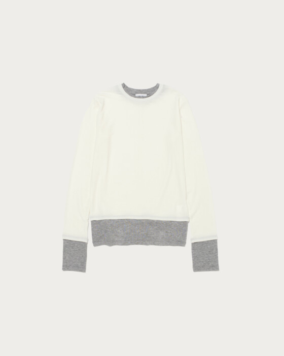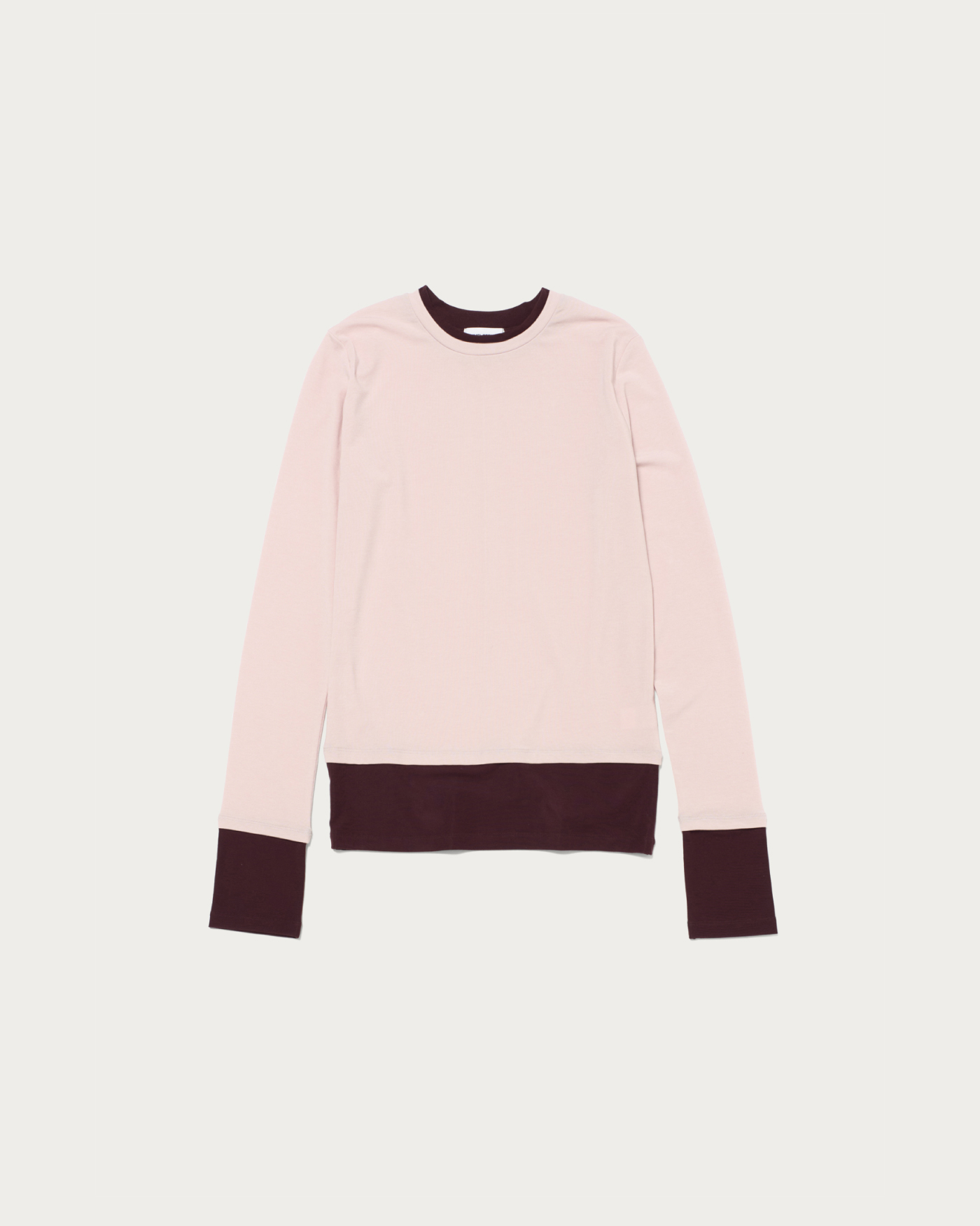 レイヤード風に配色を効かせたディテールがポイントのロンT。薄手でソフトな風合いのフライスで作る程よいコンパクトシルエットが女っぽく着こなせるバランスです。袖口と裾の配色部分をくしゅっとためた着こなしが可愛いデザイン。