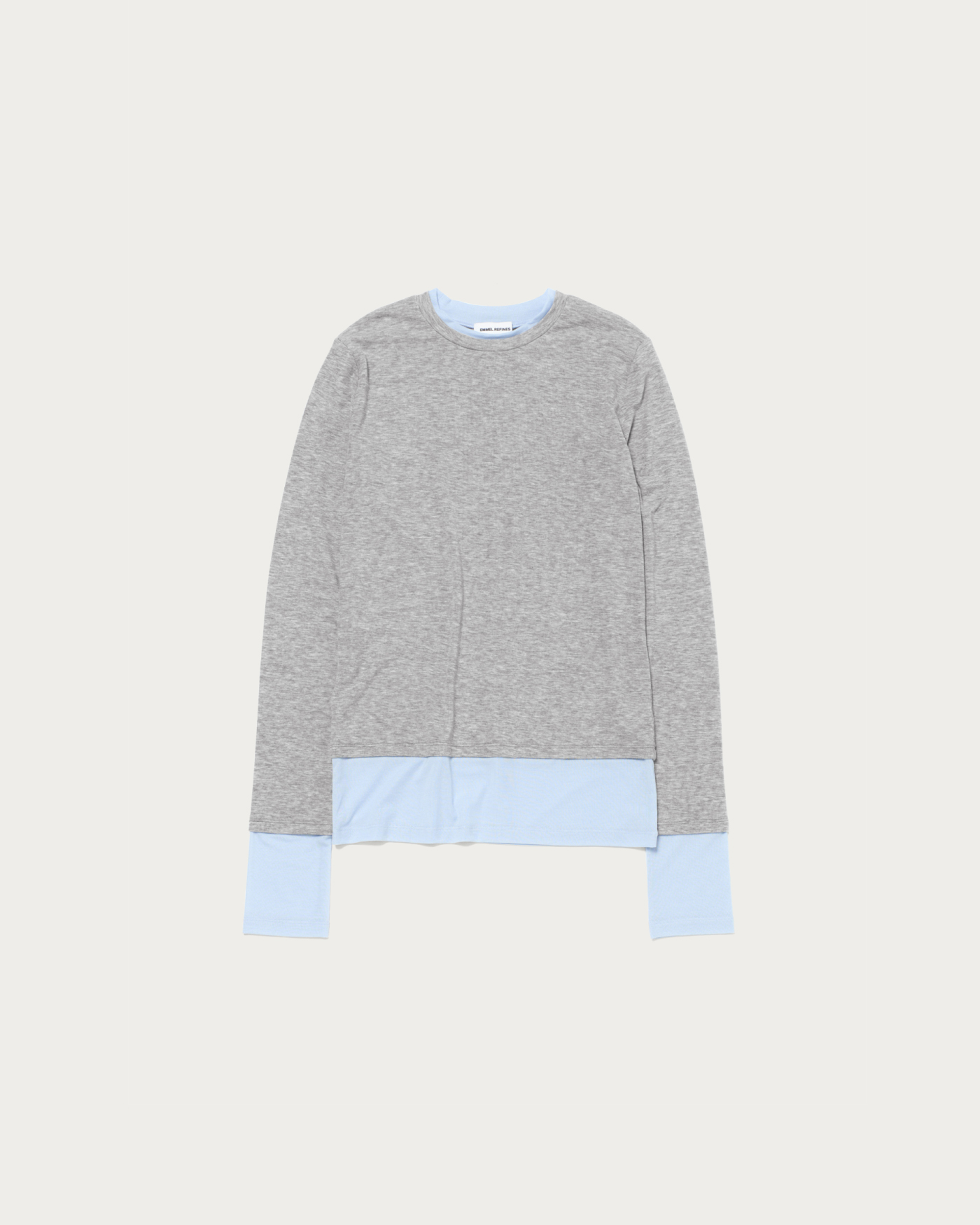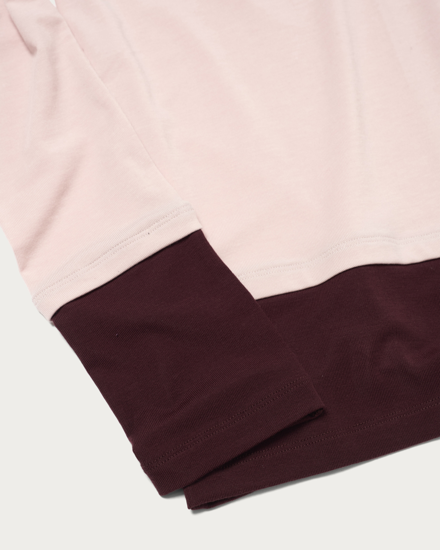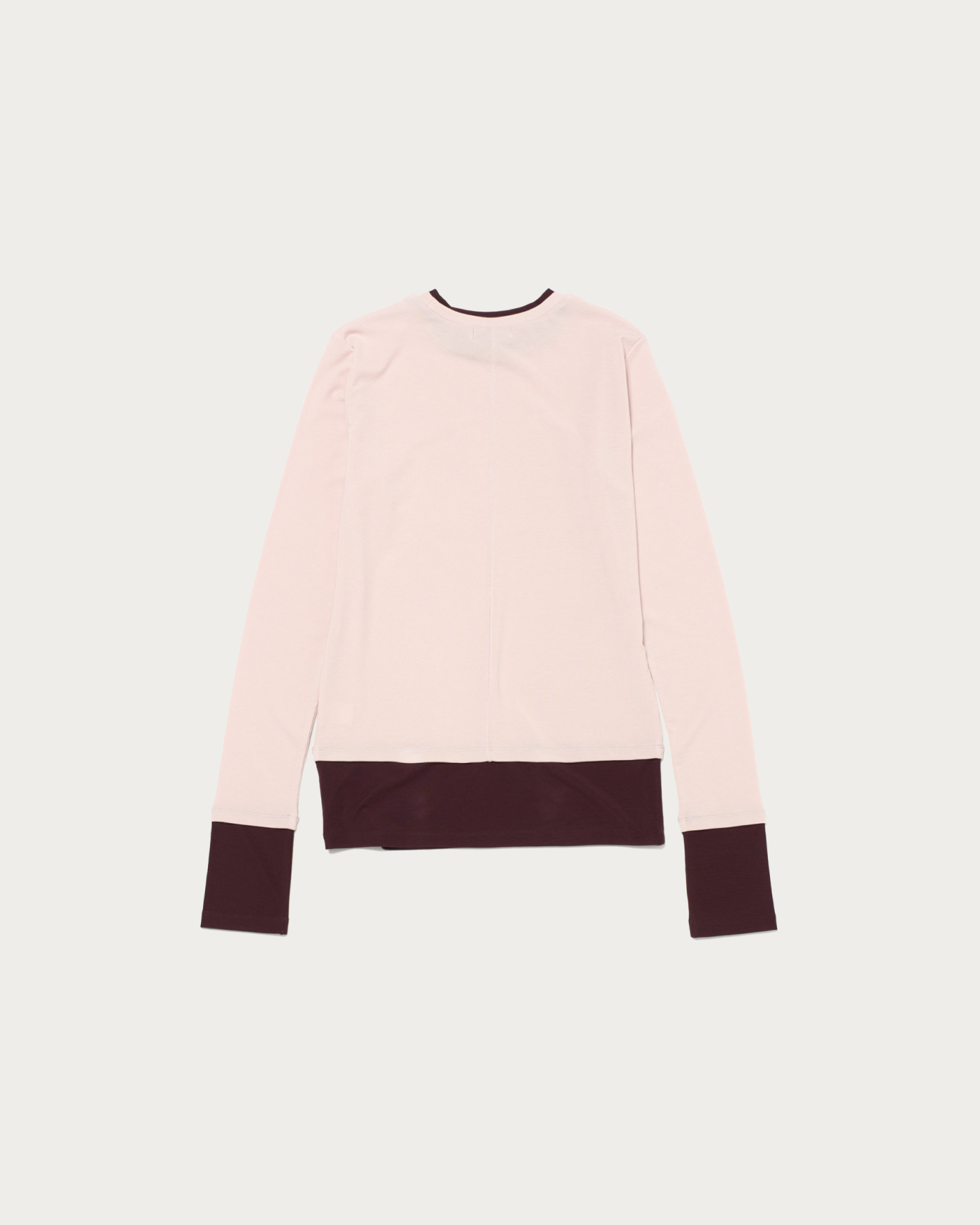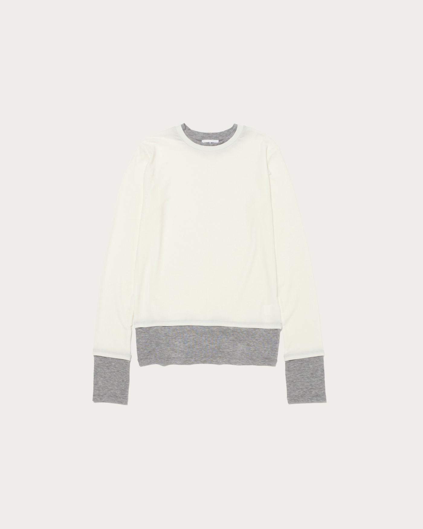 レイヤード風に配色を効かせたディテールがポイントのロンT。薄手でソフトな風合いのフライスで作る程よいコンパクトシルエットが女っぽく着こなせるバランスです。袖口と裾の配色部分をくしゅっとためた着こなしが可愛いデザイン。