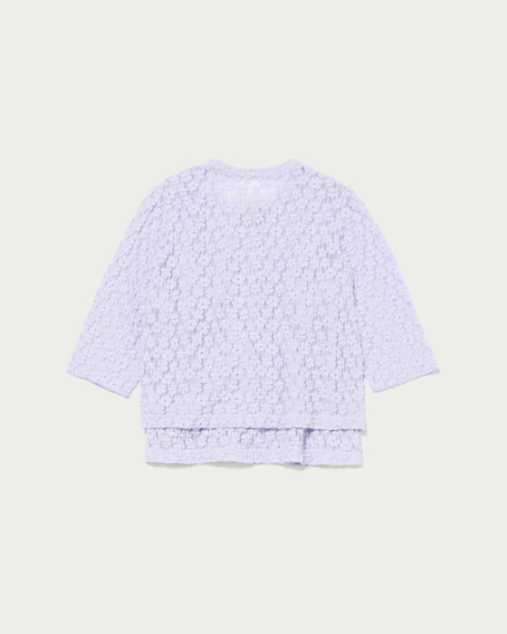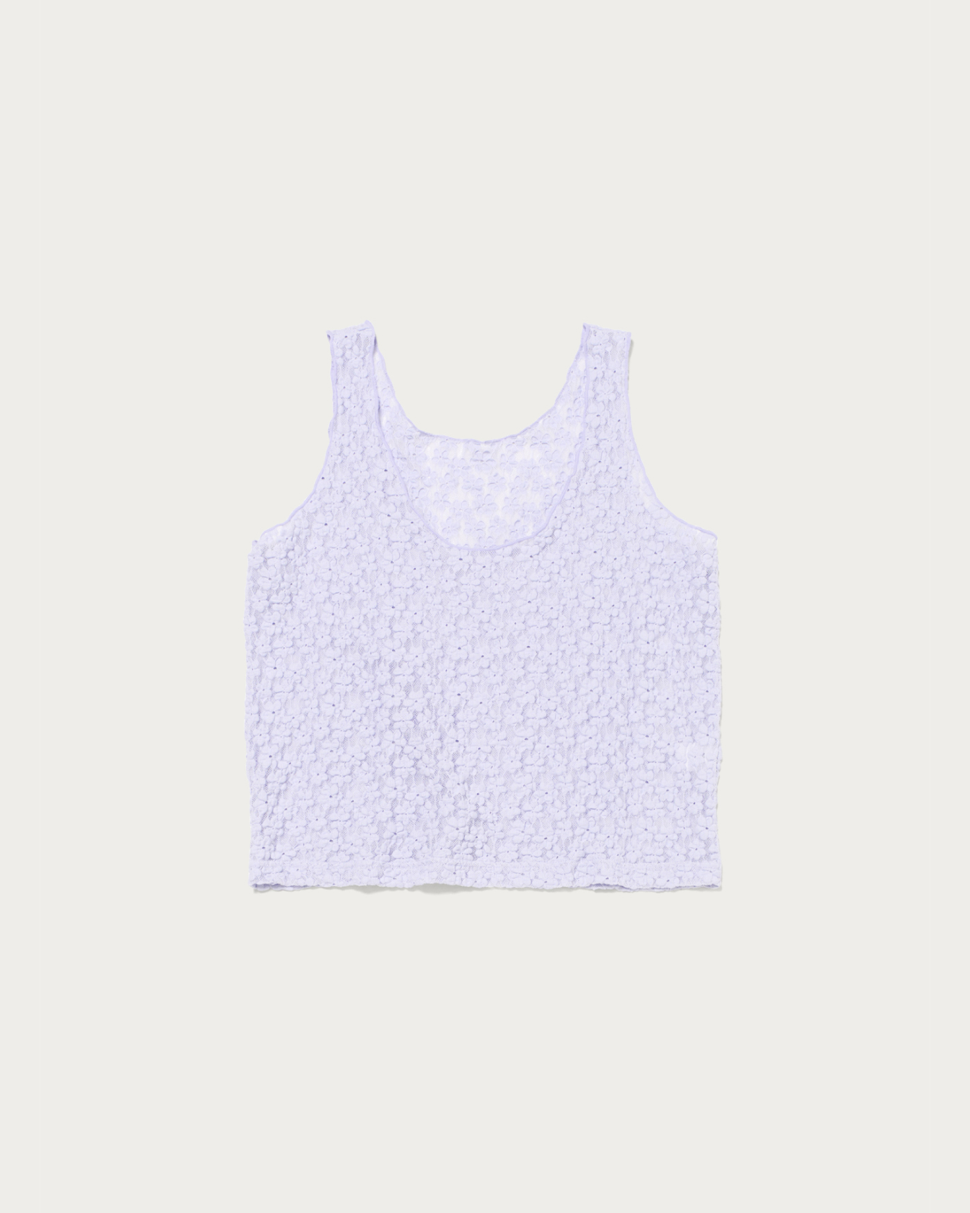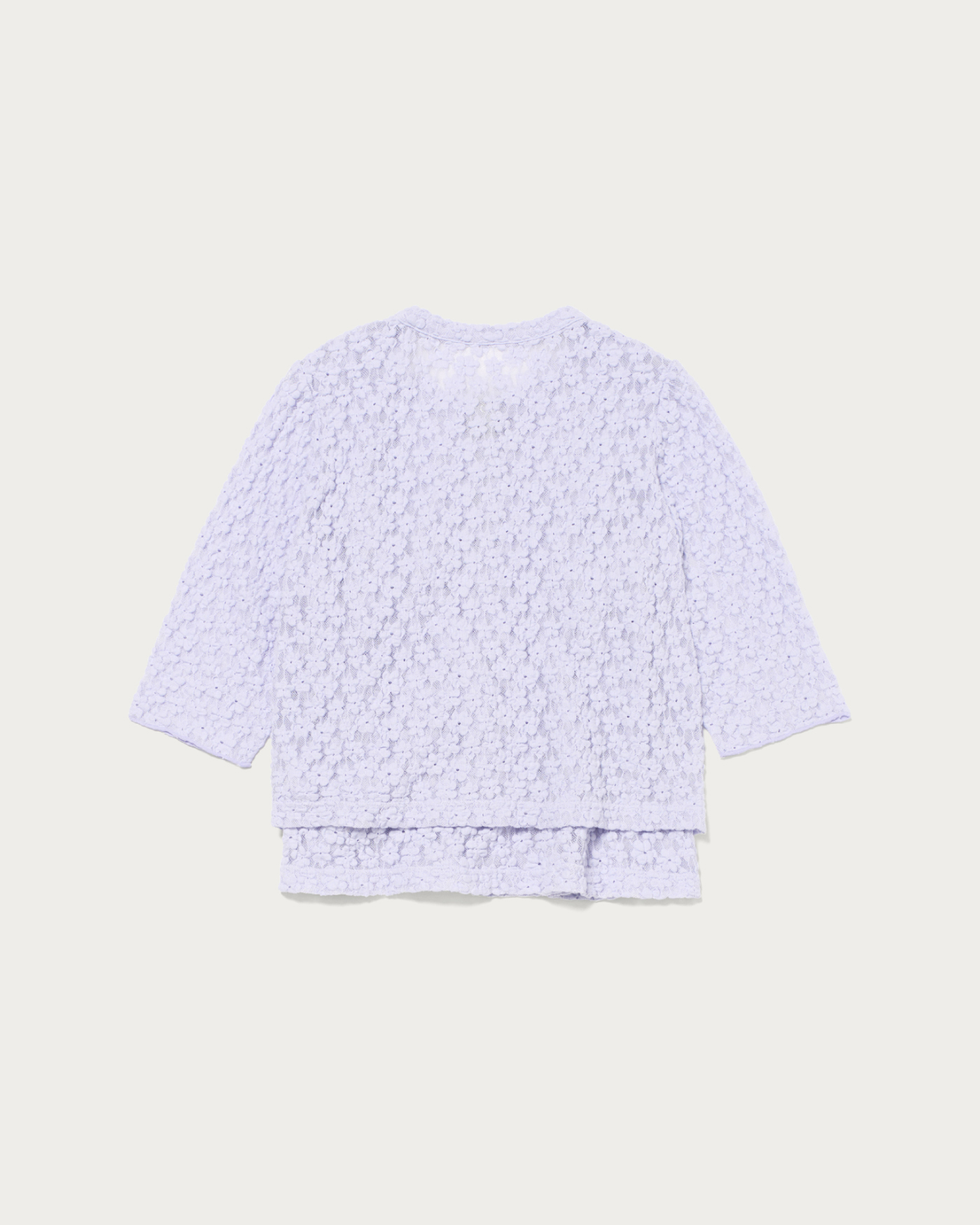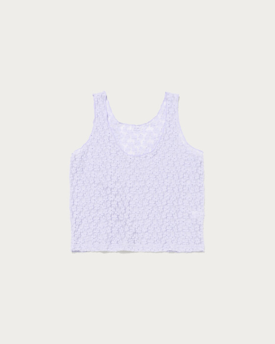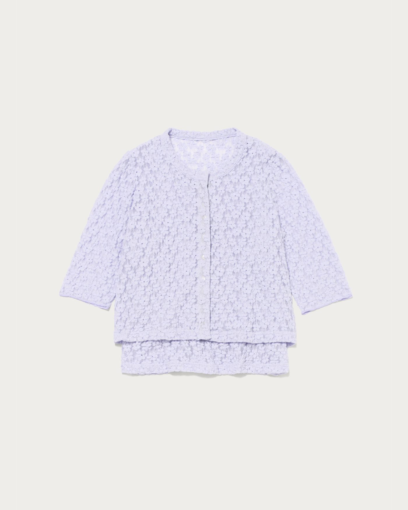 今年の気分のレース風のカットソー素材で作られたカーディガンとタンクトップのセット。コンパクトなサイズ感が今っぽいフェミニンなスタイリングにしてくれます。レース見えする表情感のあるカットソーで、フィットしたサイズ感でも着心地の良いアイテム。ライラックはEMオリジナルのカラーで春の気分を上げてくれます。