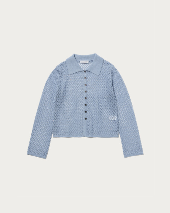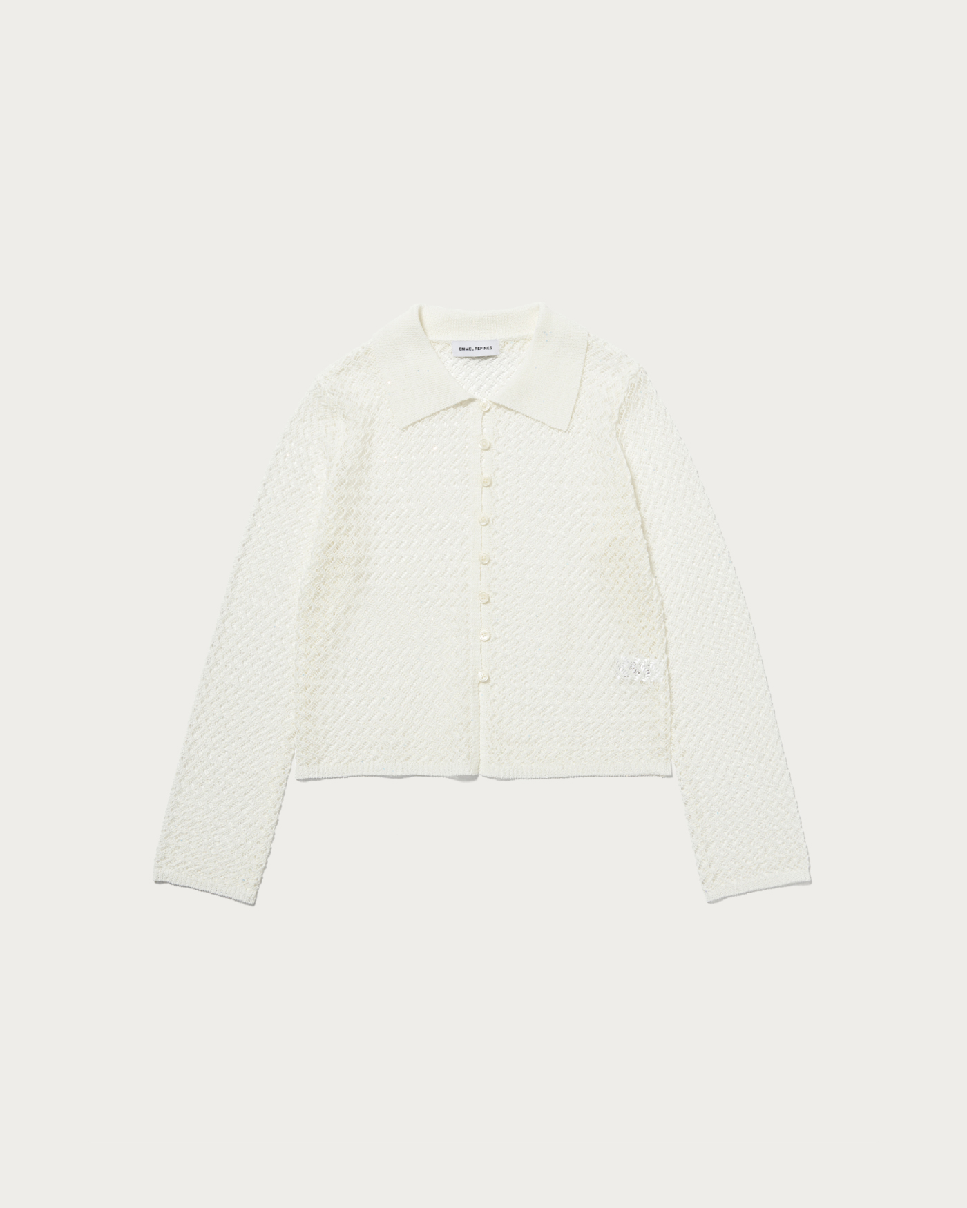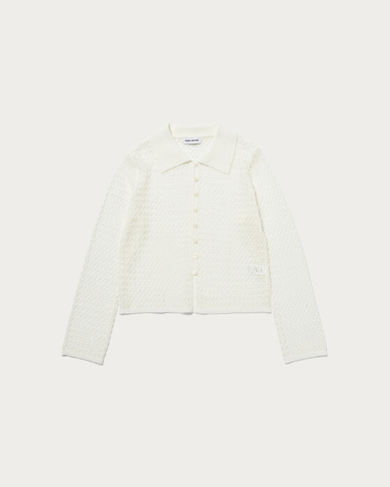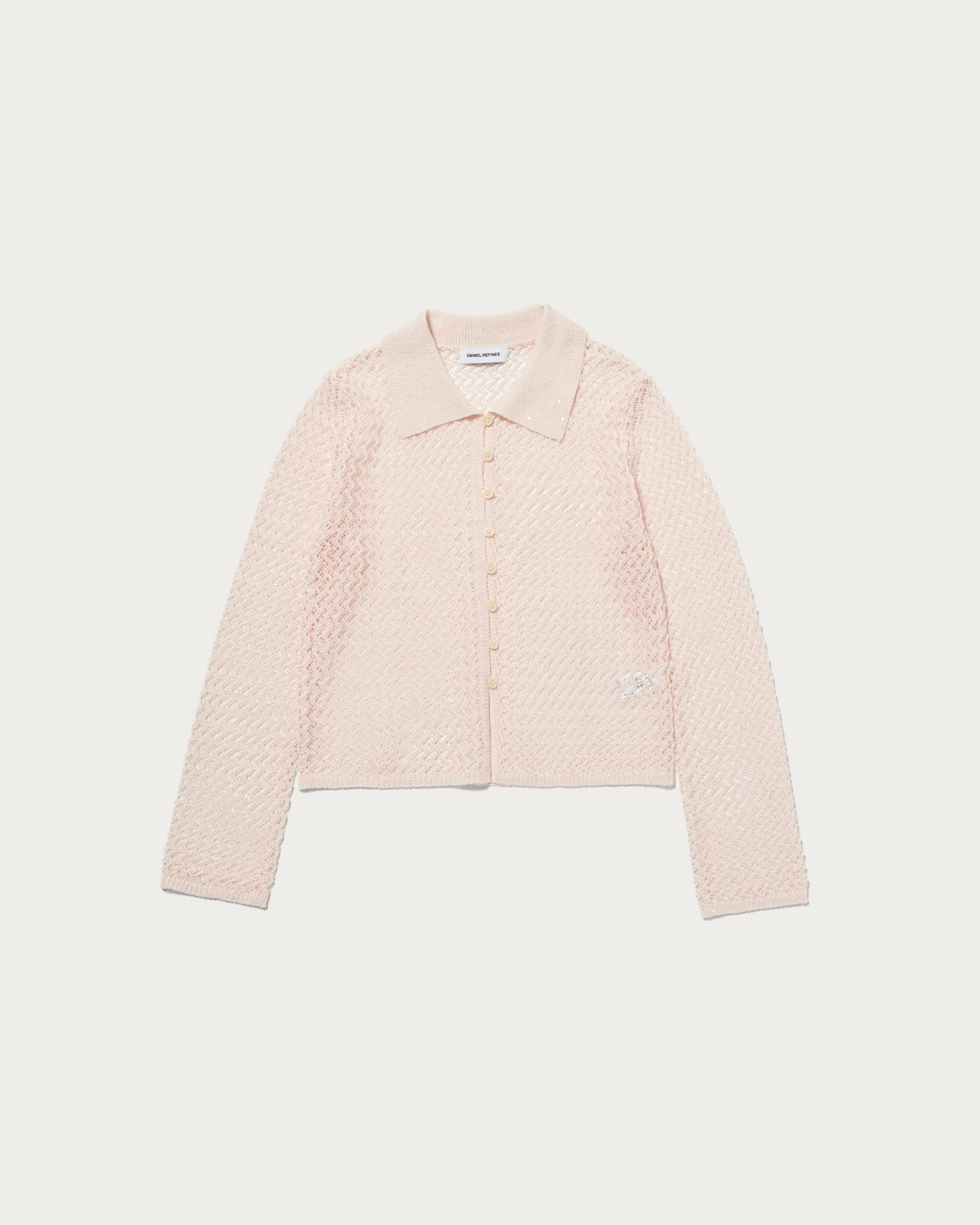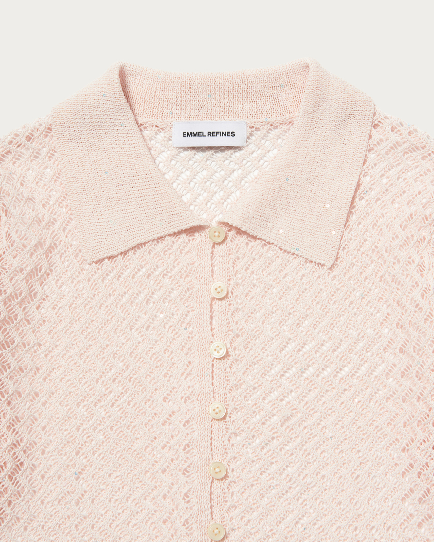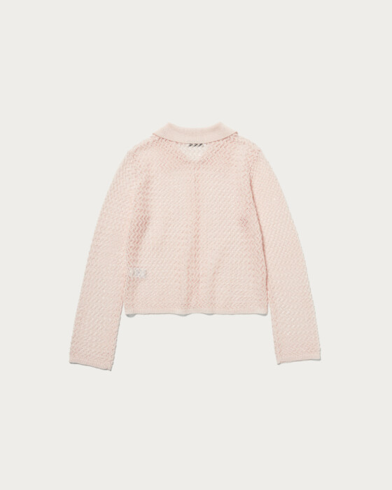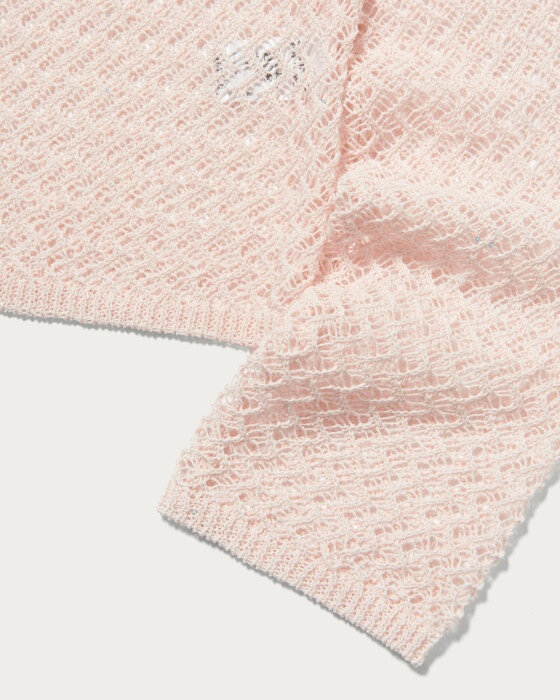 メッシュ調の透かし編みで作る衿付きカーデ。小さなスパンコールがMIXされており、さりげなくきらきら光るのでカジュアル過ぎない印象。春先にヘルシーに着れるトップスで、カジュアルにデニム合わせがおすすめ。スラックス合わせでモードな着こなしも素敵です。