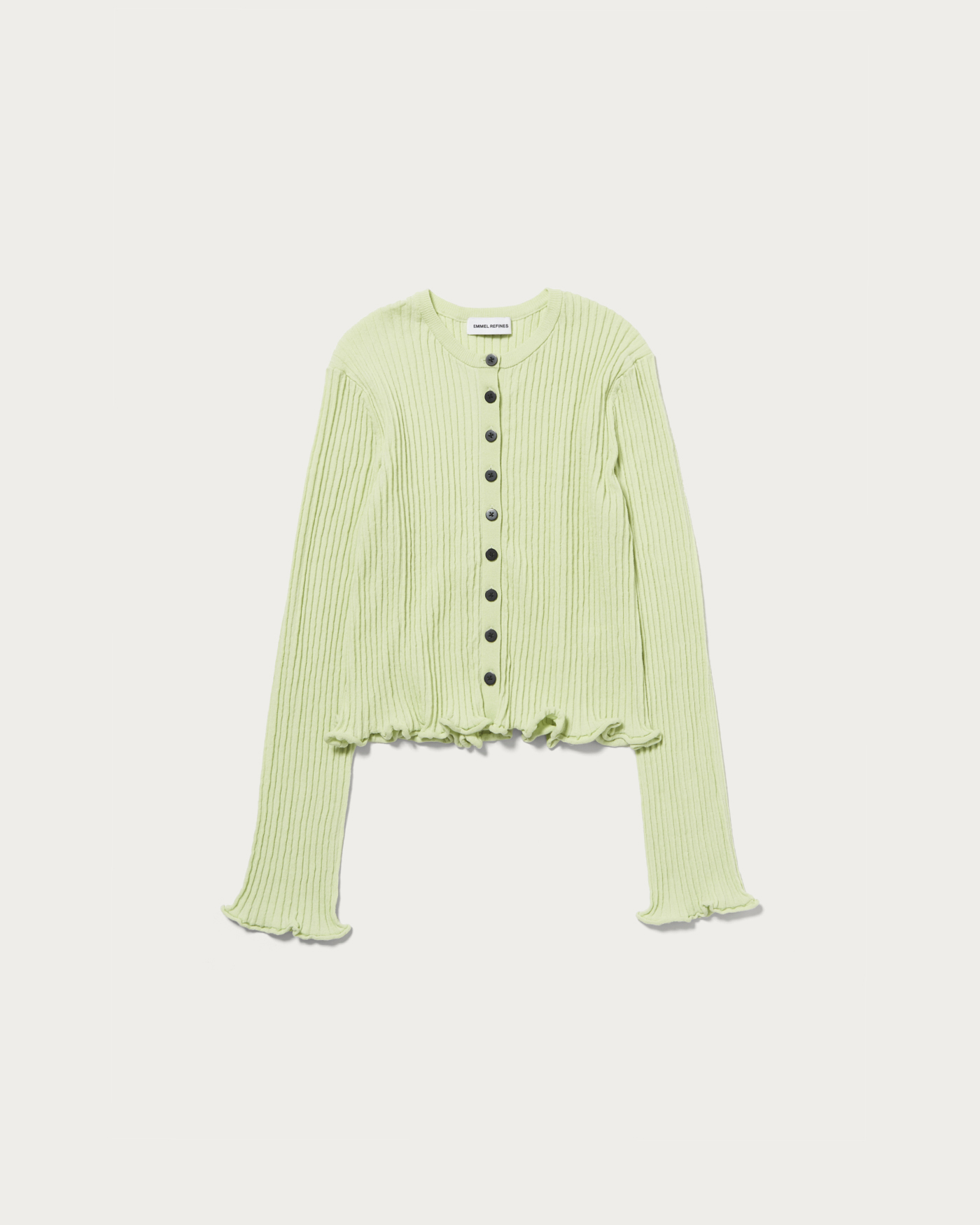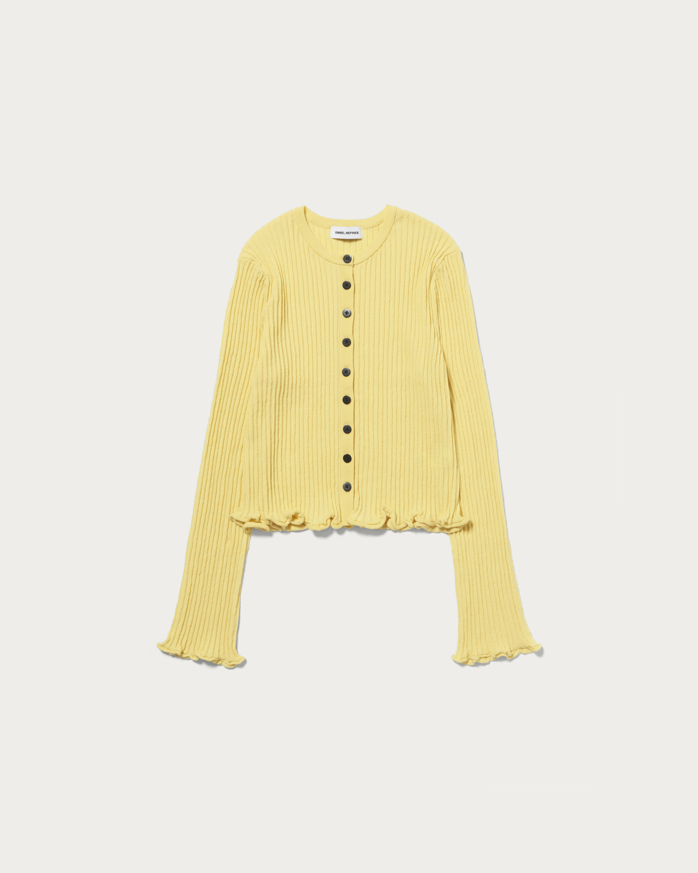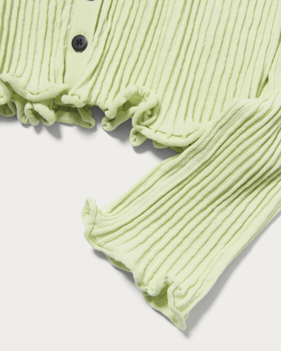 短丈でコンパクトに着れるリブカーデ。袖口と裾に施したさりげない波打ちディテールは編地変化で作っているのでフリルほど甘すぎず着回しやすい印象です。フロントに並べた配色釦もポイント。春らしい色鮮やかなカラー展開も魅力です。