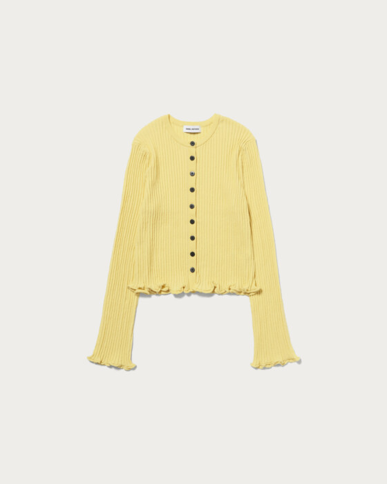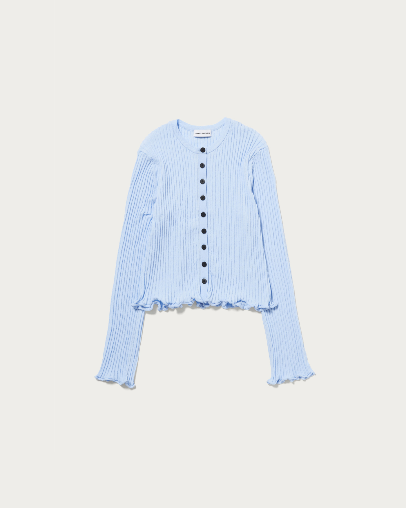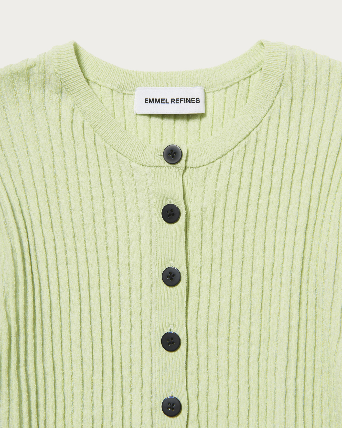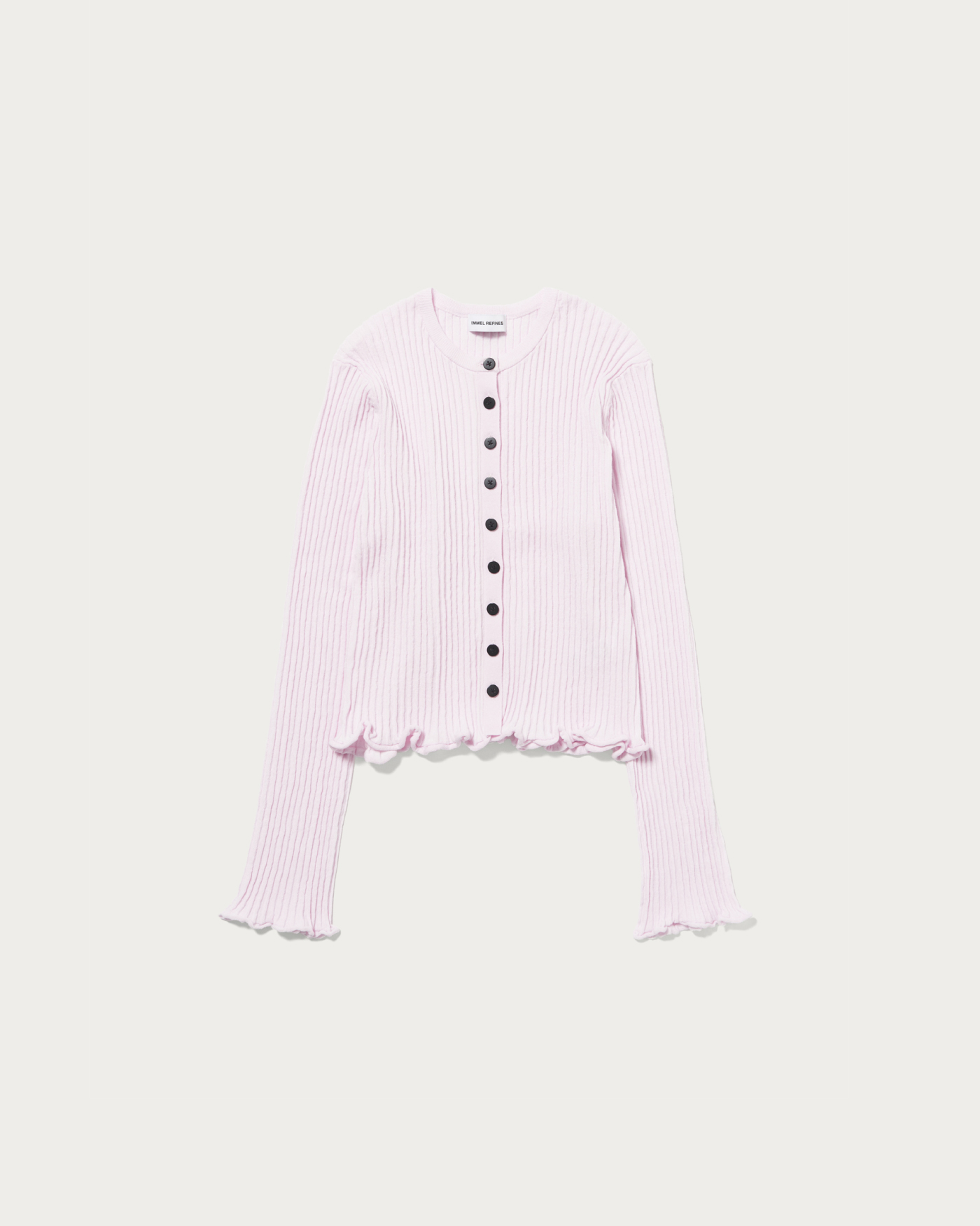 短丈でコンパクトに着れるリブカーデ。袖口と裾に施したさりげない波打ちディテールは編地変化で作っているのでフリルほど甘すぎず着回しやすい印象です。フロントに並べた配色釦もポイント。春らしい色鮮やかなカラー展開も魅力です。