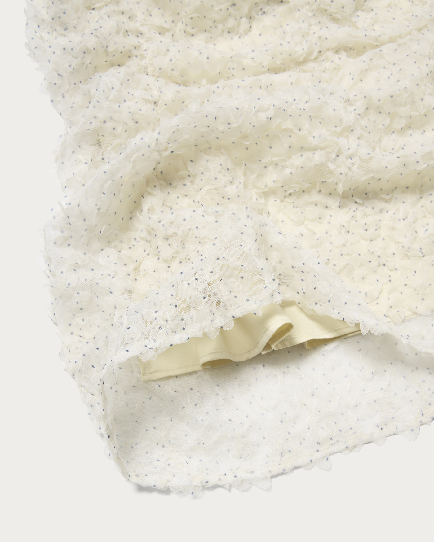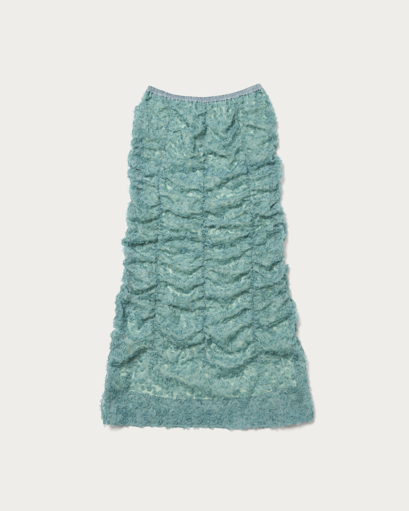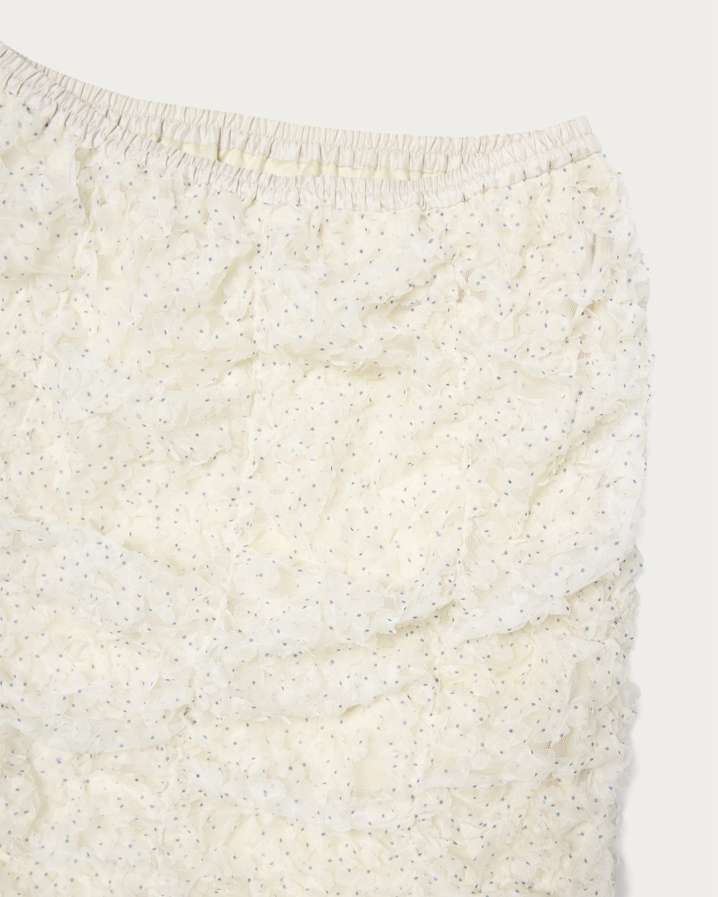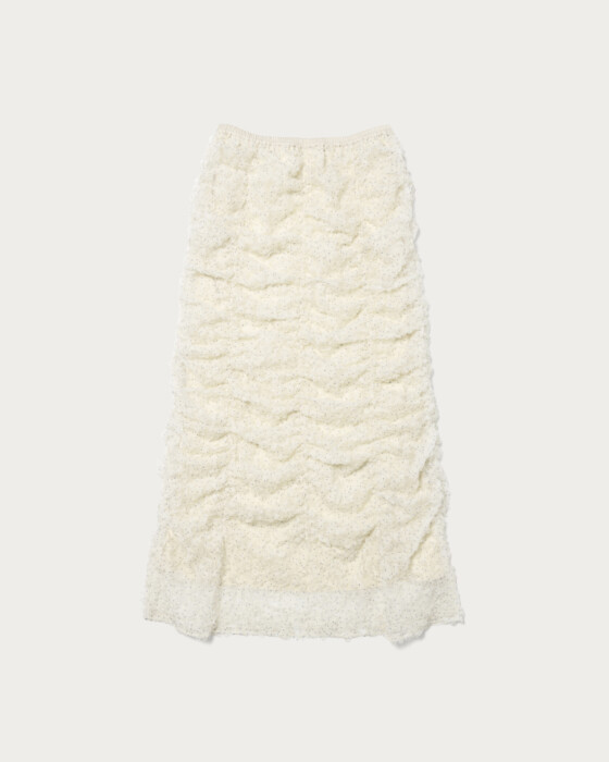 立体感のあるテープ刺繍素材が魅力のスカート。素材が映えているので形はシンプルなナローシルエットで、イージーに履けるようにウエストはゴム仕様です。ドットプリントした生地をフリフリと動きのあるテープ状にカットしたものをチュールに刺繍した贅沢な素材。クラフト感、立体感のある表情がトレンド感たっぷり。
