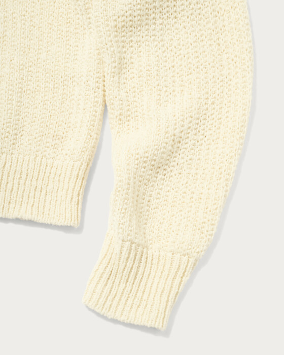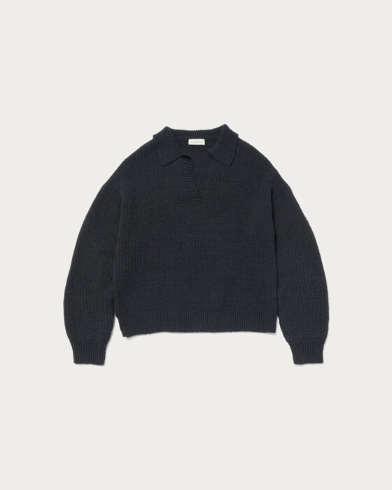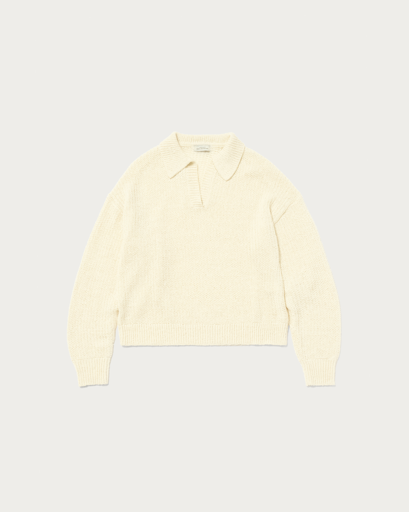 スキッパーデザインのテープヤーンニットは、カジュアルさと上品さを兼ね備えた一枚。素材ならではの表情のある編地で、シンプルながらもスタイリングのアクセントになってくれる一枚。トレンドのワイドパンツとも合わせやすいコンパクトな着丈がポイント。