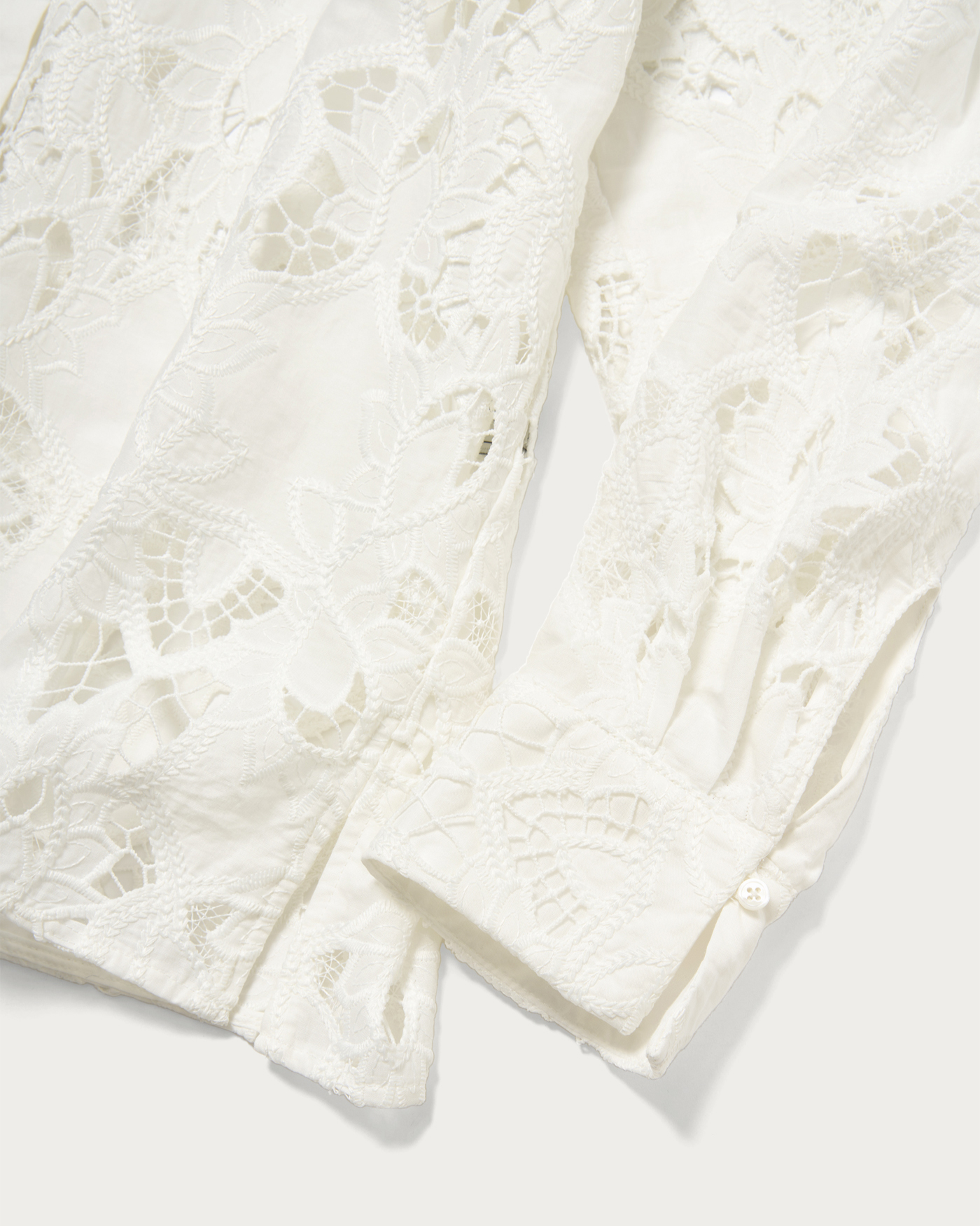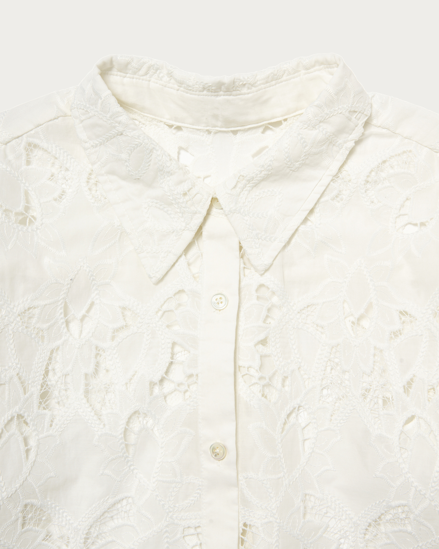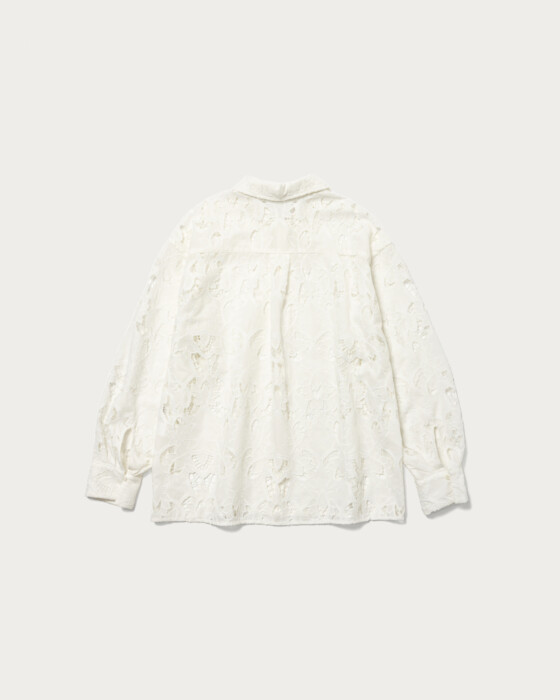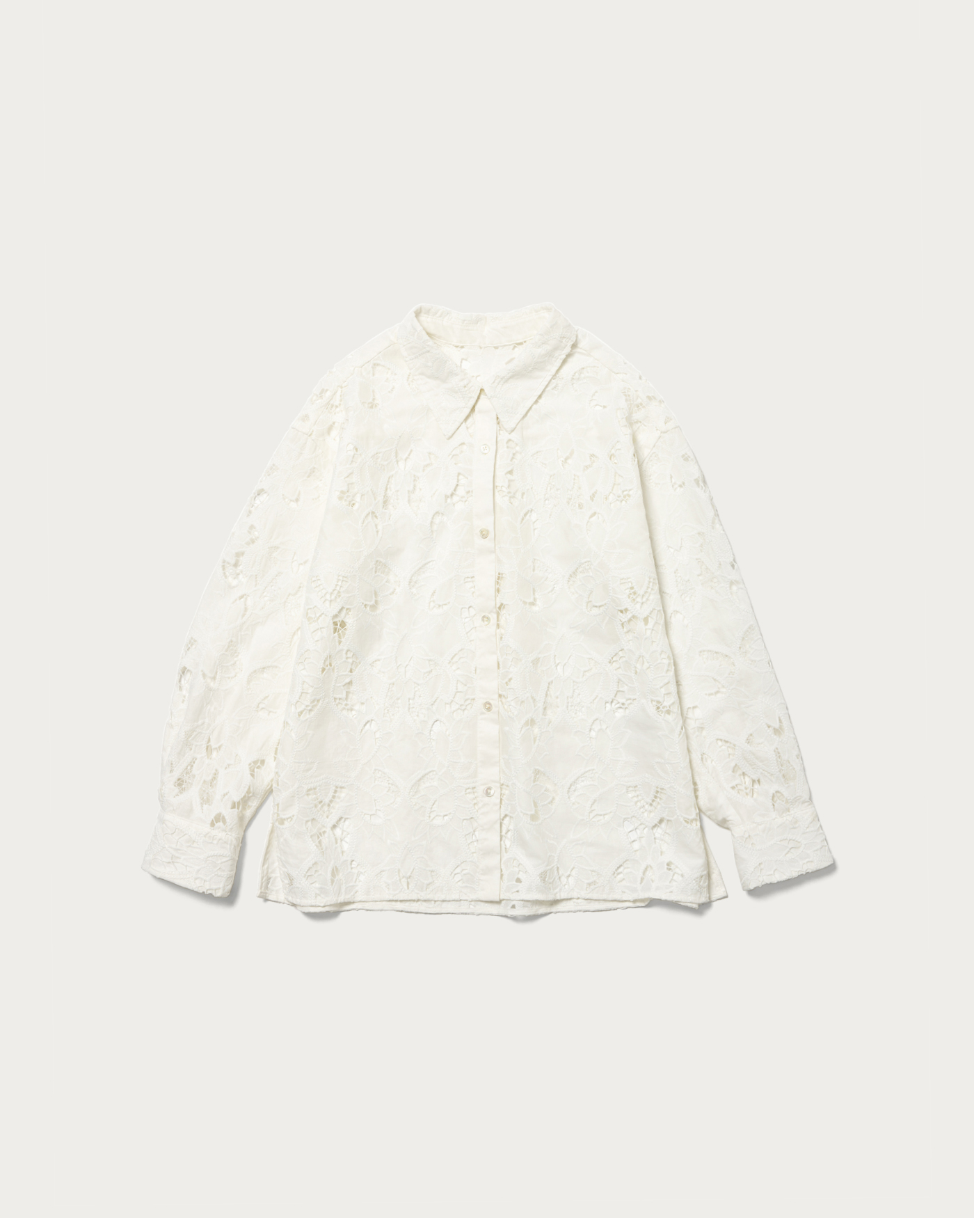 レース素材が目を惹くシャツは、レギュラーカラーと大きめの柄で甘すぎないデザインに。ナチュラルな風合いが魅力で、カットソーやタンクトップに合わせて着るだけで、いつものコーディネートにさりげなくこなれ感がプラスされます。