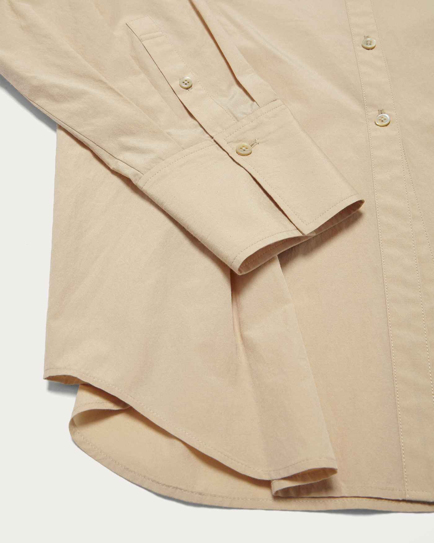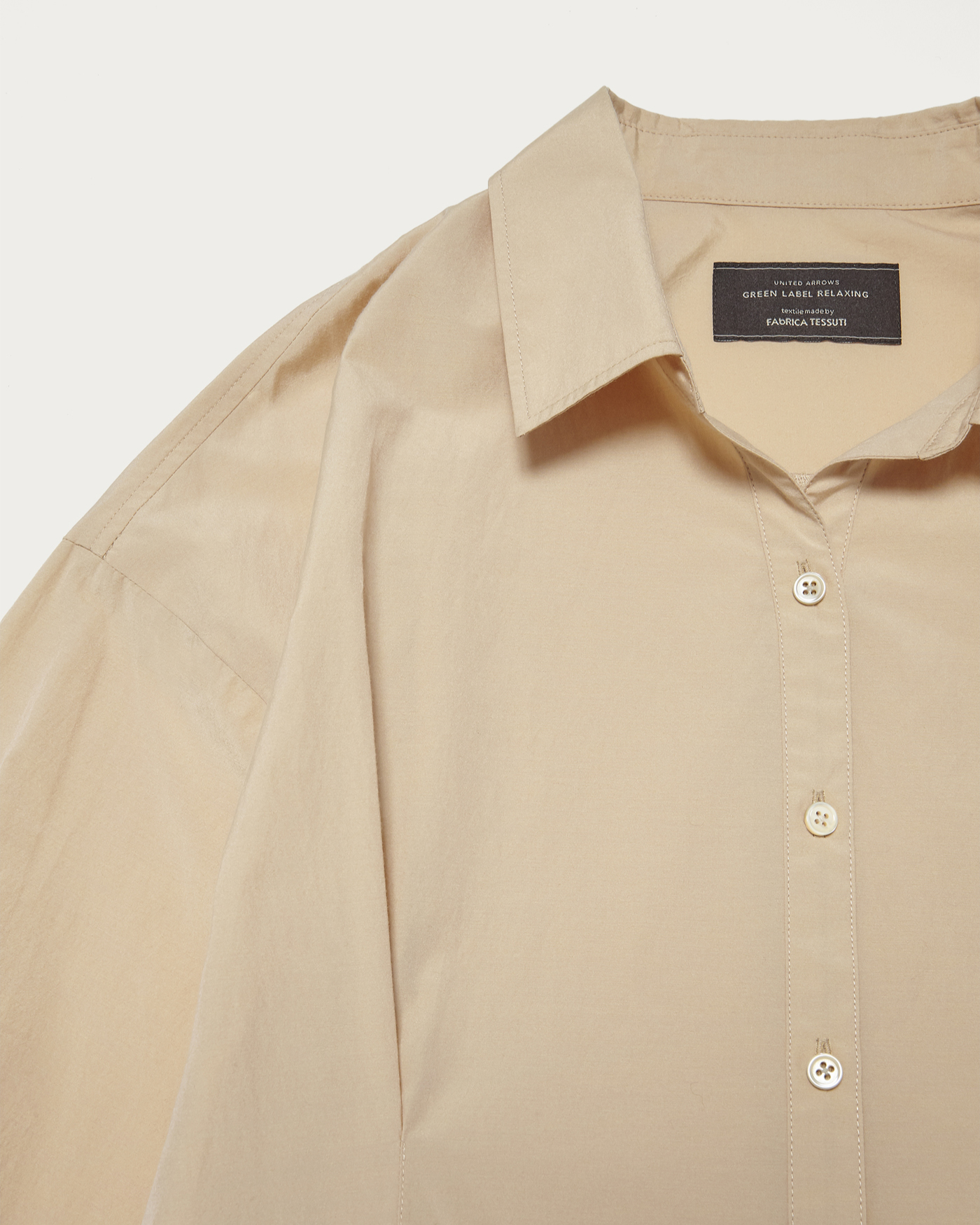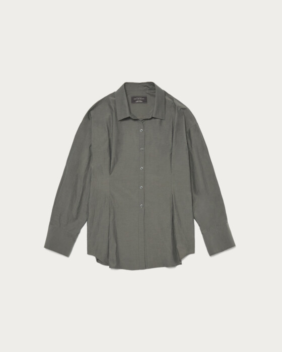 イタリアのFAbRICA社のコットンポリエステル生地を使用したシャツ。顔周りがすっきりと見えるスキッパーデザインで、ウエスト部分にタックを入れることで程よく体に沿うフィット感と縦ラインを作りました。同素材のキャミソールとパンツと合わせたスタイリングもオススメ。