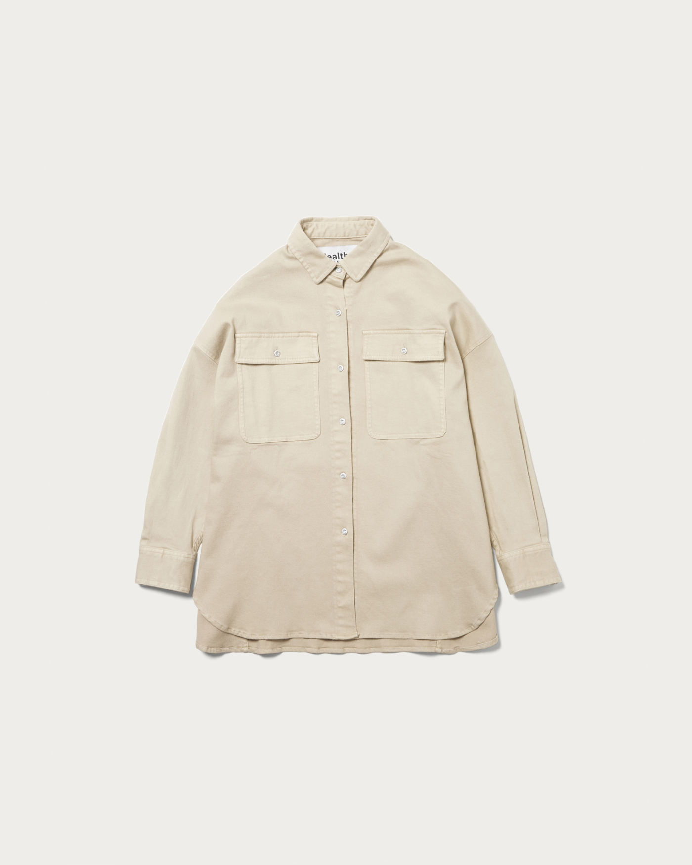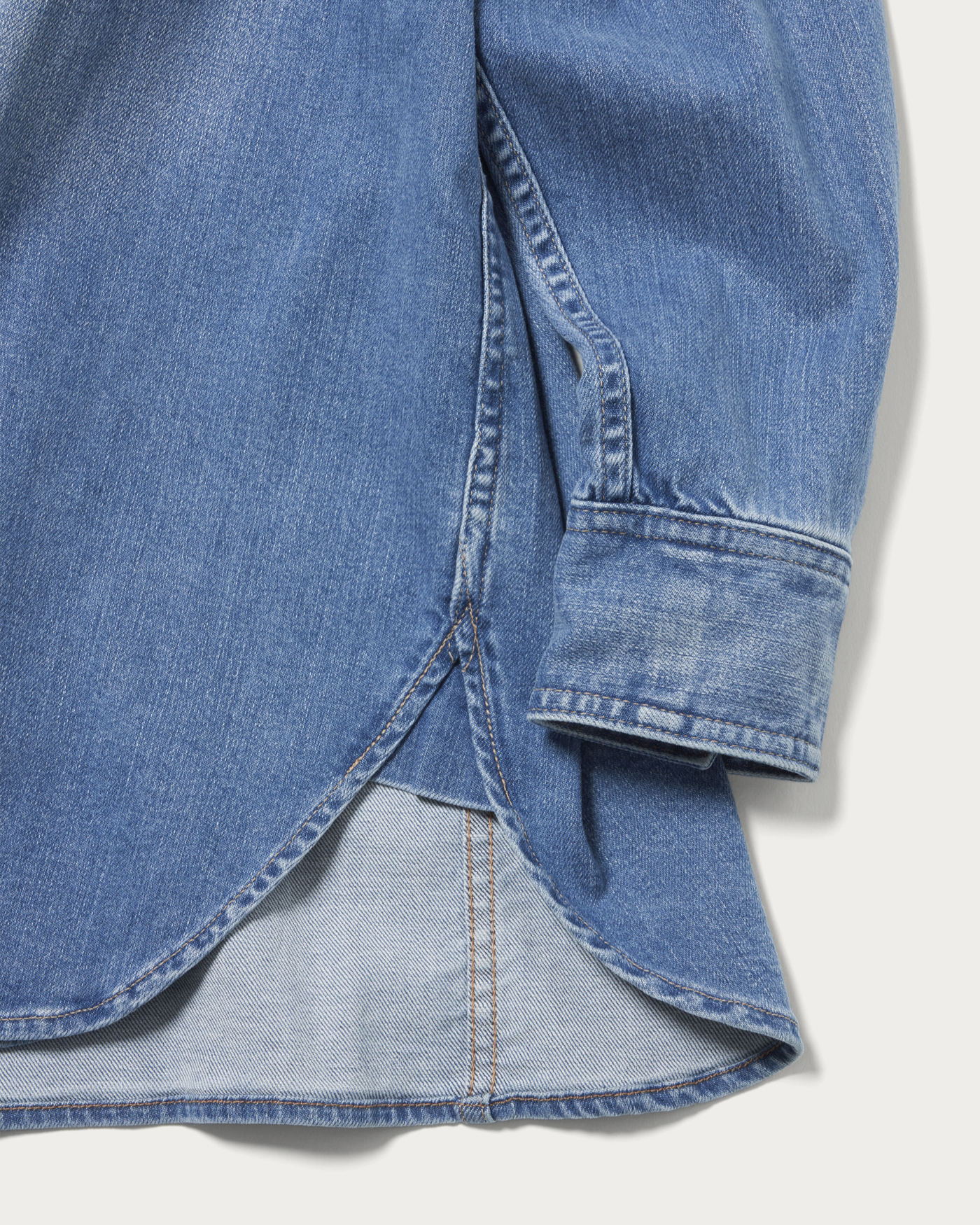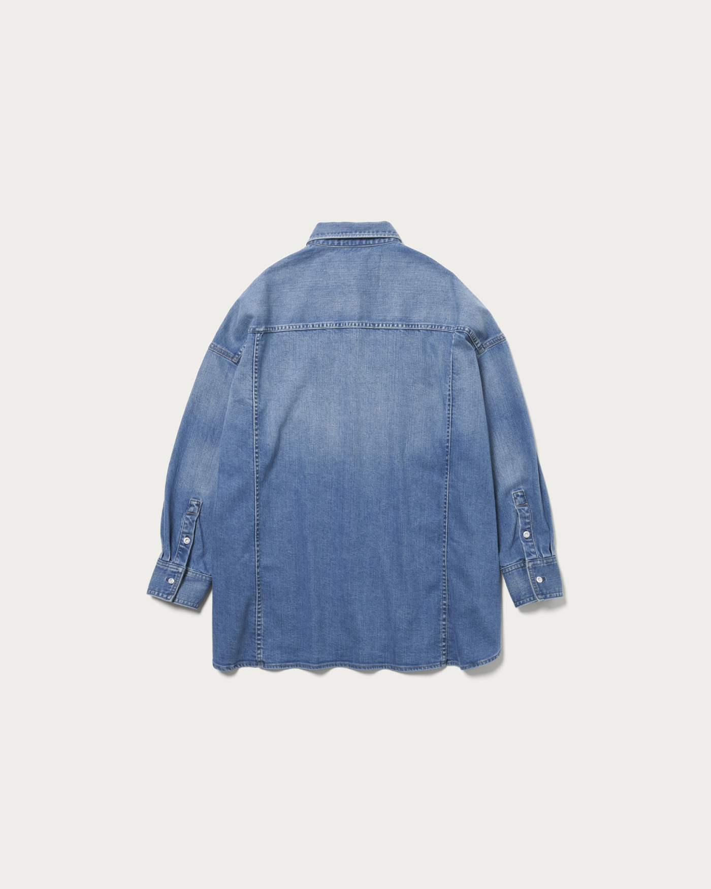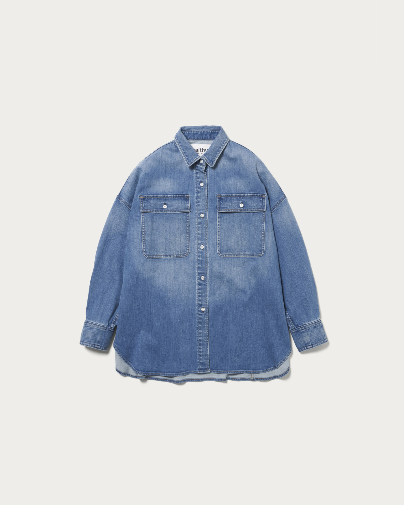 〈ヘルシーデニム〉らしい美しいフォルムが際立つデニムアイテムを別注。体を包み込まれるようなサイズ感がデザインポイントになっているスーパービッグ・シャツのAlmondをベースに着丈を5cm短くした別注品になります。丈を調整したことで、パンツ以外にもボリュームのあるスカートでも重たくなりすぎず着用することができます。