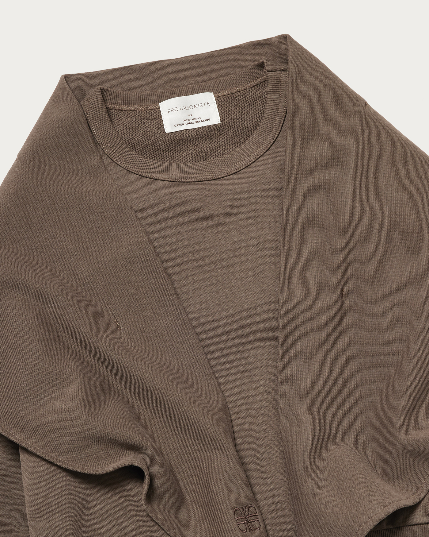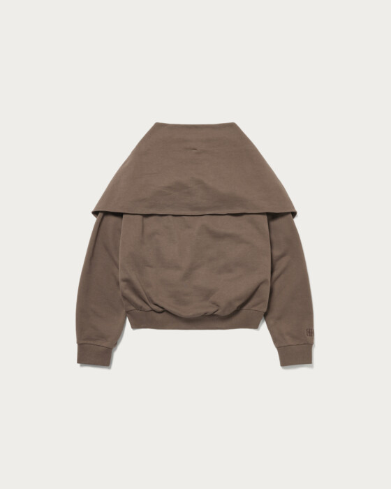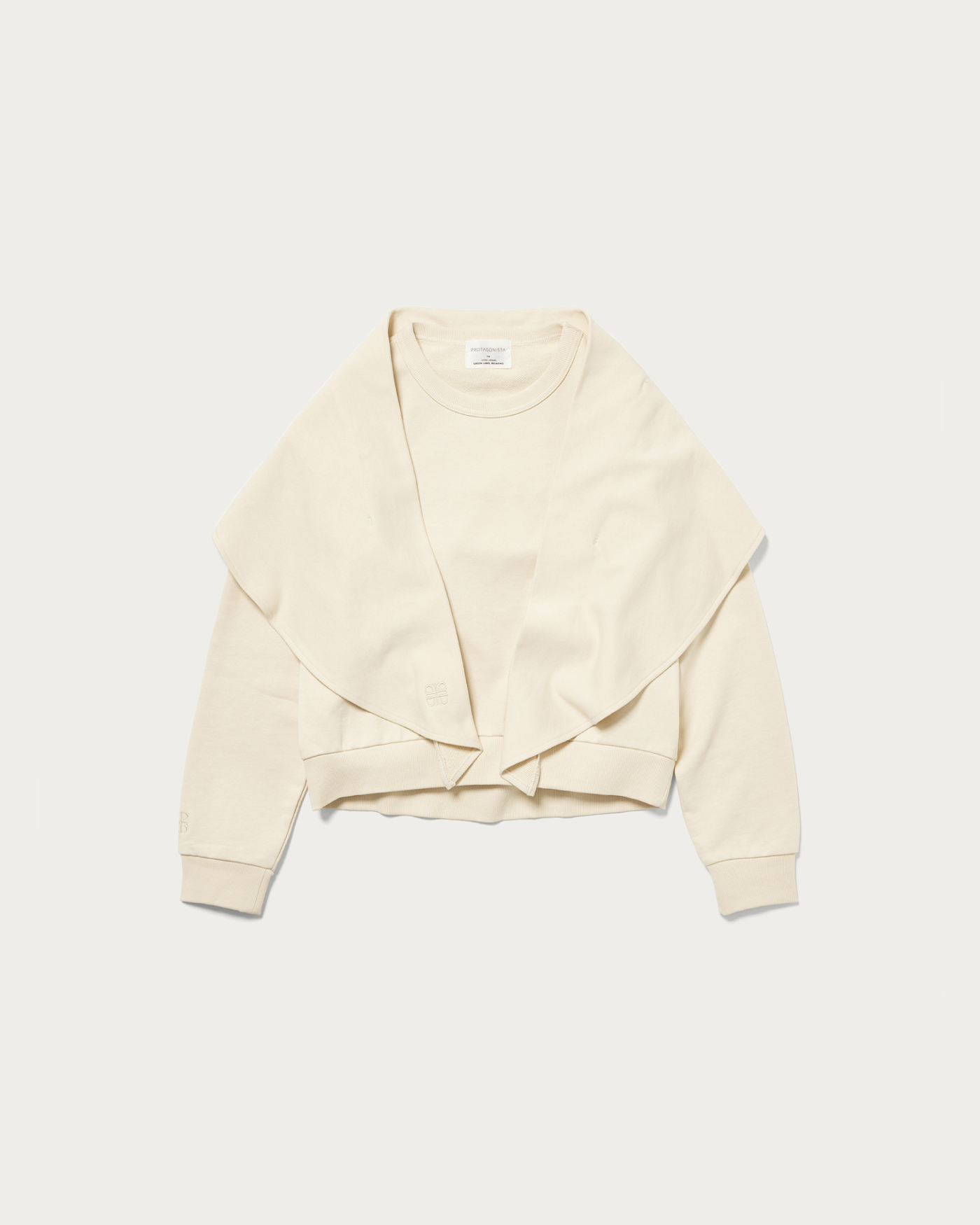 〈プロタゴニスタ〉のスカーフ付きスウェットの生地を少し薄くし、ロングシーズン着用できるよう軽く仕上げました。ワンポイントでブランドロゴを刺繍しています。スカーフは、首や頭、腰など様々な用途で着用いただけるので、一つ持っておくとコーディネートの幅が広がる万能アイテムです。