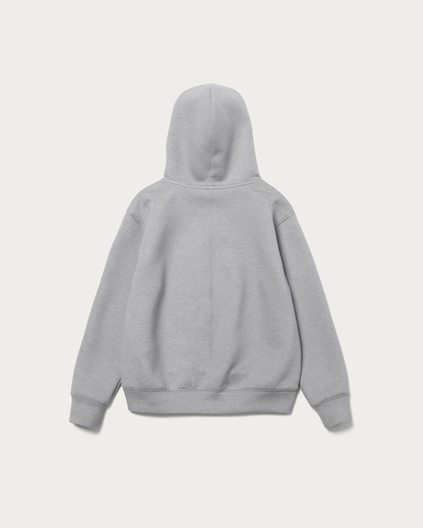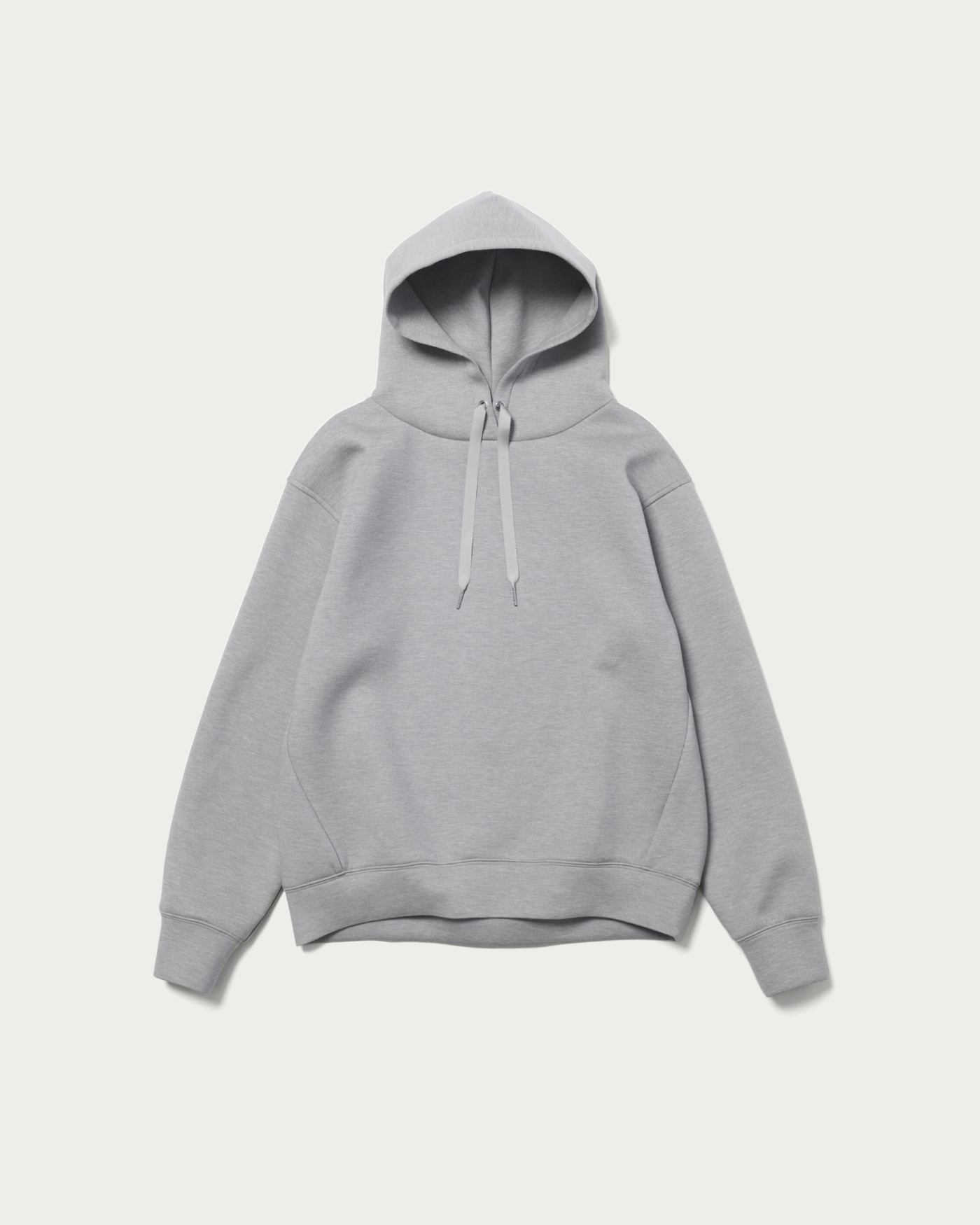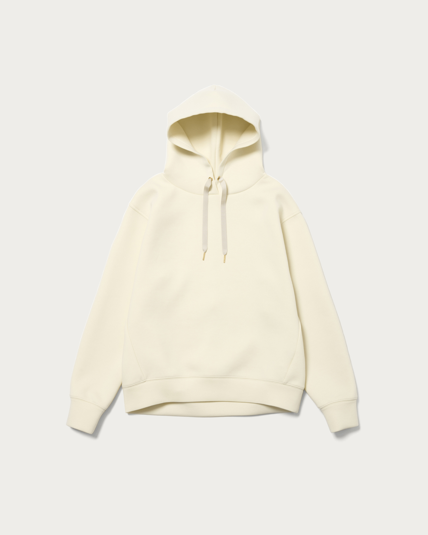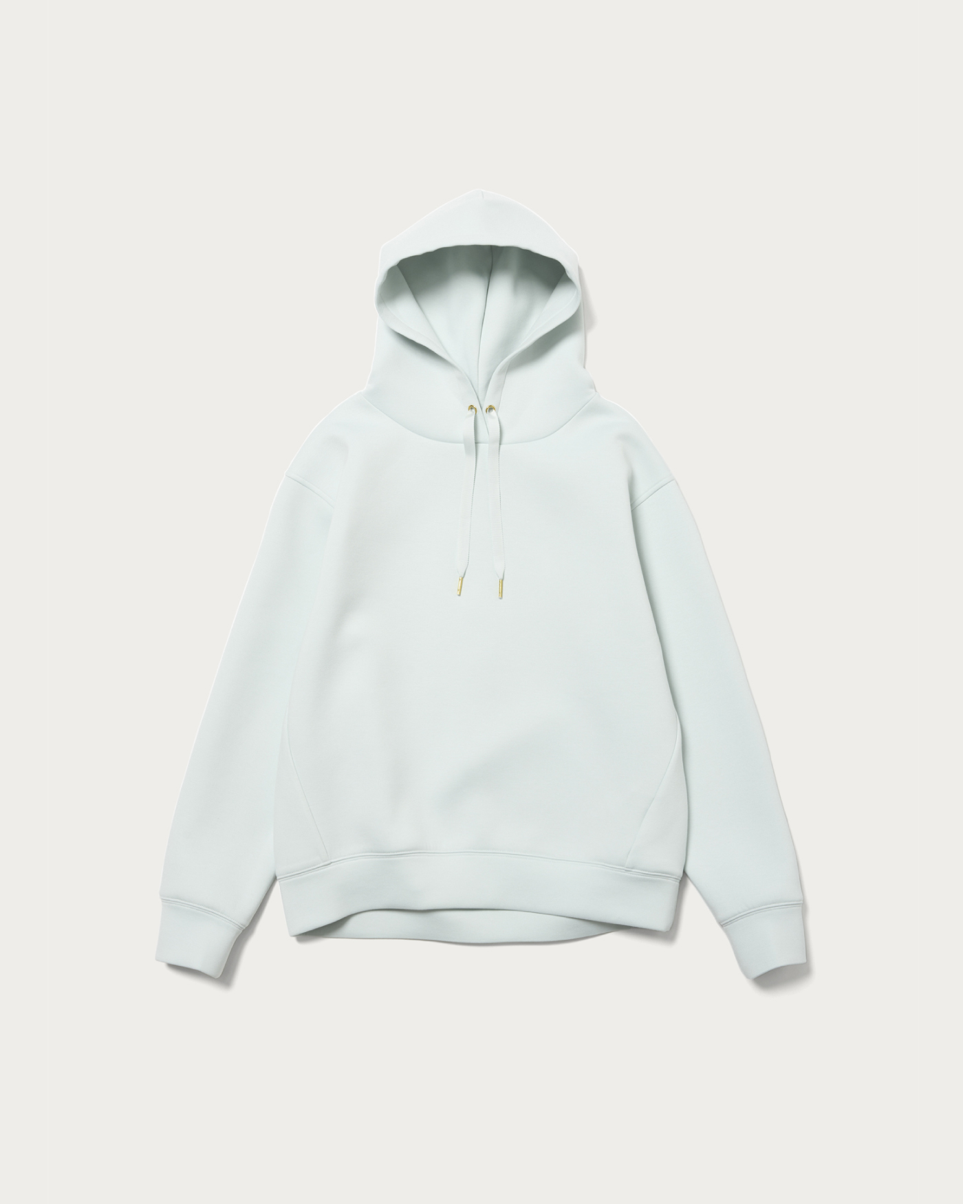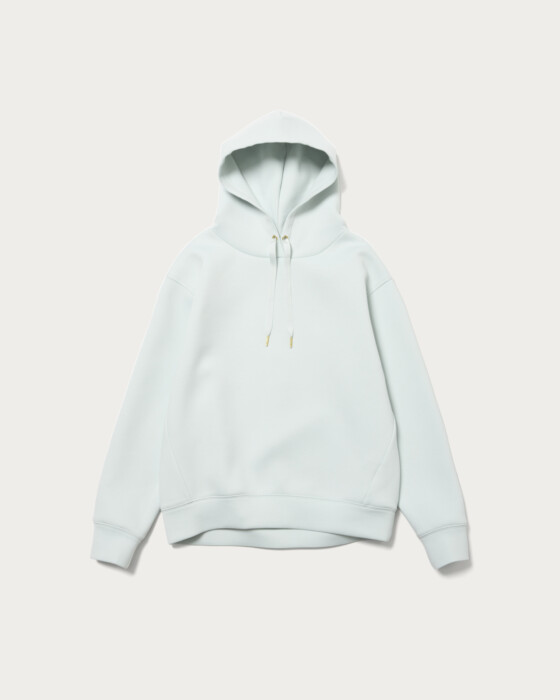 定番人気のダンボールフーディは、素材ならではの肉感と柔らかさで着心地抜群。適度にゆとりのあるサイジングで、レイヤードスタイルも楽しめます。フードのフロント部分の紐の先端にはきらっと光る金具をつけることで、カジュアルすぎない印象に仕上げました。