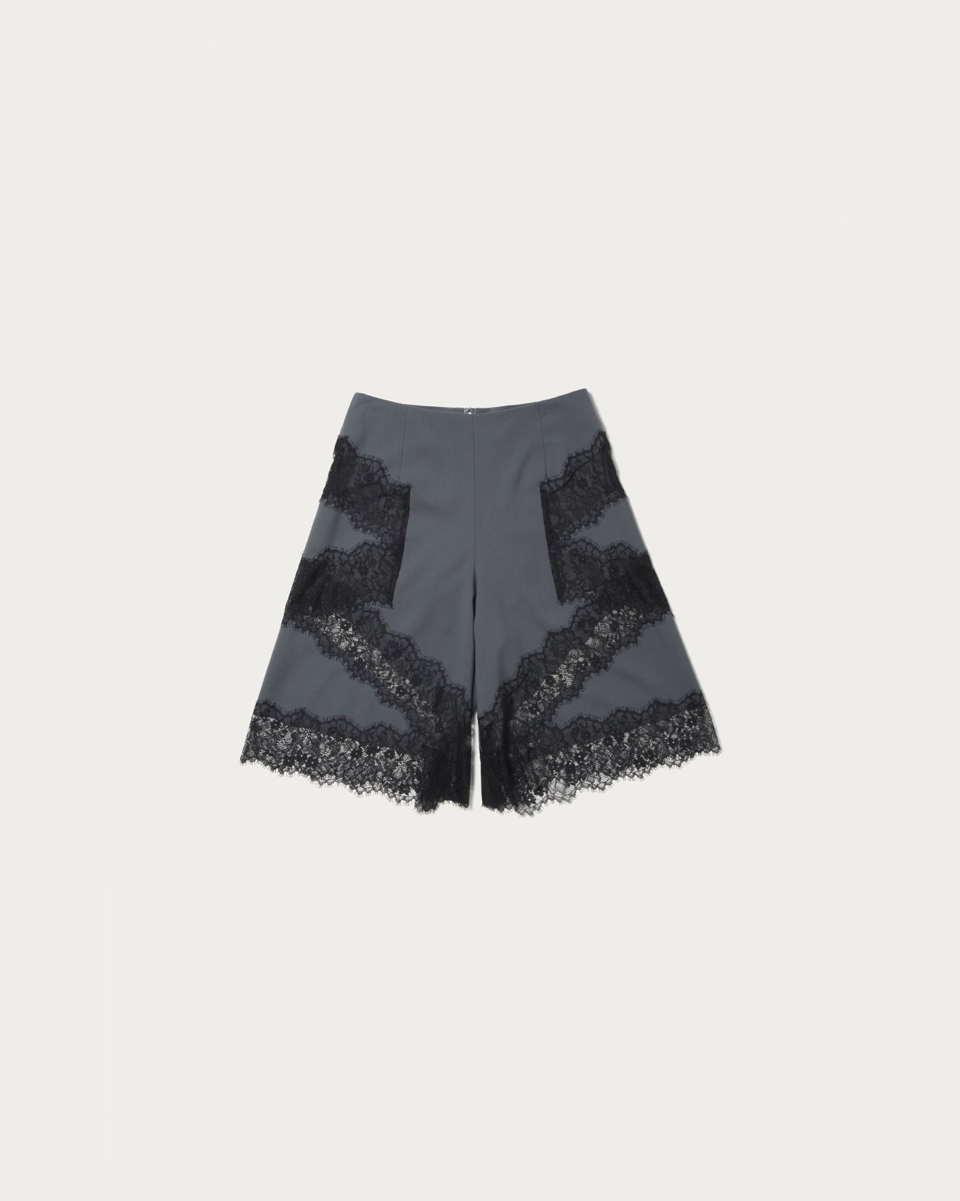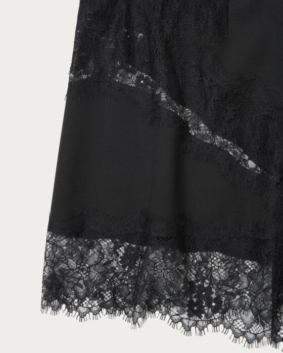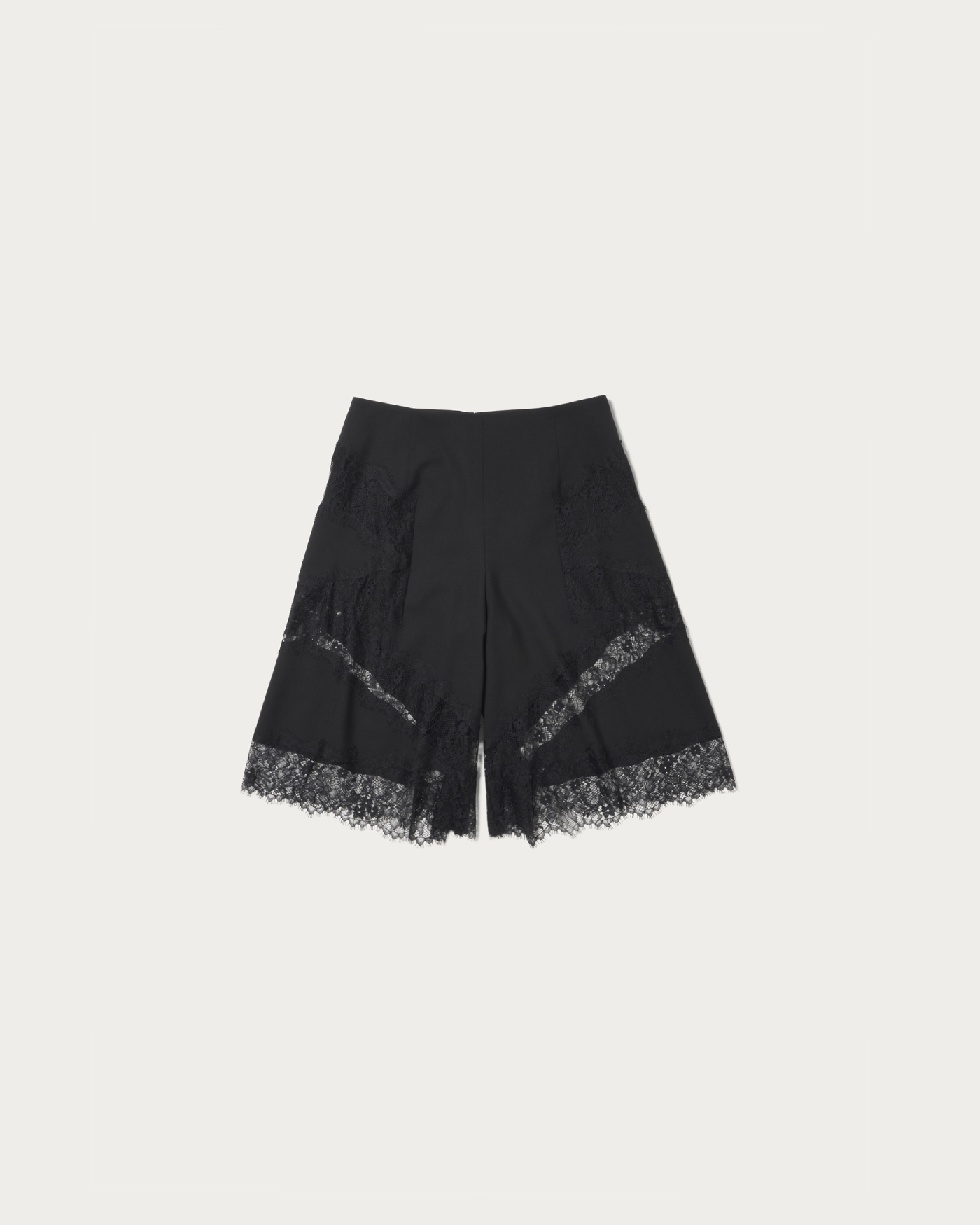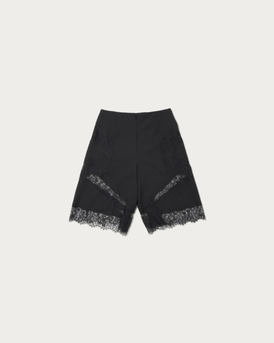 ハリのある素材に繊細なレースを組み合わせたアンダーパンツ付きハーフパンツ。裾だけでなく脇まではめ込んだレースのデザインがポイントです。同素材のボトムスとセットアップでの着用もオススメ。