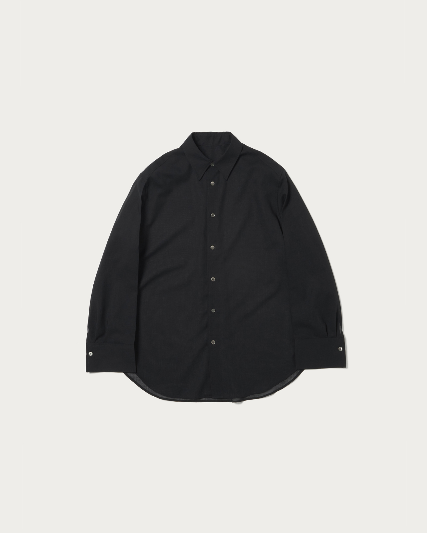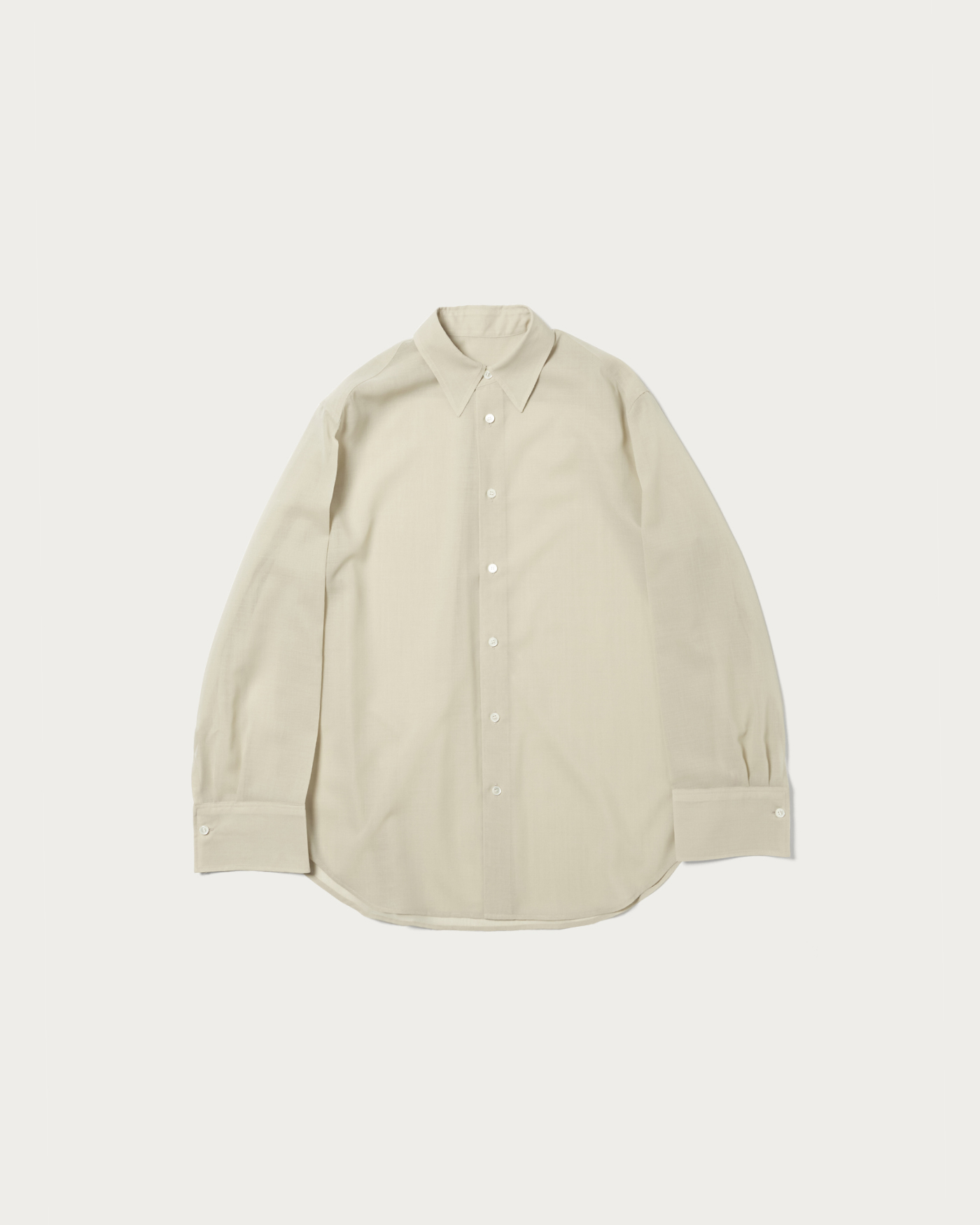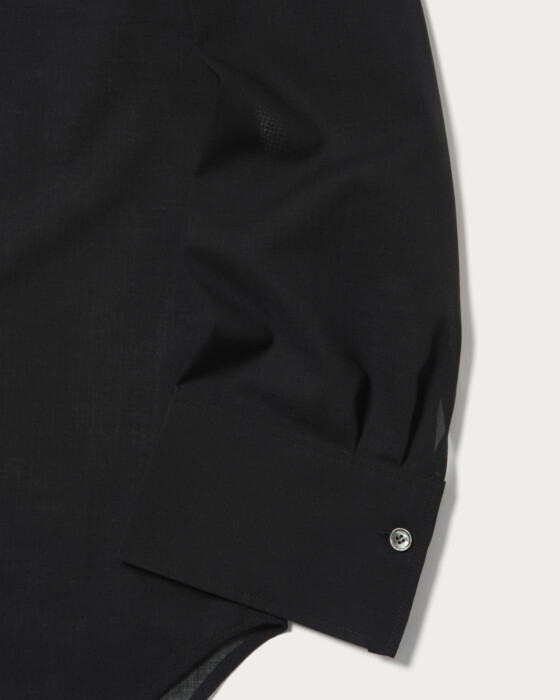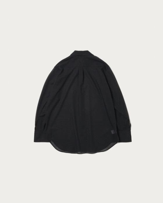 メンズのドレスシャツ風デザイン&透け素材のバランスがポイントのシアーシャツ。毛羽立ちの少ないすっきりとした表面感の毛とポリエステルボイル素材は、毛高混率ならではの上品な透け感があります。