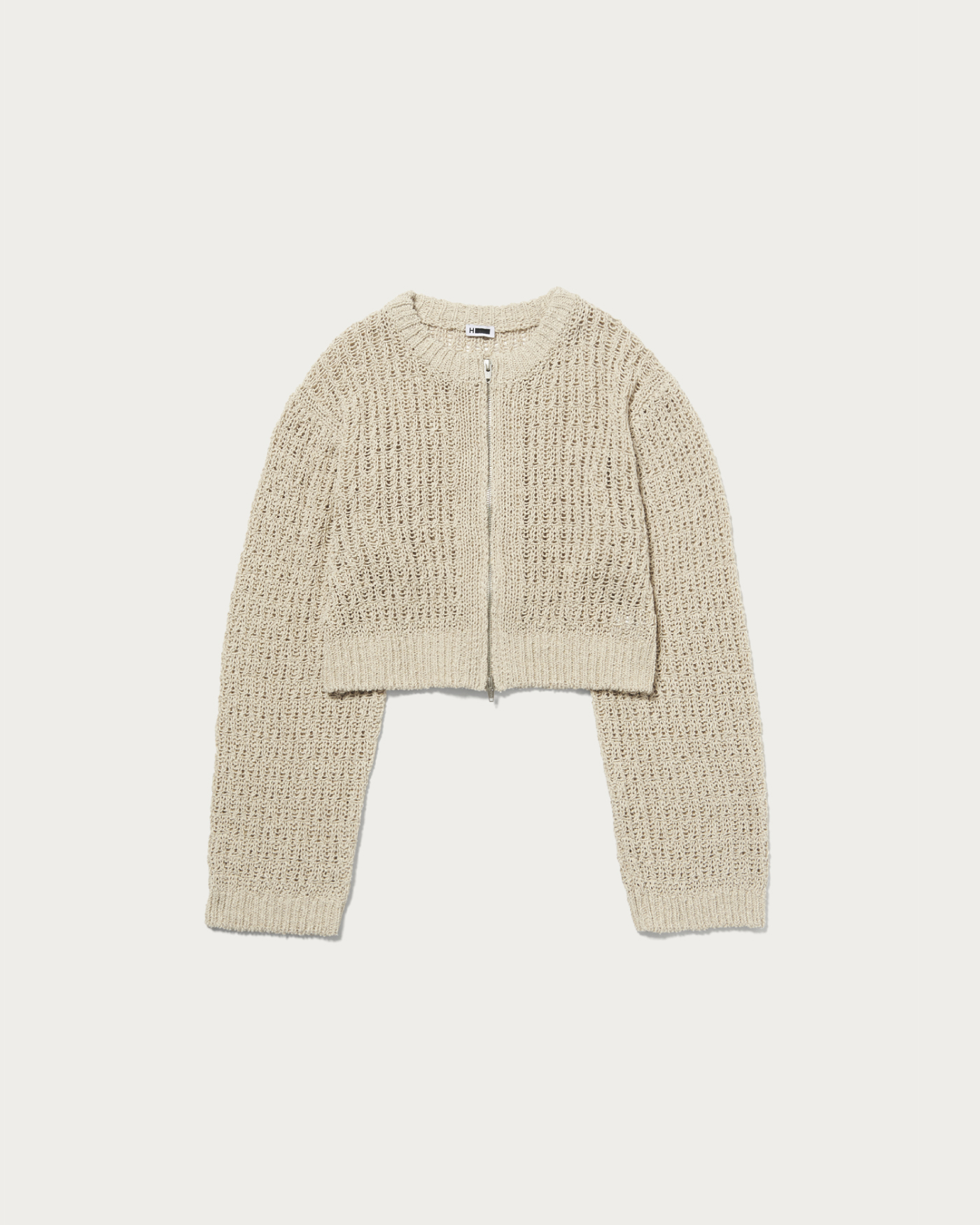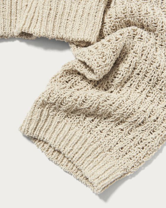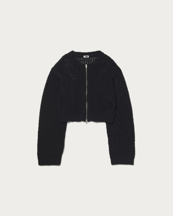 太番手の糸で透かし編にしたジップカーディガン。ローゲージならではの膨らみ感のあるアイテムです。ヴィンテージ感のある染色がポイントのコットンリネンシルクの太番手を使用。