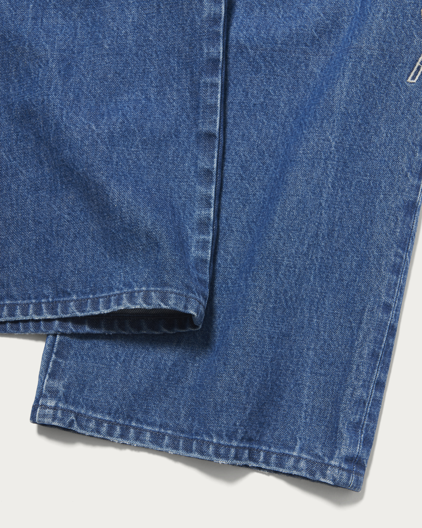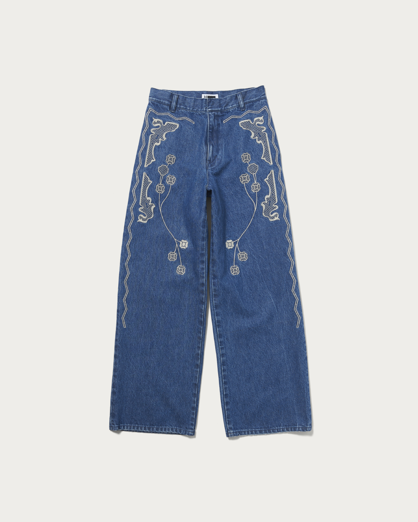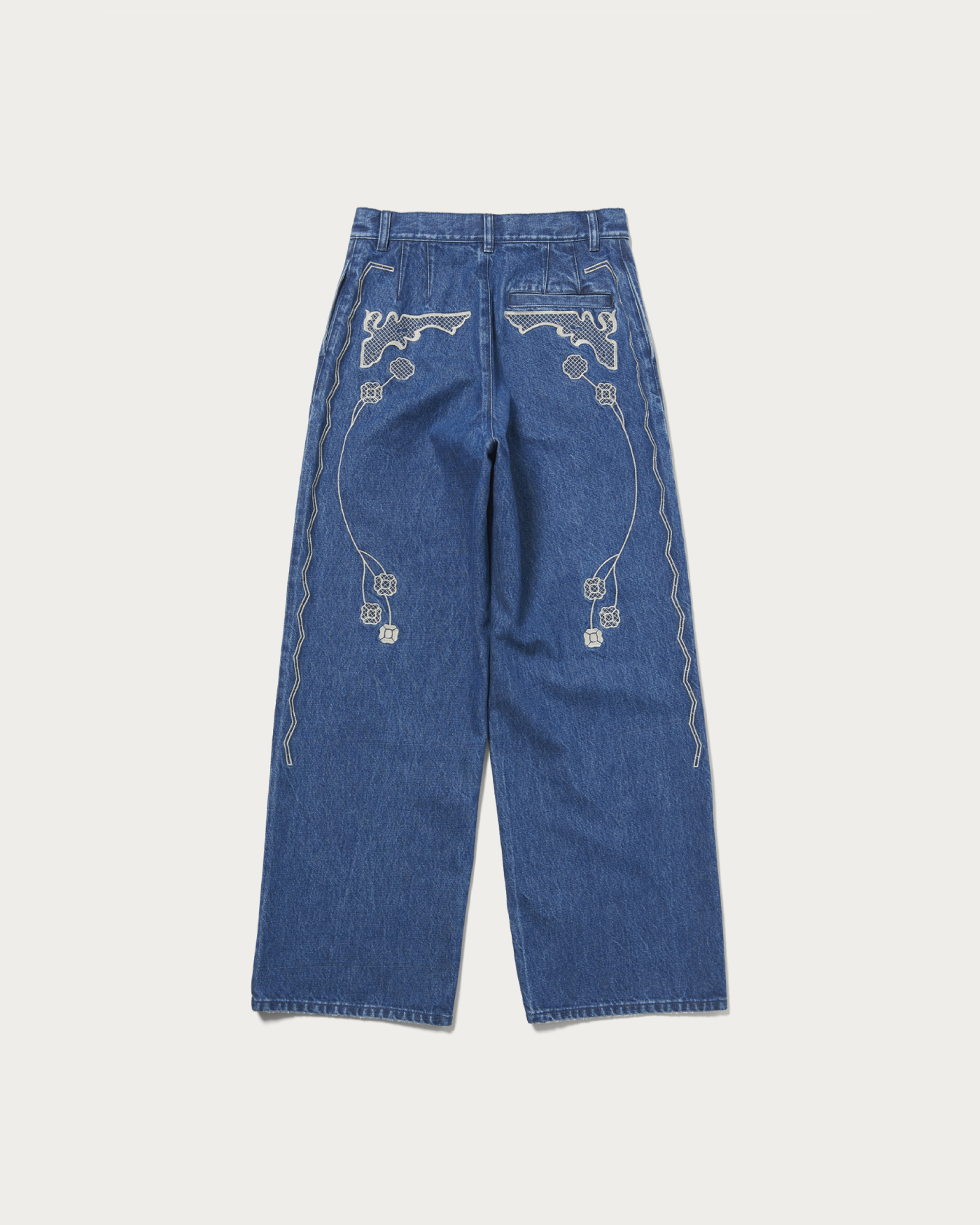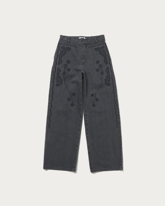 前後に刺繍の入ったワイドストレートシルエットのデニムトラウザー。13ozデニムを使用し、刺繡してから加工を施しています。スタイリングの主役になるアイテム。