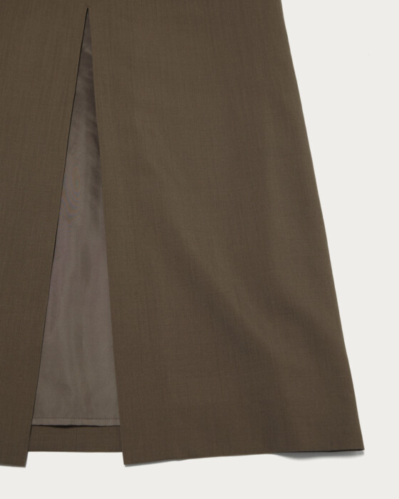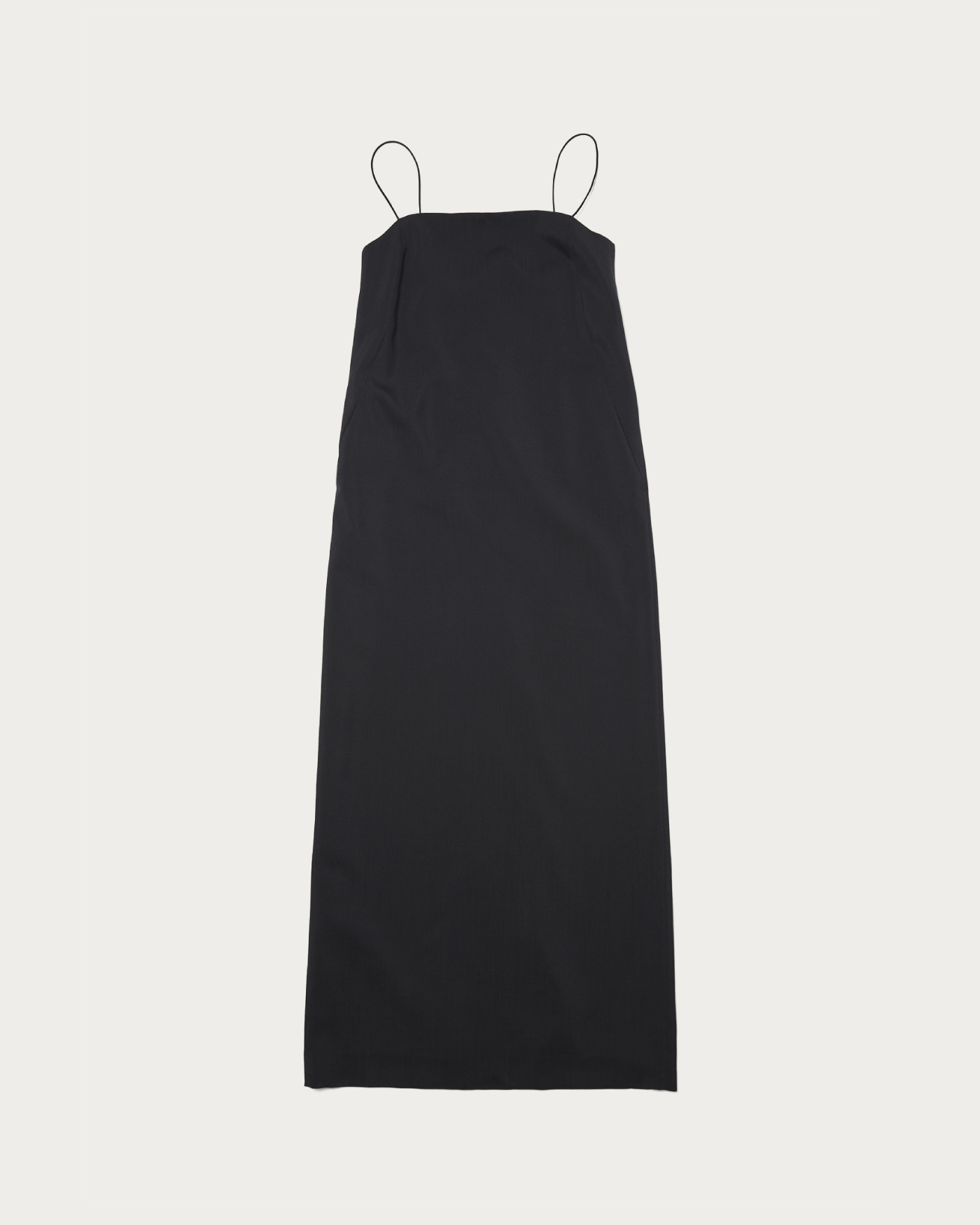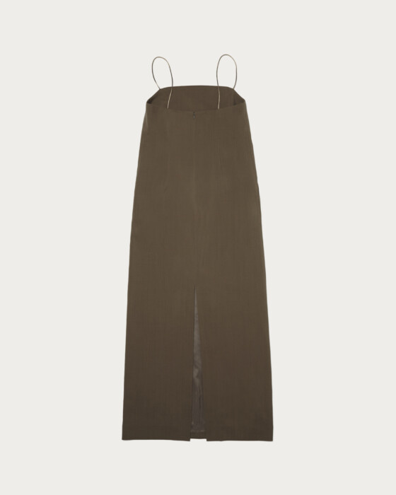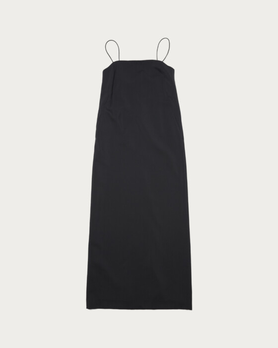 サテン調の細い肩紐、ゆるく弧を描くネックラインでシンプルながらムードのあるキャミソールドレス。含浸加工を施し張り感を出した毛100%のトロ素材を使用しています。