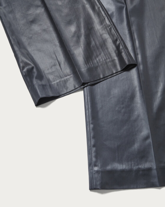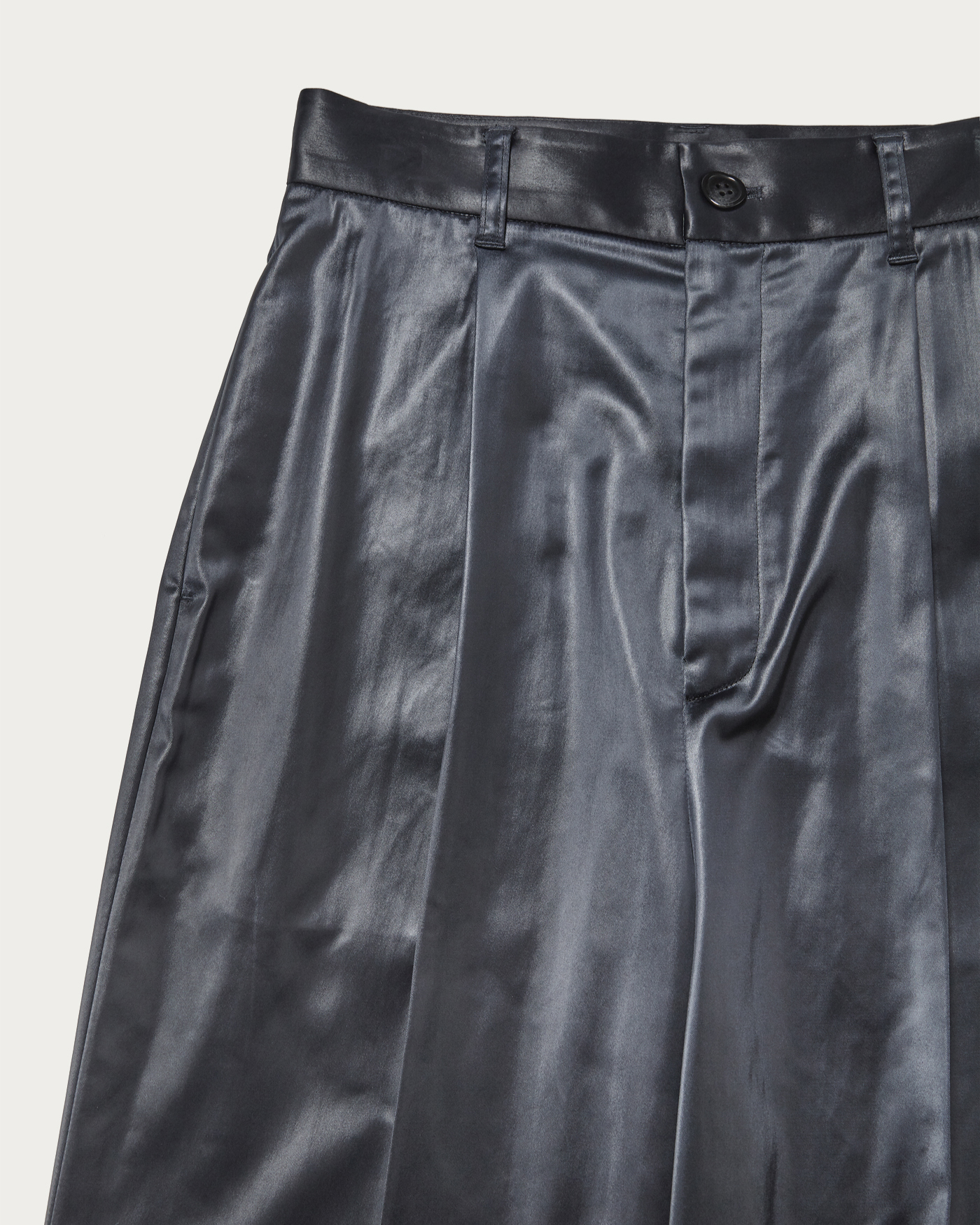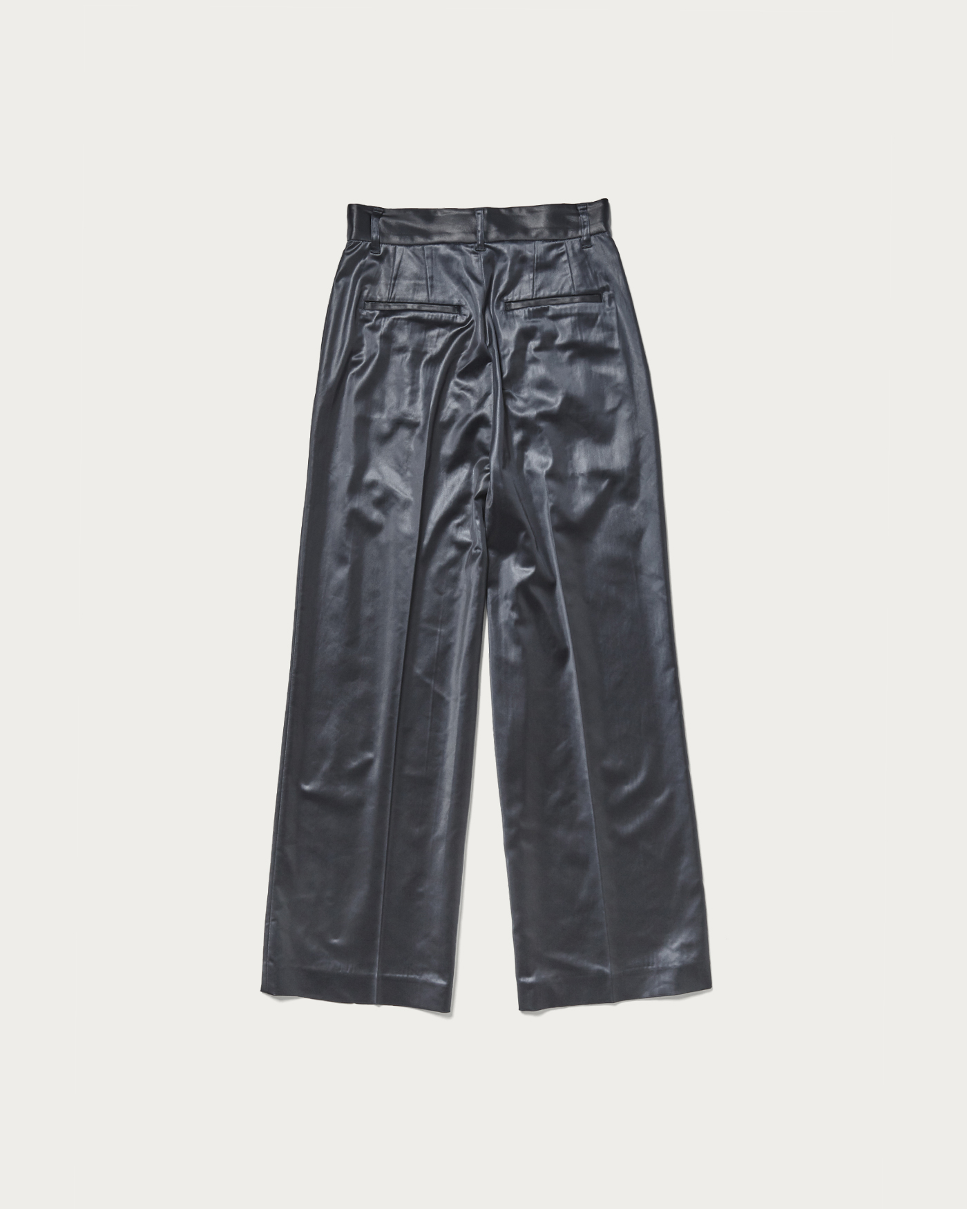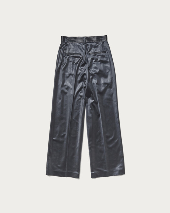 光沢のあるサテン素材でお作りしたストレートパンツ。1タックで程よくゆとりがありながらワイド過ぎないストレートですっきりしたシルエットにが特徴。取り入れやすいシンプルなデザインとレザーライクな素材感でコーディネートの主役になる1着。