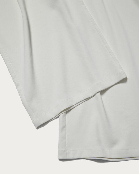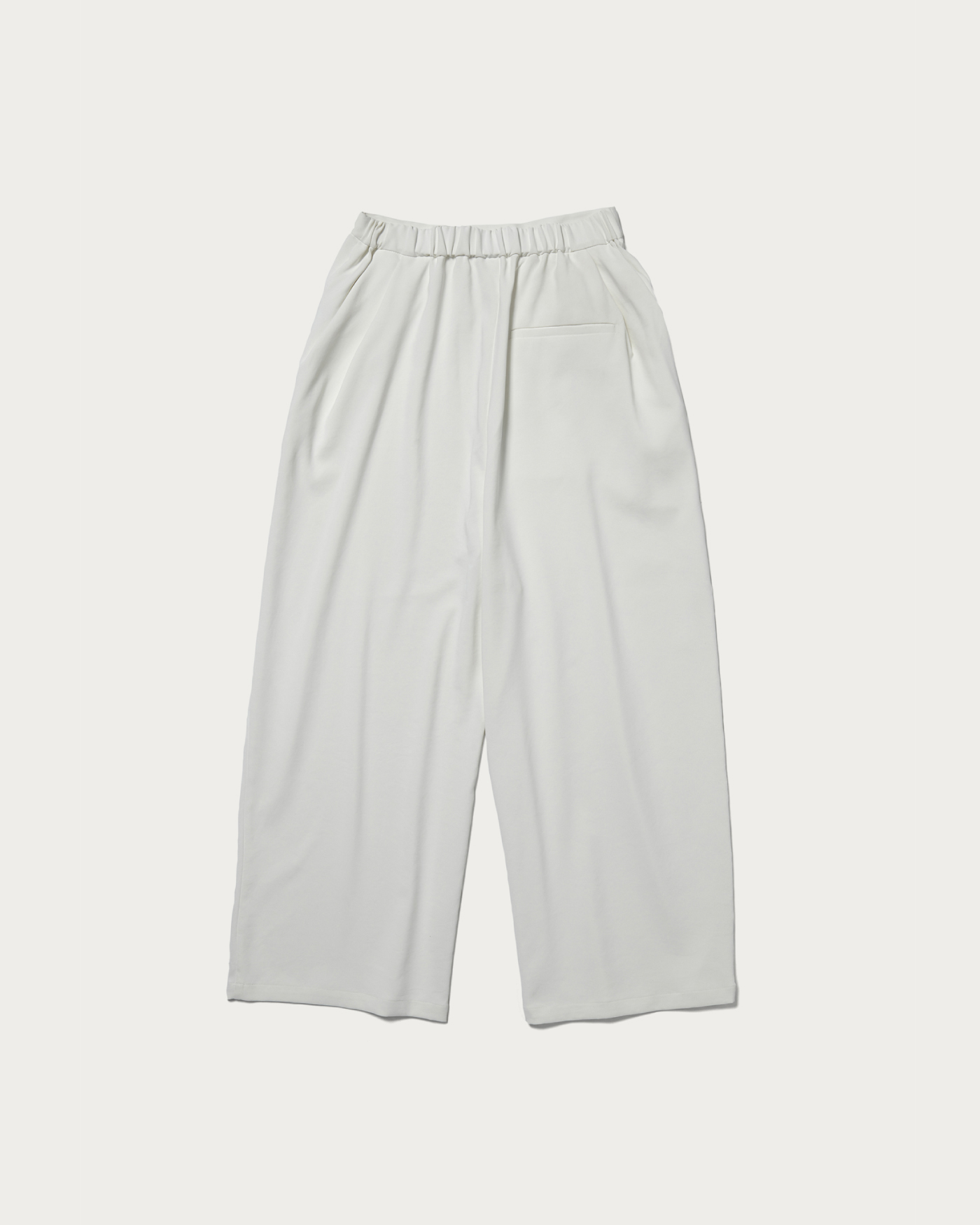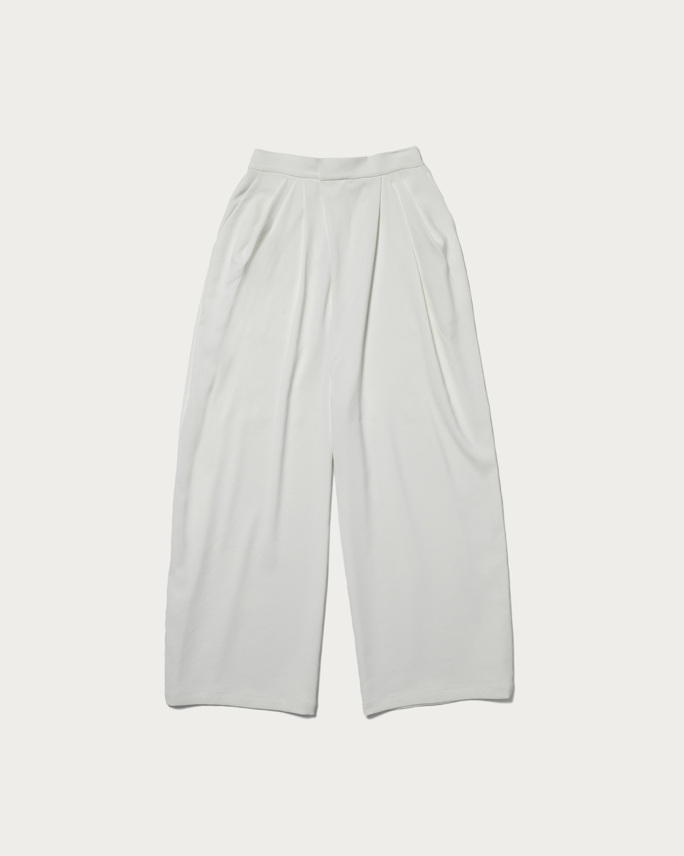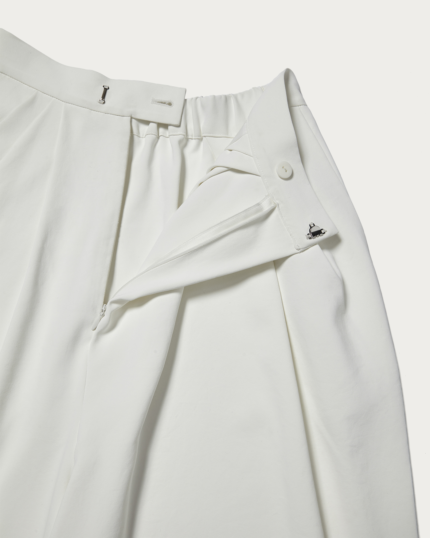 コクーンシルエットのデザインパンツ。大胆に施したタック、程よいラップデザインで腰回りにボリュームをもたせ、マルゥらしいコクーンシルエットに仕上げました。ウエストは後ろにゴムを施し履きやすさにもこだわりました。