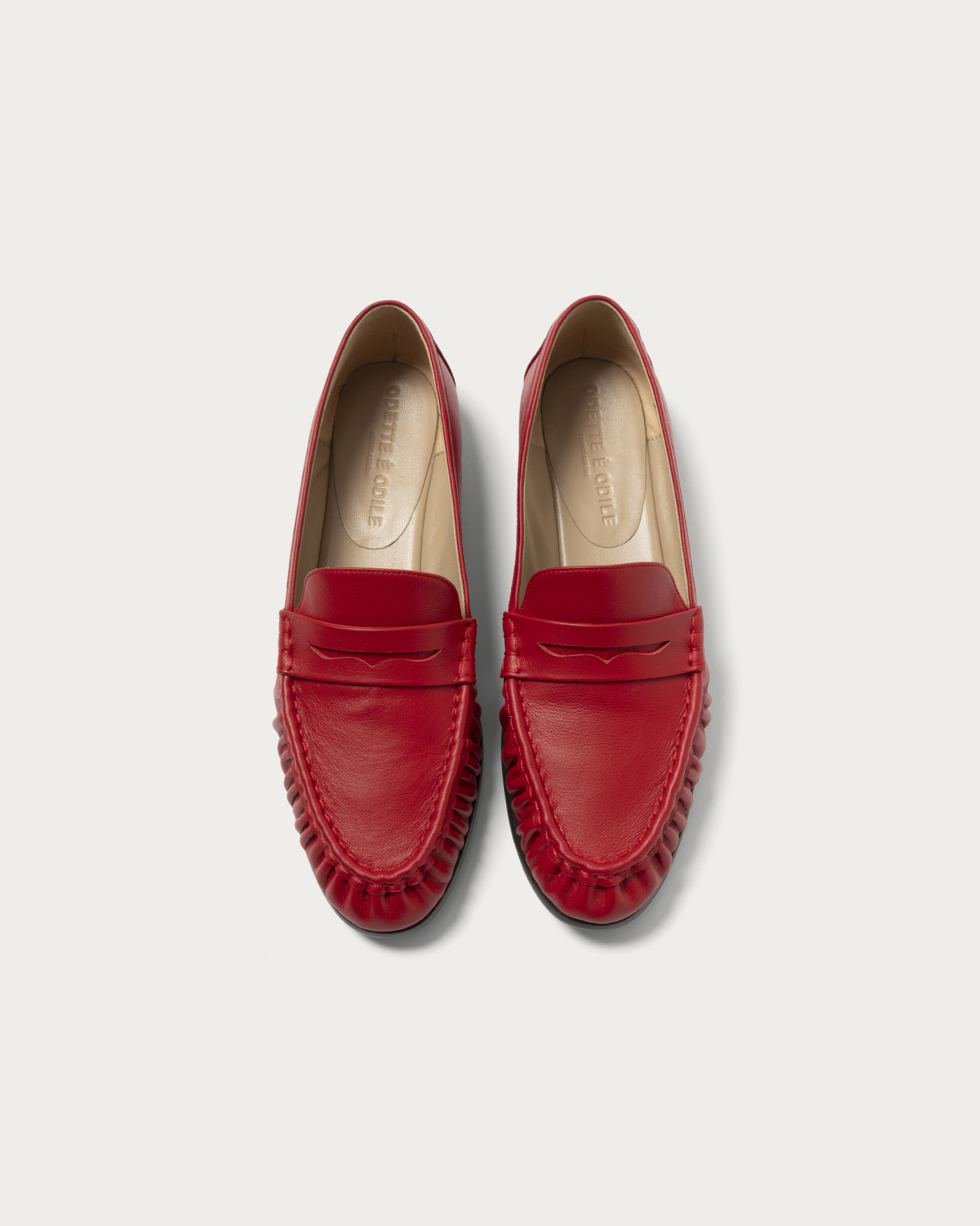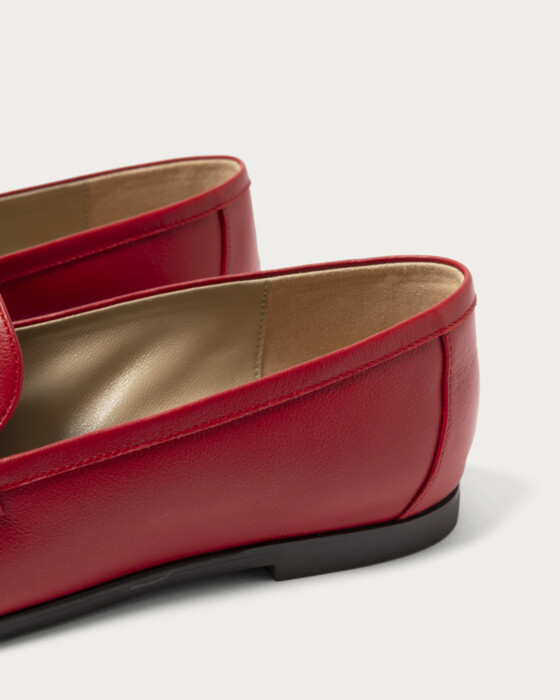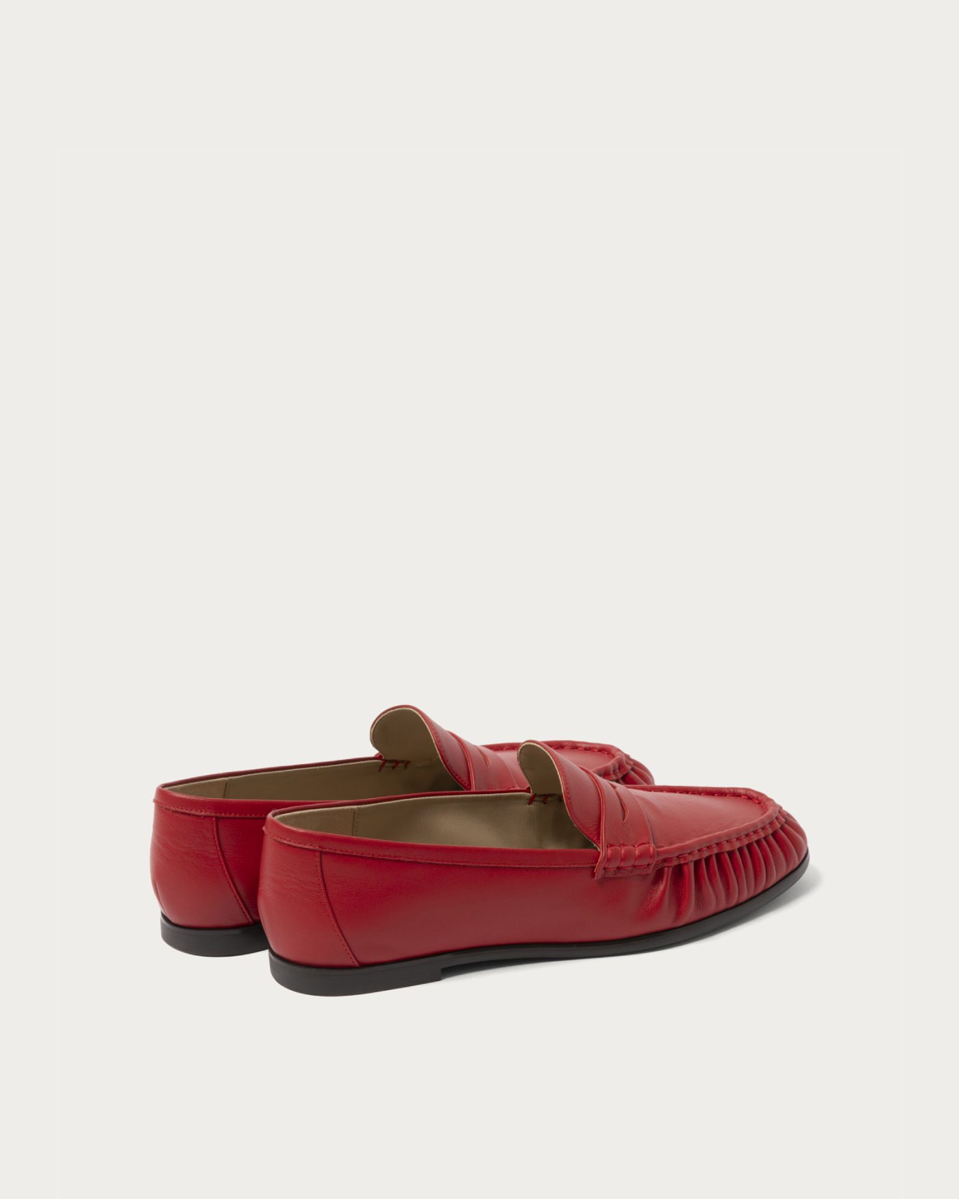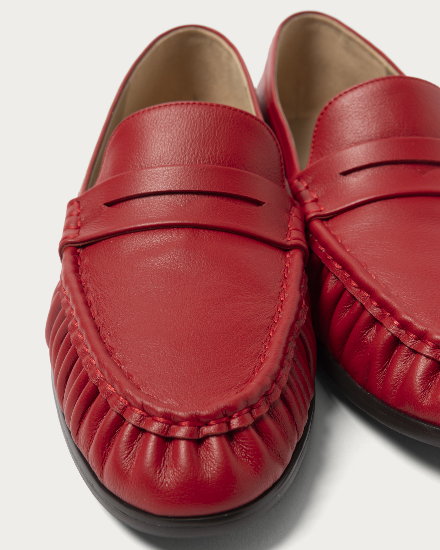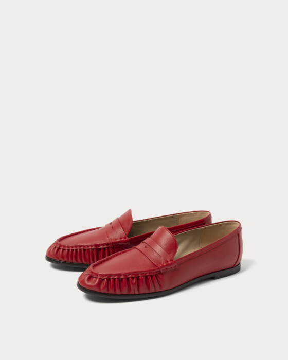 ハンドソーンでギャザーを寄せたモカシンは、足をやさしく包み込む柔らかなつくりで、歩くたびにしなやかに曲がる快適な履き心地。やや細めのトウラインがカジュアルな印象に程よく大人っぽさを添え、幅広いスタイリングに馴染む万能ローファーです。