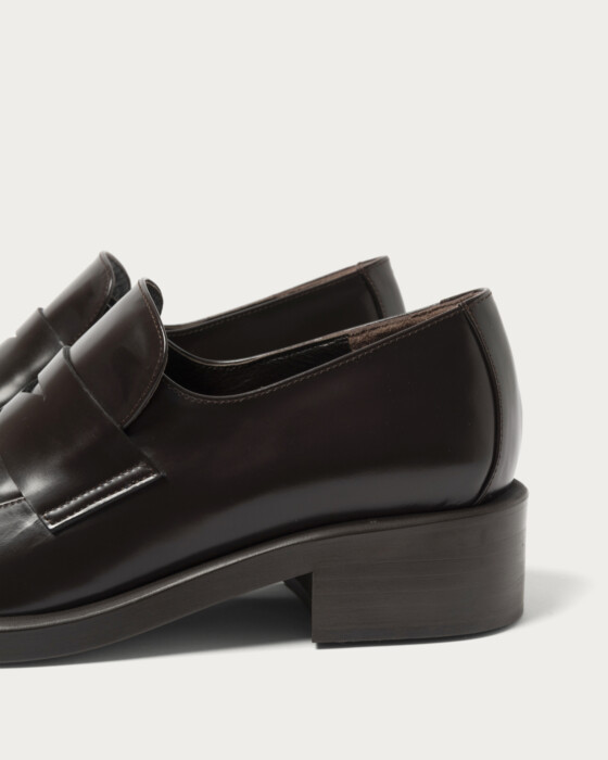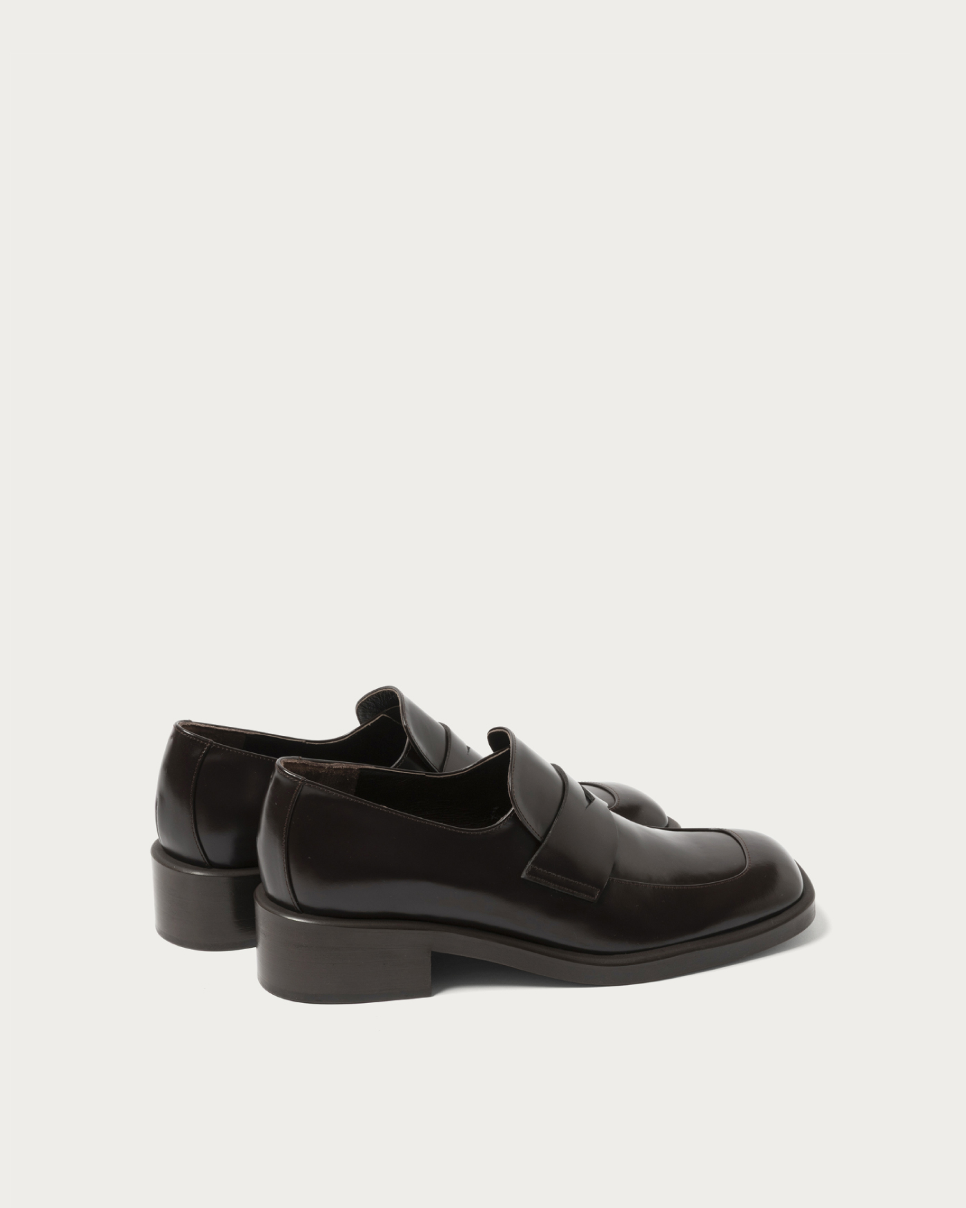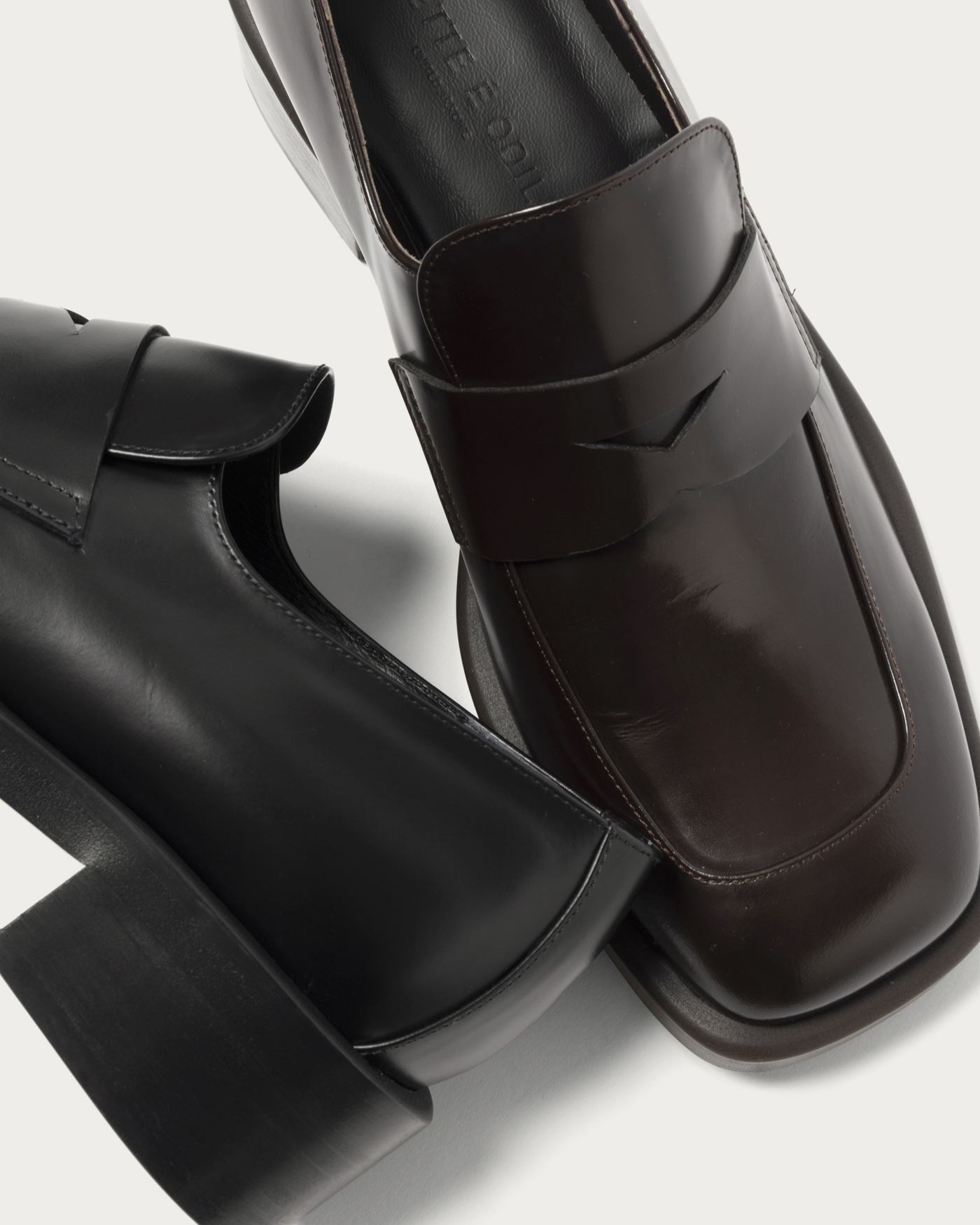 ほんのりオブリークなラインを効かせたワイドスクエアトウに、丸みを帯びた押縁が程よい柔らかさを添えるモードな一足。エッジを滑らかに仕上げたフォルムと上品な艶感が、足元に静かな存在感を与えます。ヒールアップでスタイル全体を引き締めつつ、隠しゴム入りの深めデザインで着脱もスムーズ。ショートボトムやジャケットとの春のモードスタイルにおすすめです。