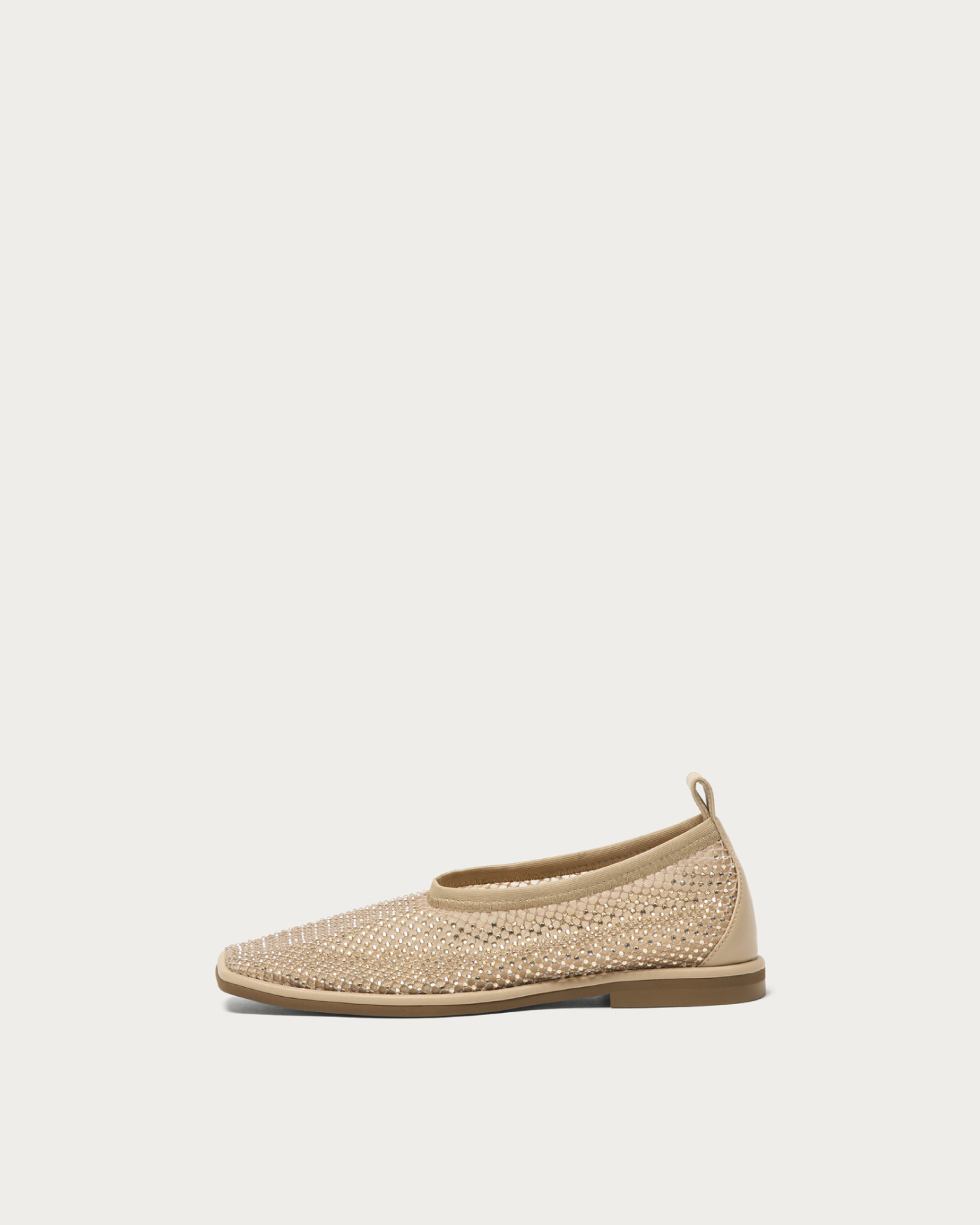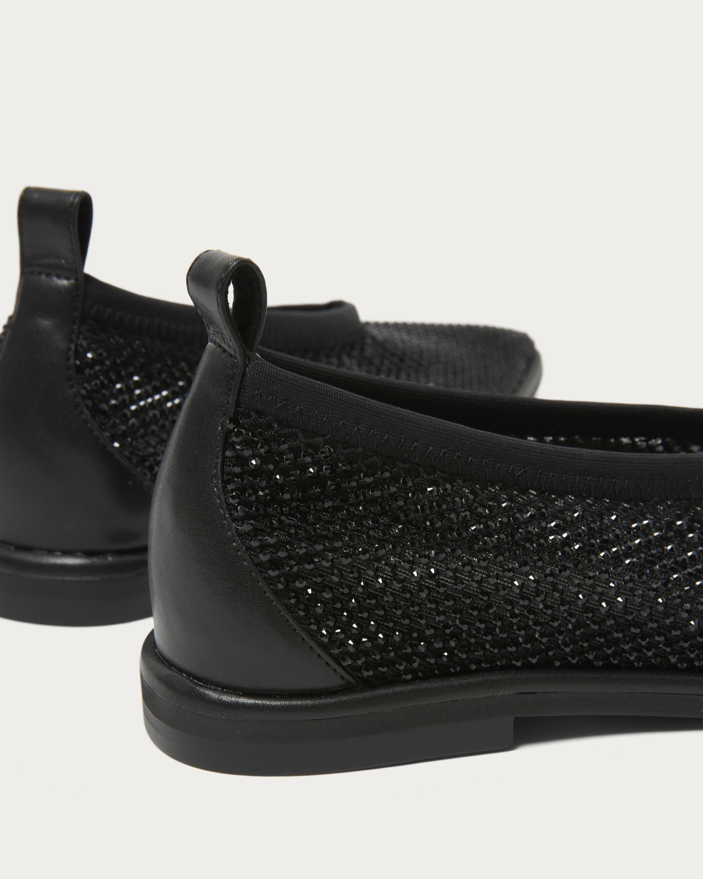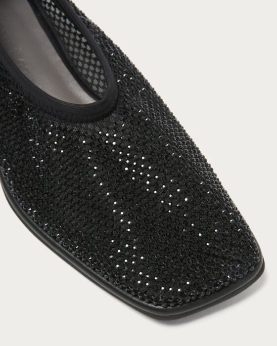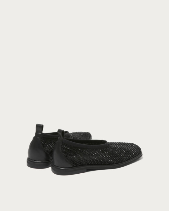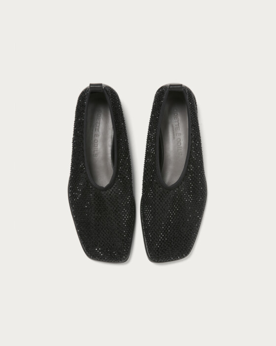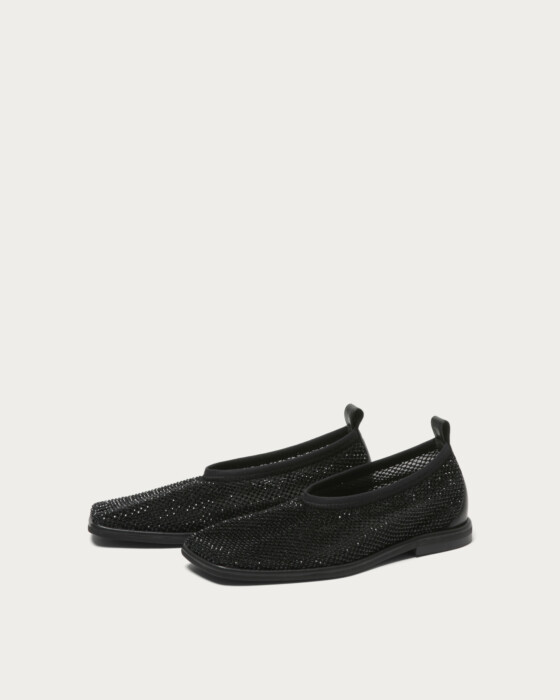 繊細なチュールに同系色のラインストーンを重ねた、奥行きのある輝きが魅力のカバードフラットシューズ。ネット素材を二重に重ねた柔らかな履き心地に加え、伸縮性のあるトップラインでそのまま着脱可能なストレスフリーな仕様です。足元に静かな煌めきを添えつつ、サテンやバルーンシルエットのボトムと合わせれば、モードなスタイリングに軽やかさを加える一足です。
