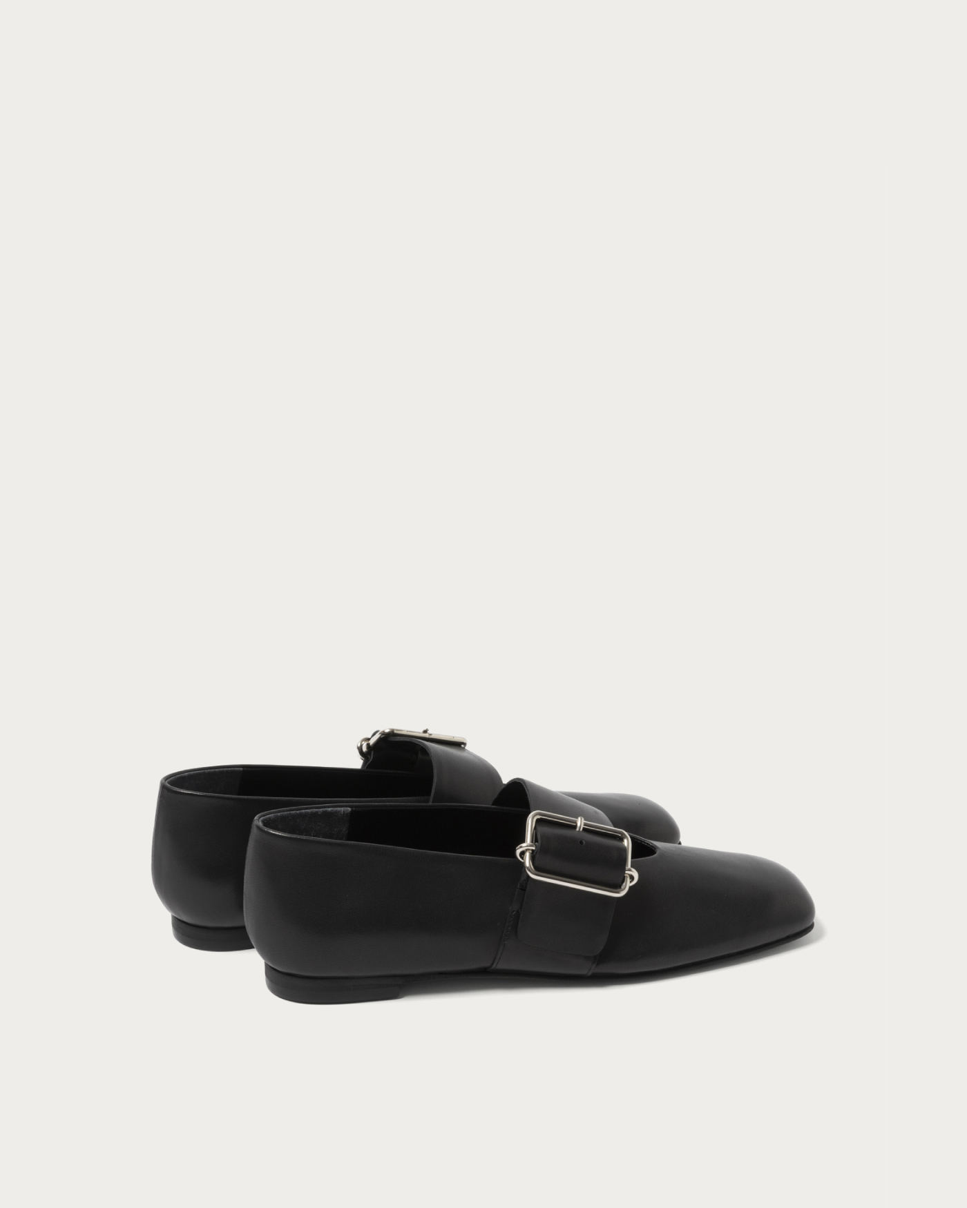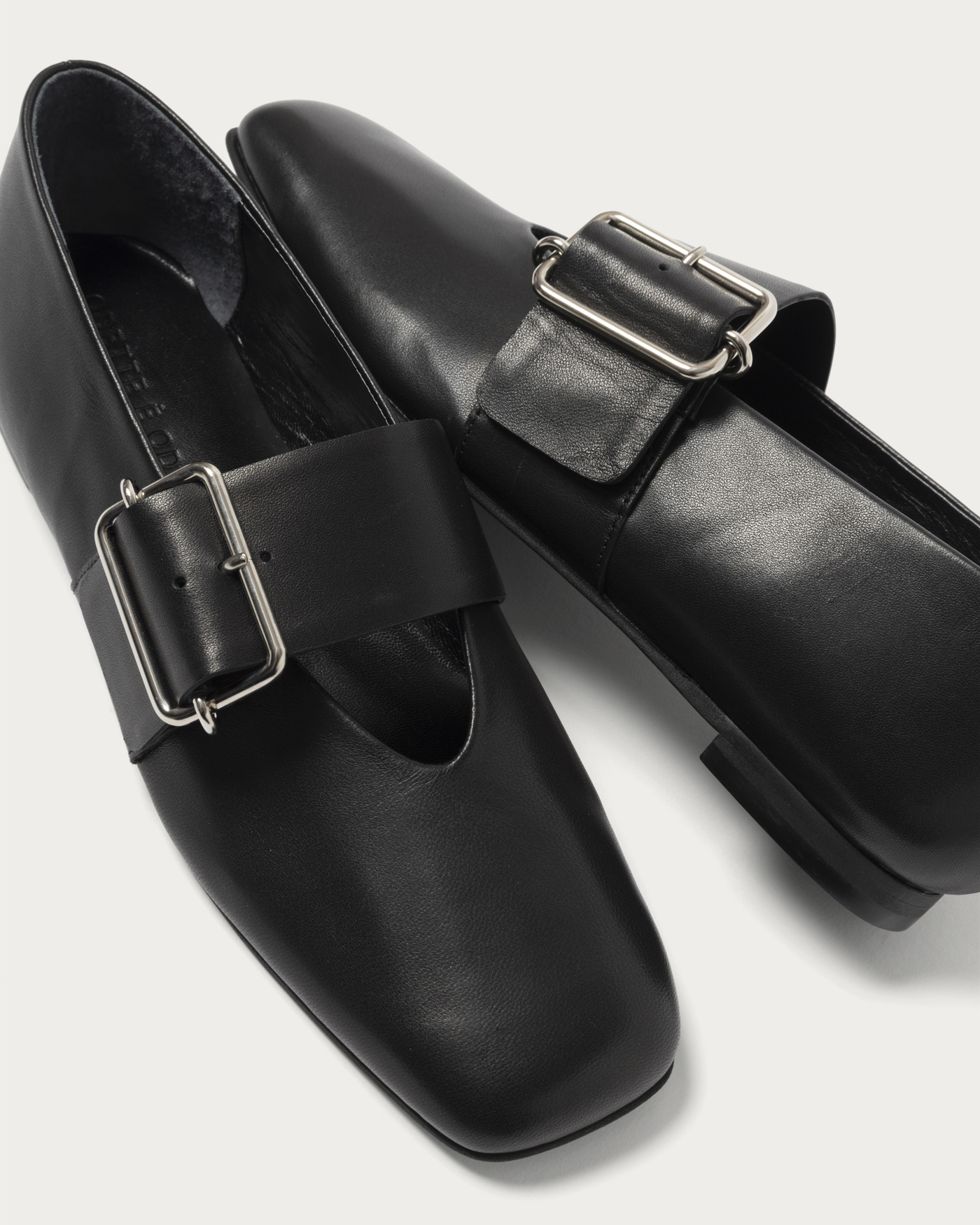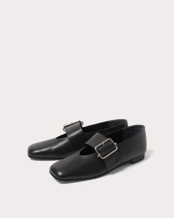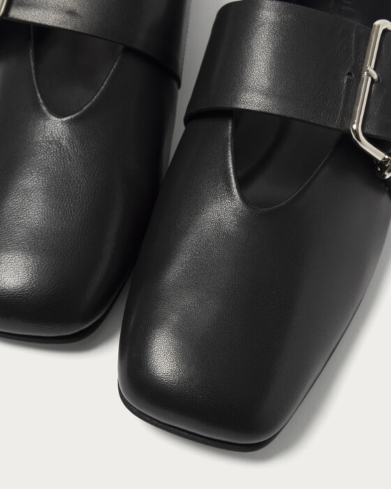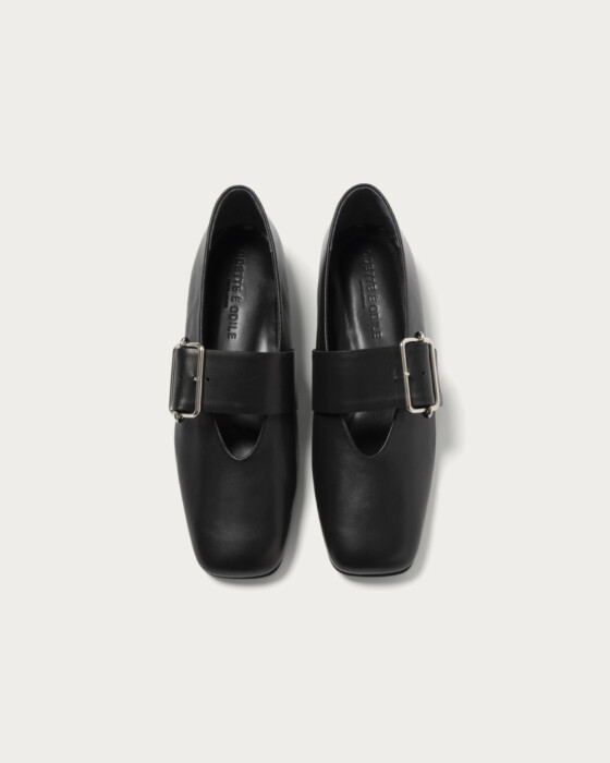 ニュークラシックシリーズから登場した、リラクシーな佇まいが魅力のフラットシューズ。切りっぱなしのワイドベルトに映える大ぶりなバックルが、抜け感を添えつつモードな装いのアクセントに。深めの履き口が足元を引き締め、隠しゴム仕様で着脱もスムーズ。しなやかで肌目の美しい素材感が、ミニマルなモノトーンスタイルに上品さを加える一足です。