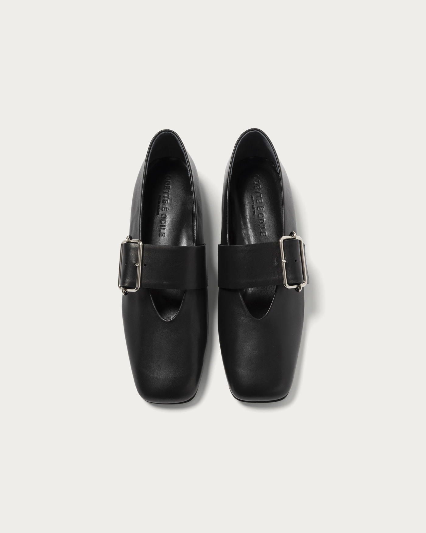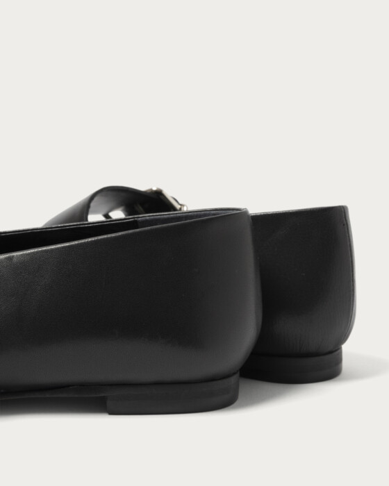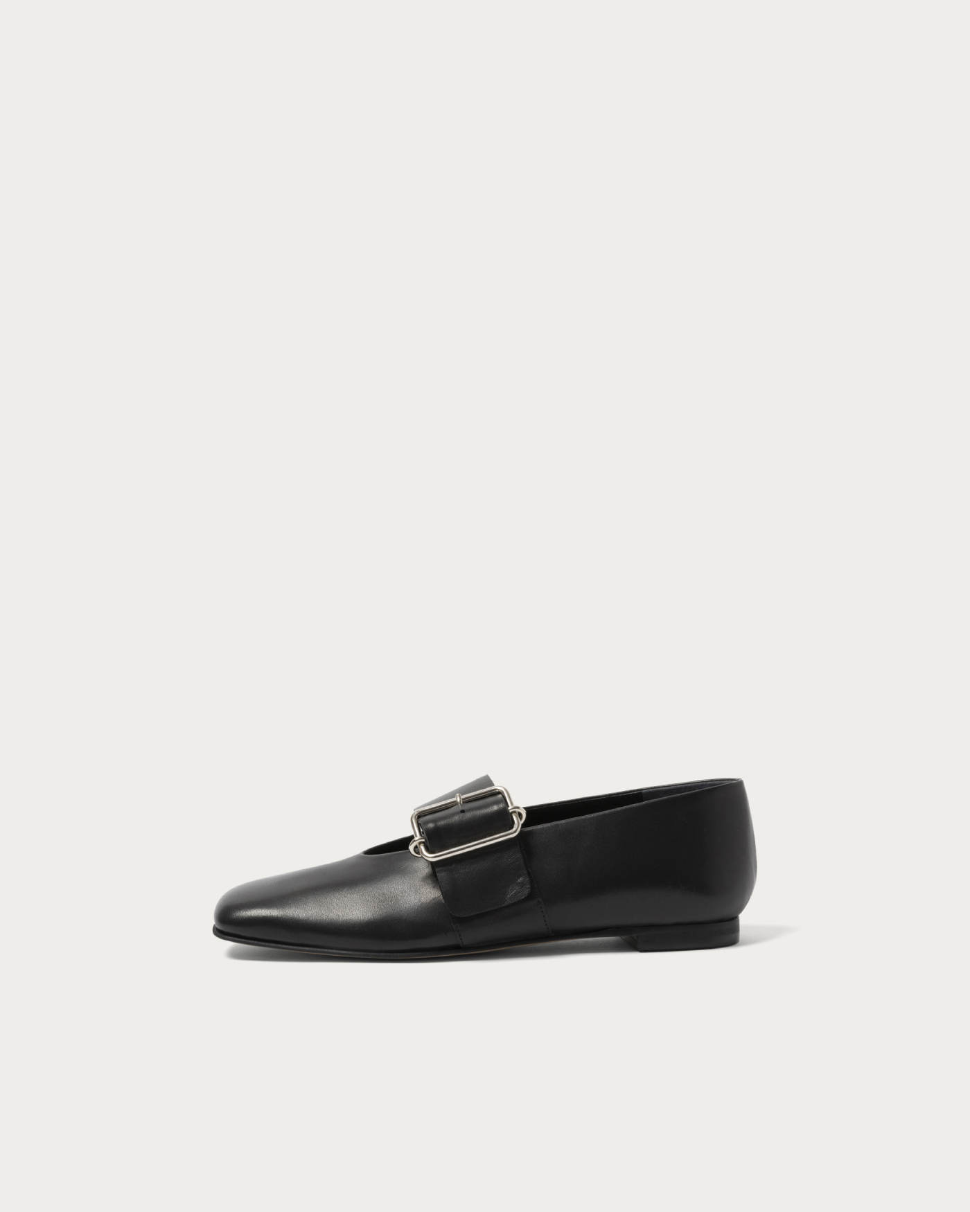 ニュークラシックシリーズから登場した、リラクシーな佇まいが魅力のフラットシューズ。切りっぱなしのワイドベルトに映える大ぶりなバックルが、抜け感を添えつつモードな装いのアクセントに。深めの履き口が足元を引き締め、隠しゴム仕様で着脱もスムーズ。しなやかで肌目の美しい素材感が、ミニマルなモノトーンスタイルに上品さを加える一足です。