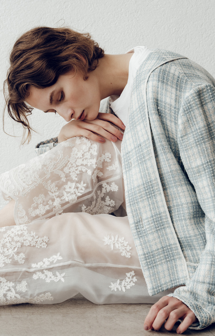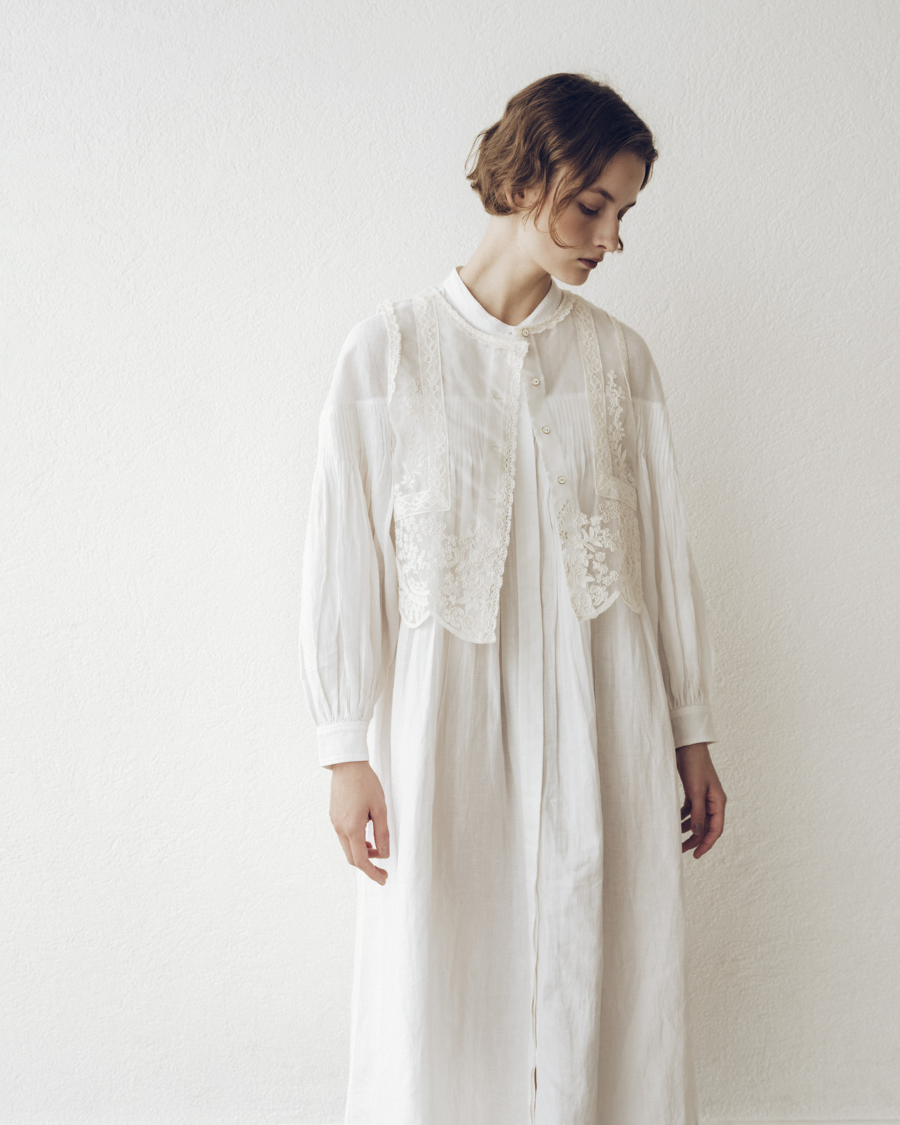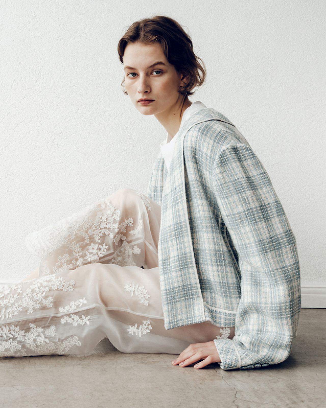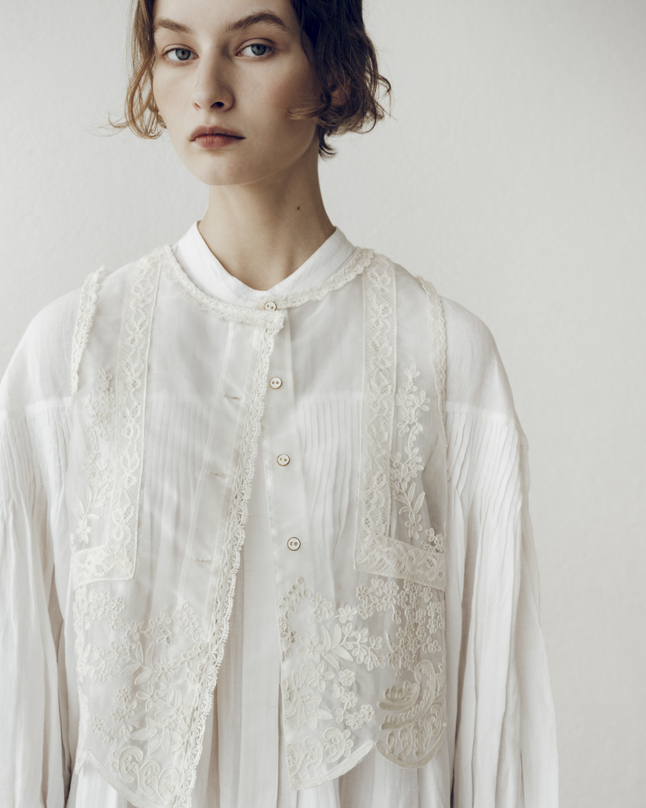 リサイクルポリエステルを混紡したウールや、オーガンジーに一針一針施した刺繍レース。