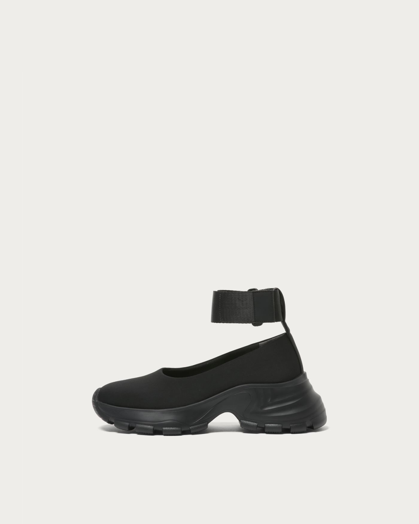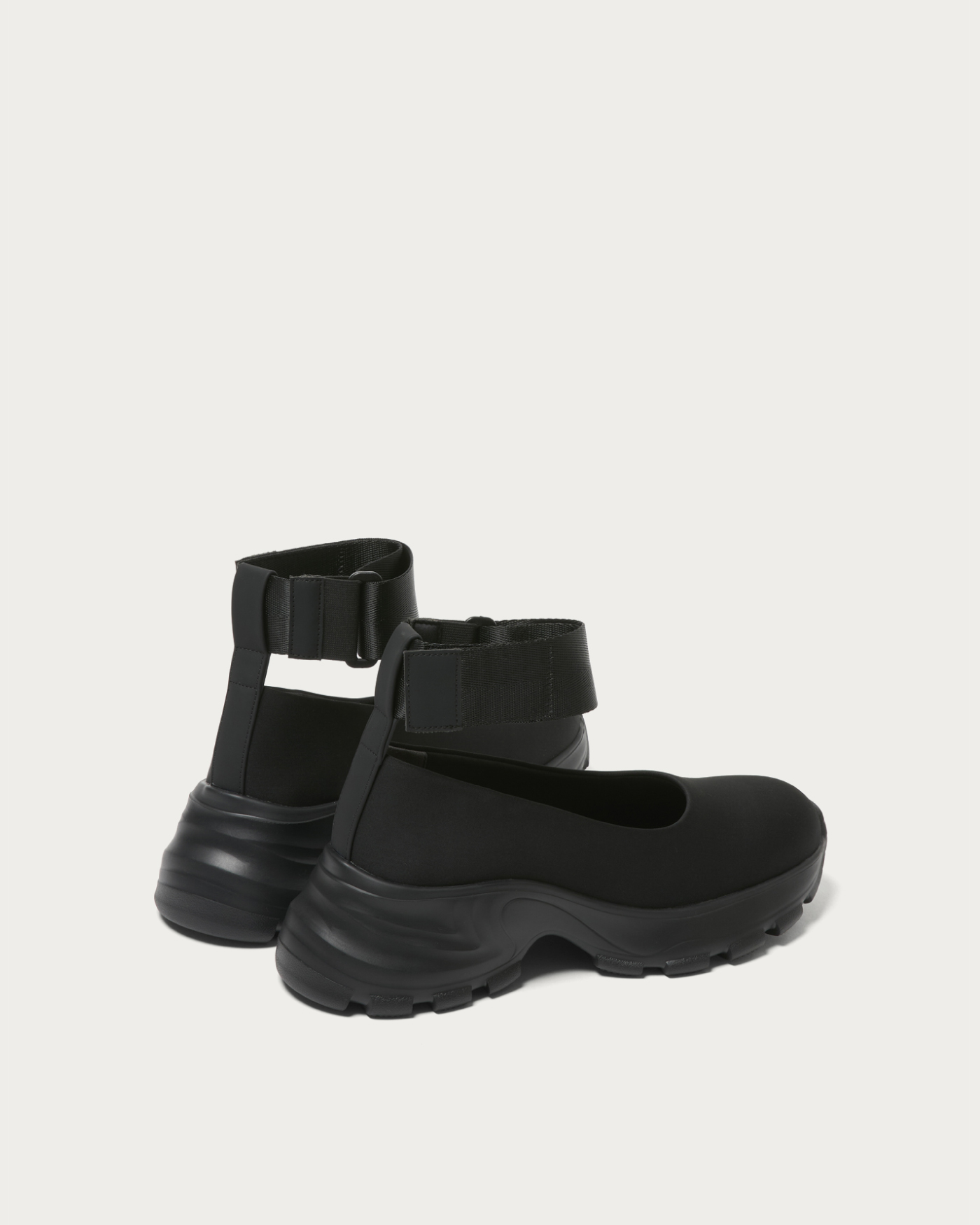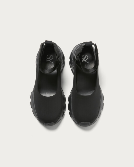 ネオプレーン素材×厚底ソールで仕上げた、ネックベルト付きのモードなフラットシューズ。カップインソールによるスニーカーライクな快適さと、ストリート感漂うシルエットが魅力。レースタイツやスポーツソックスと合わせて、スカートやワンピースに抜け感を添える足元を演出します。