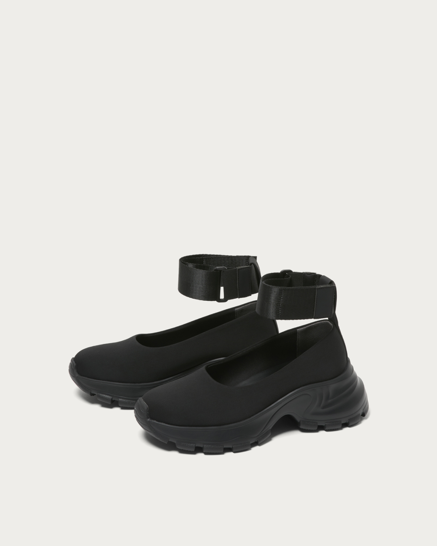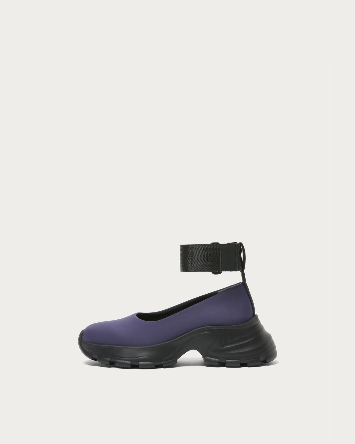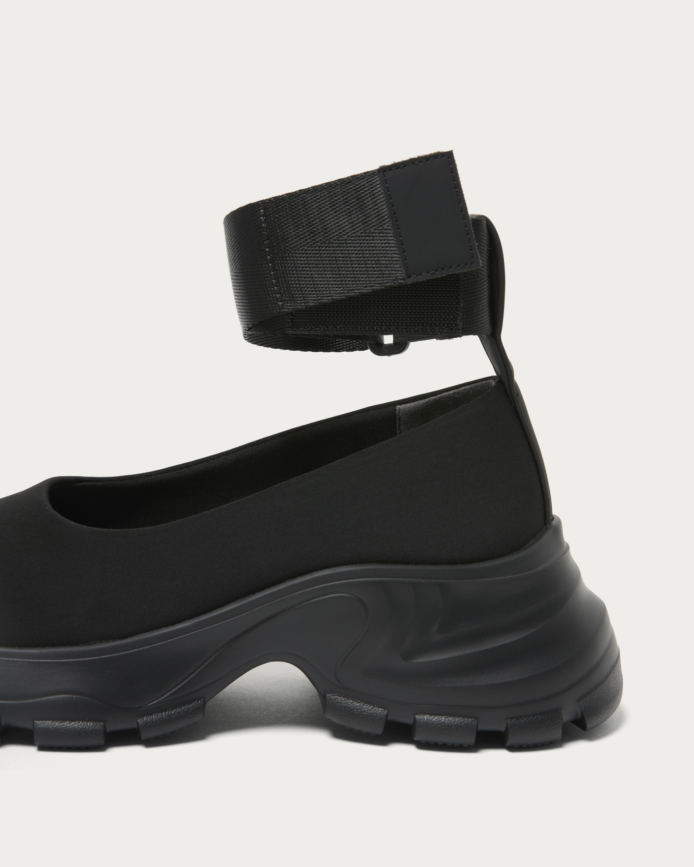 ネオプレーン素材×厚底ソールで仕上げた、ネックベルト付きのモードなフラットシューズ。カップインソールによるスニーカーライクな快適さと、ストリート感漂うシルエットが魅力。レースタイツやスポーツソックスと合わせて、スカートやワンピースに抜け感を添える足元を演出します。