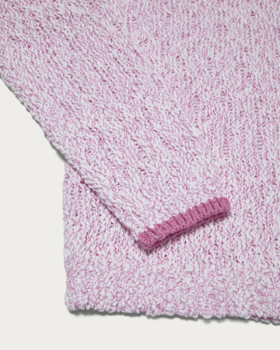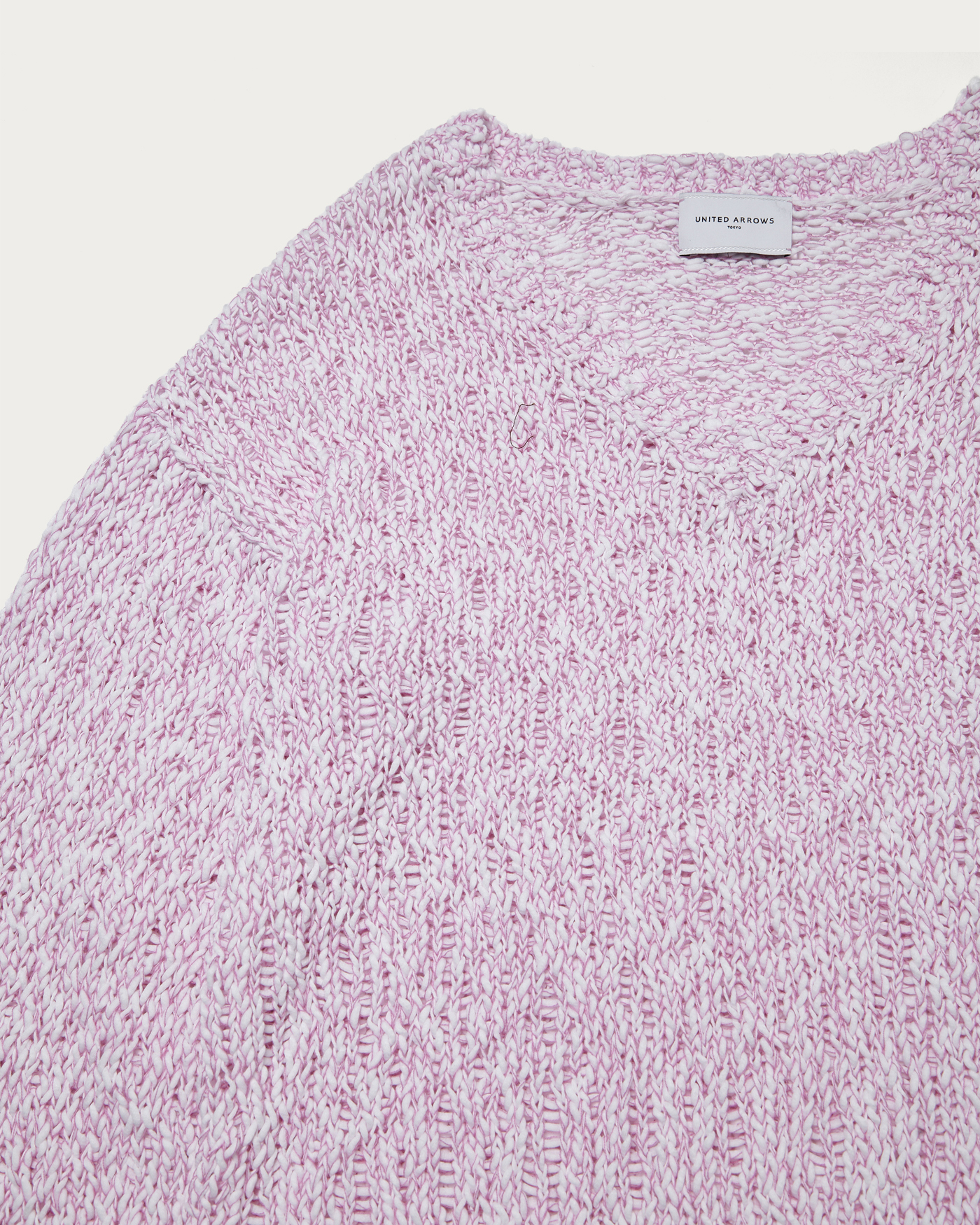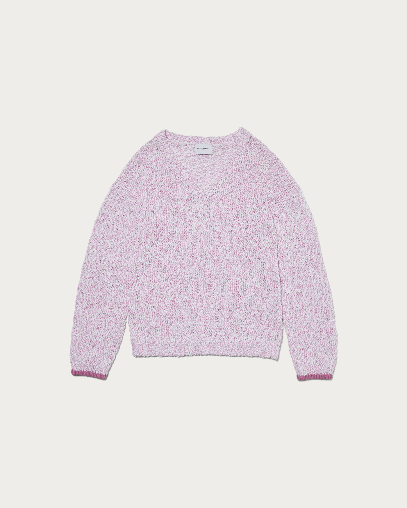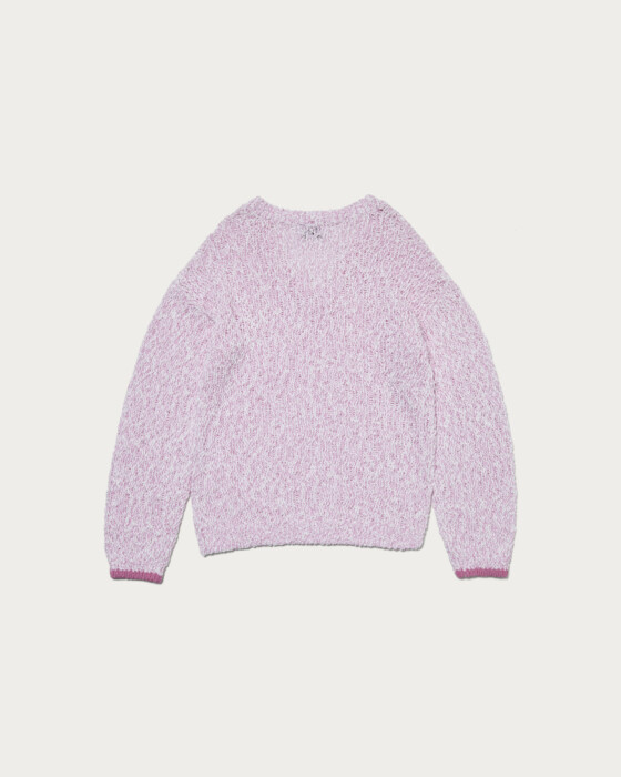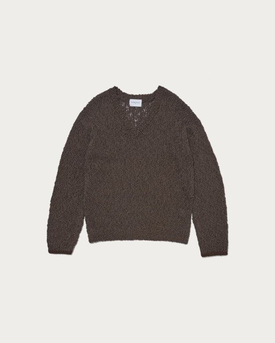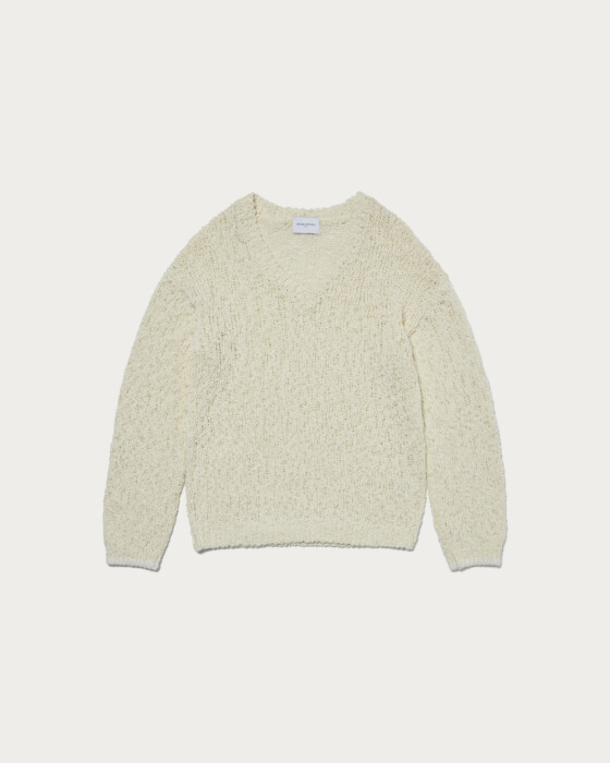 配色の糸が柄のように見え、シンプルなコーディネートにも映えるVネックニット。太めの糸がランダムでラフな印象ですが、上質な糸がもたらすリッチ感がポイント。一枚で着用できるように設定したVネックの深さですが、中にシャツや薄手のニットをレイヤードし、幅広いスタイリングを楽しんでいただくのもおすすめです。ベーシックなシルエットで着回し力の高い一着です。