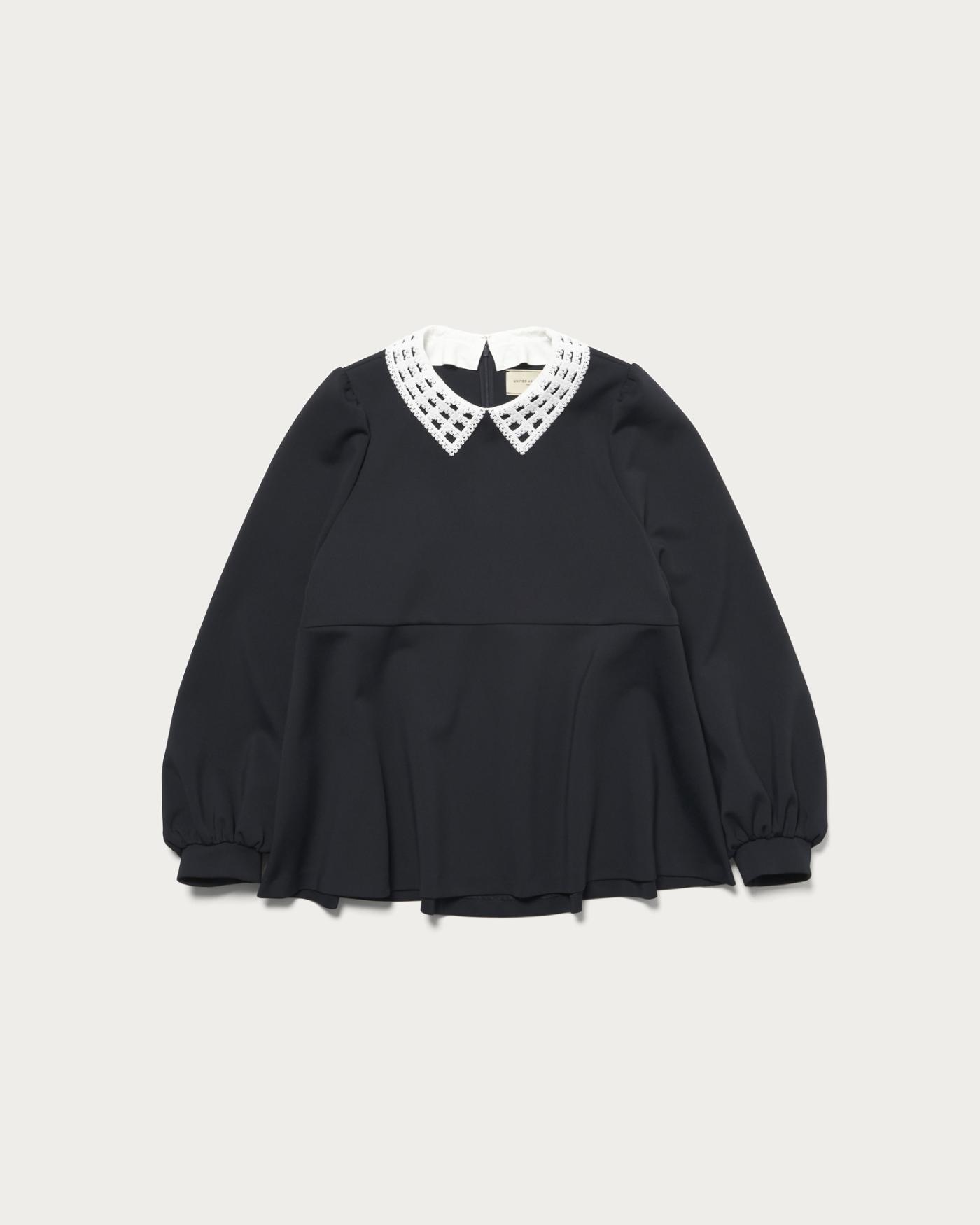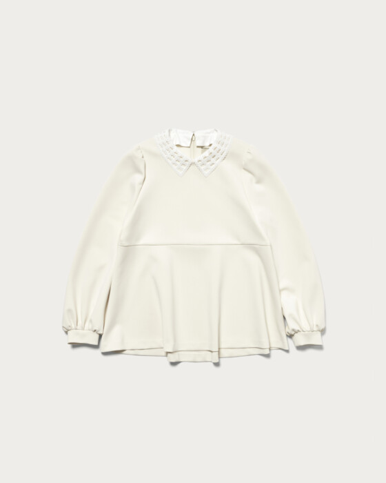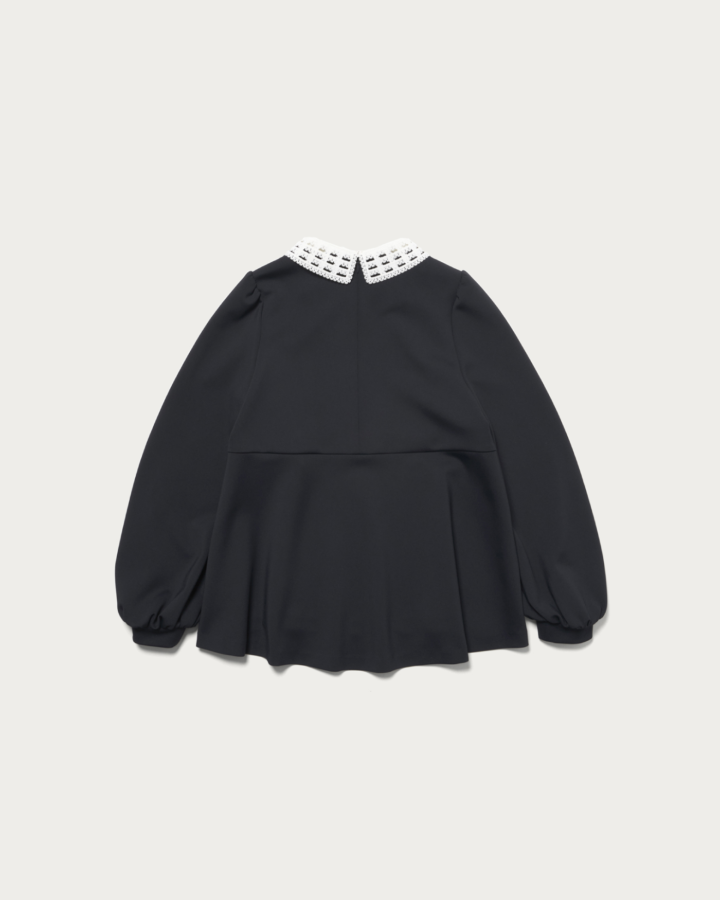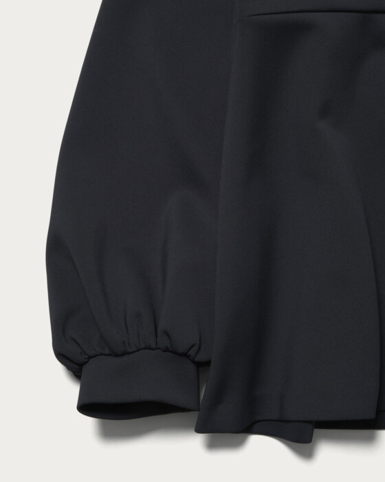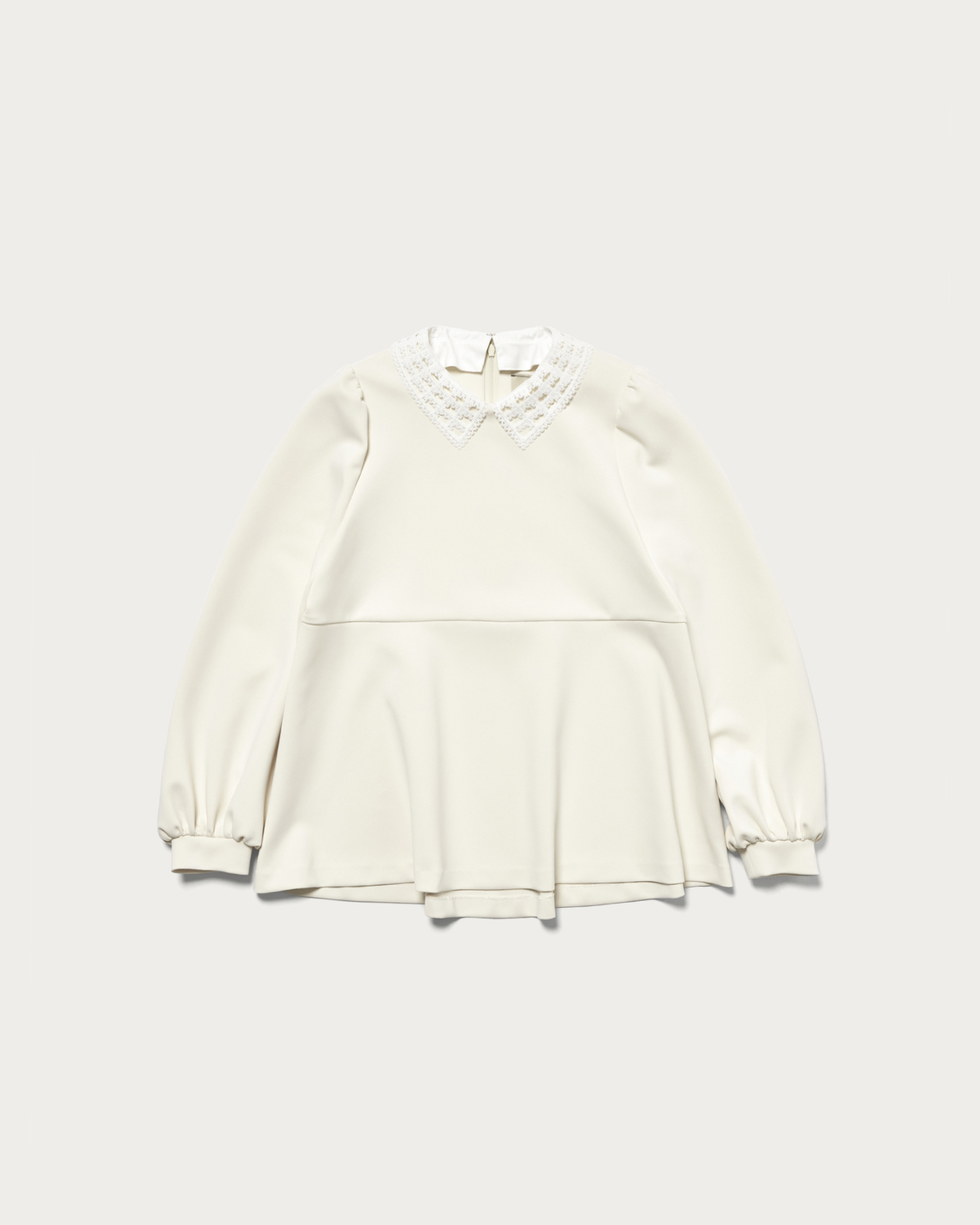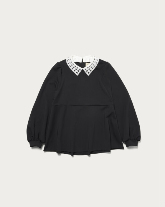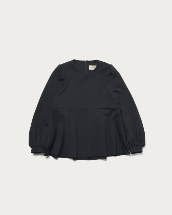 着用時にシワになりにくく、ストレッチがきいた着心地の良さが人気のSPONGYシリーズのブラウス。UVカットや吸水速乾、透け防止(白のみ)の嬉しい機能を備えた、幅広いシーンで活躍するアイテムです。取り外し可能な付け襟がポイントの一枚できまるブラウスは、アクセサリーなしでも華やかさを演出します。狭めの肩幅から膨らむパフスリーブと、前後で着丈に差をつけたぺプラムシルエットが女性らしさを引き立てる一着です。