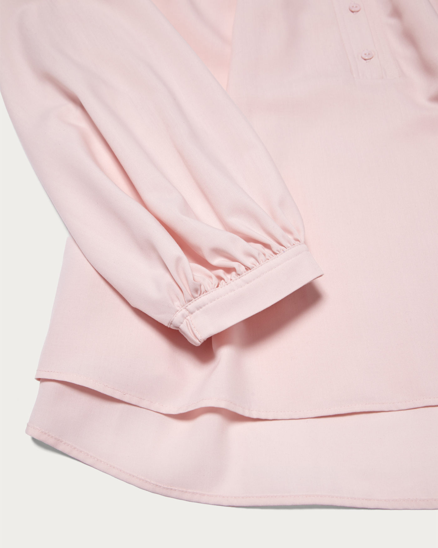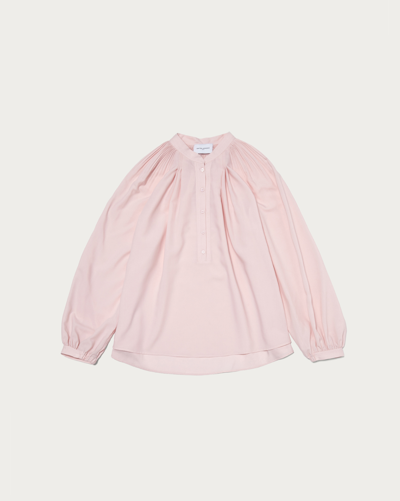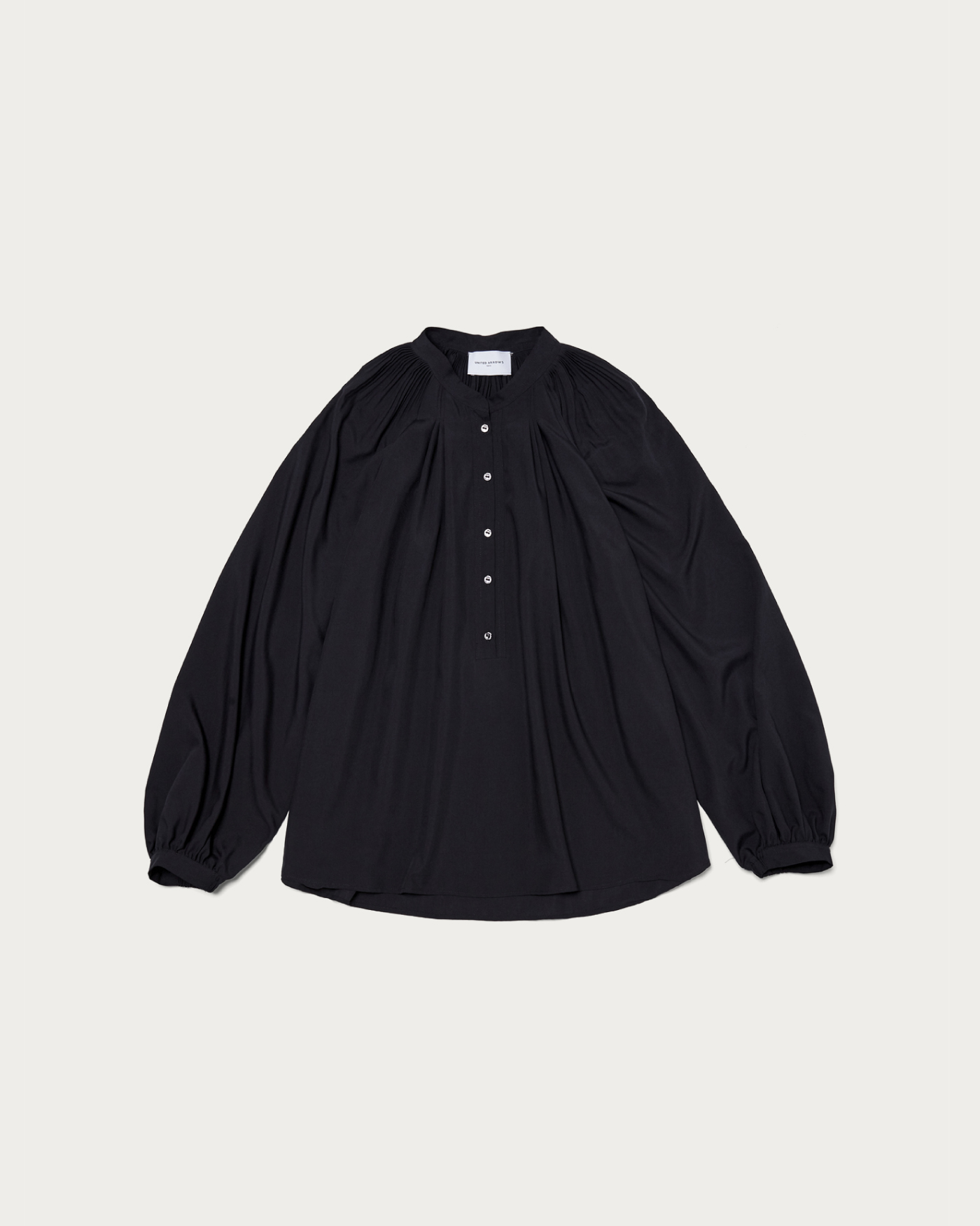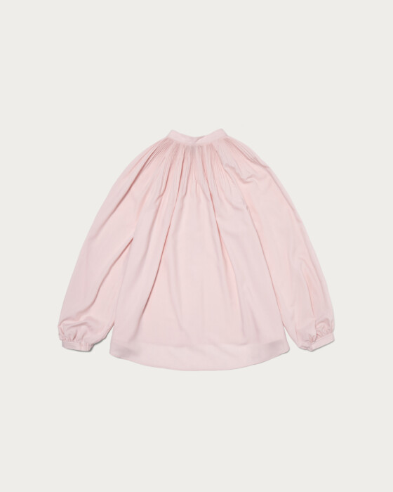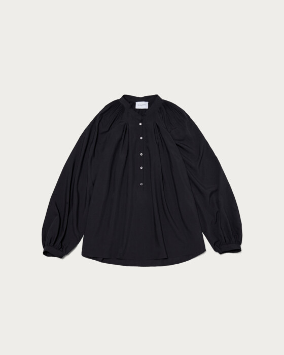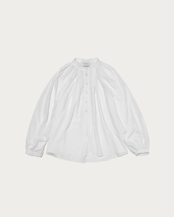 細やかなプリーツから広がるフレアシルエットが美しいボリュームブラウス。ボリュームがありながらもしなやかなでおさまりよく、襟はバンドカラーできちんとした印象にきまります。細身のテーパードパンツと合わせたお仕事スタイルがおすすめ。ボタンを外しヘンリーネックのように抜け感ある着こなしも可能です。