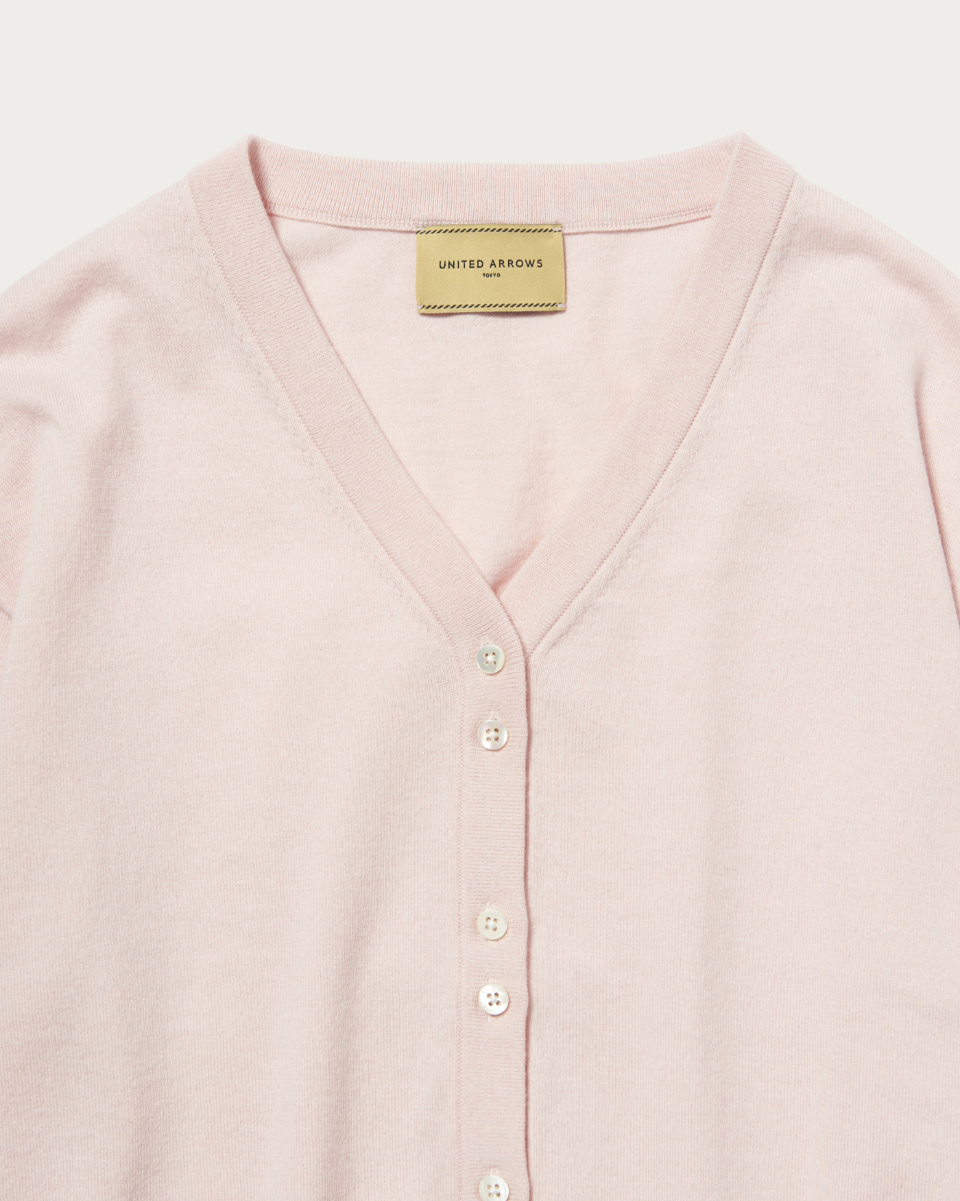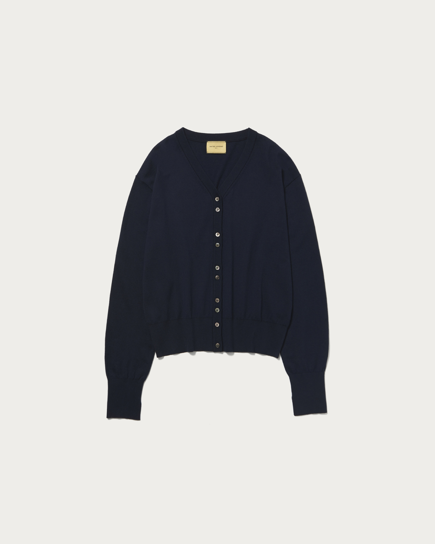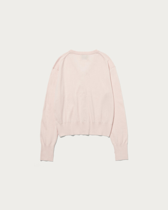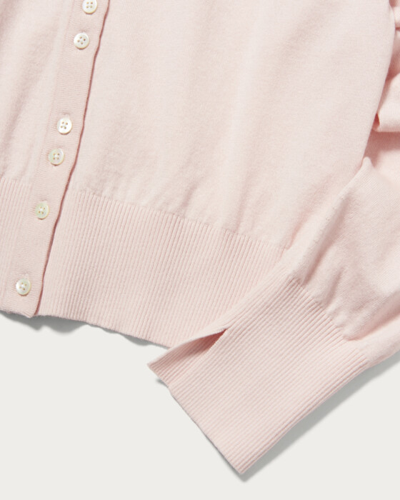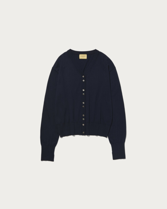 程よくゆとりのあるシンプルなVネックカーディガン。一見シンプルなVネックカーディガンですが、小さいボタンを2個ずつ寄せてつけることでシンプルながらもさりげないアクセントに。シャツやブラウスを重ねても、前ボタンを留めて一枚着としても着用できる汎用性の高い一着です。